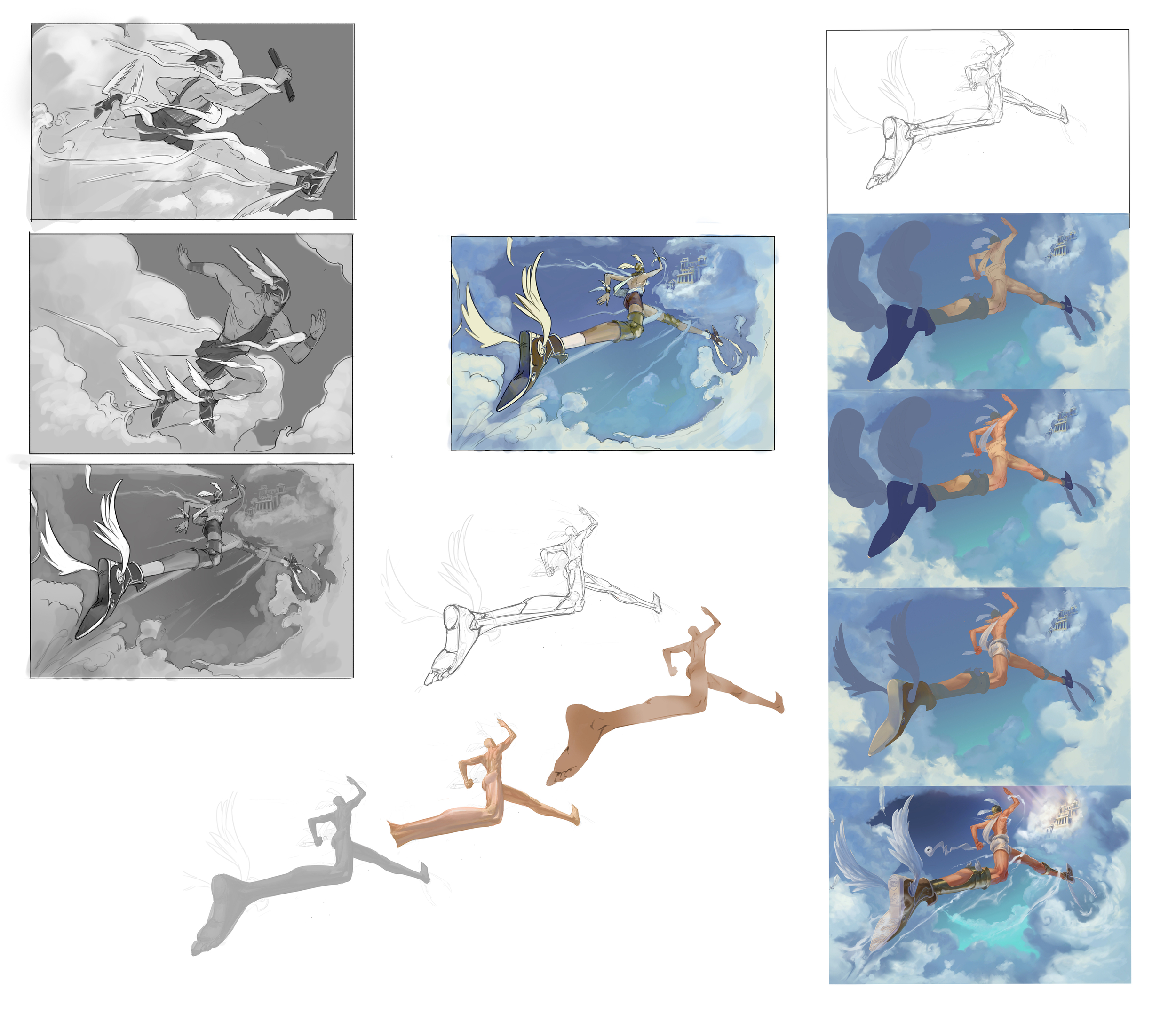 Salut à tous, je n'avais pas montré mon process tout le long du challenge alors je l'envoie maintenant : J'ai commencé par un sketch rapide pour travailler la pose et la compo : Ensuite, j'ai commencé à rajouter les valeurs : Mon process n'étant pas encore trop développé pour le moment, j'ai attendu trop longtemps avant de mettre de la couleur je crois. ça m'a fait perdre beaucoup de temps car mes valeurs n'étaient pas assez précises : Pour la suite, j'ai unifié le tout en "déplaçant " toutes les couleurs vers le bleu de l'environnement : Après ça j'ai ajouté quelques highlights et beaucoup de détails :1 point