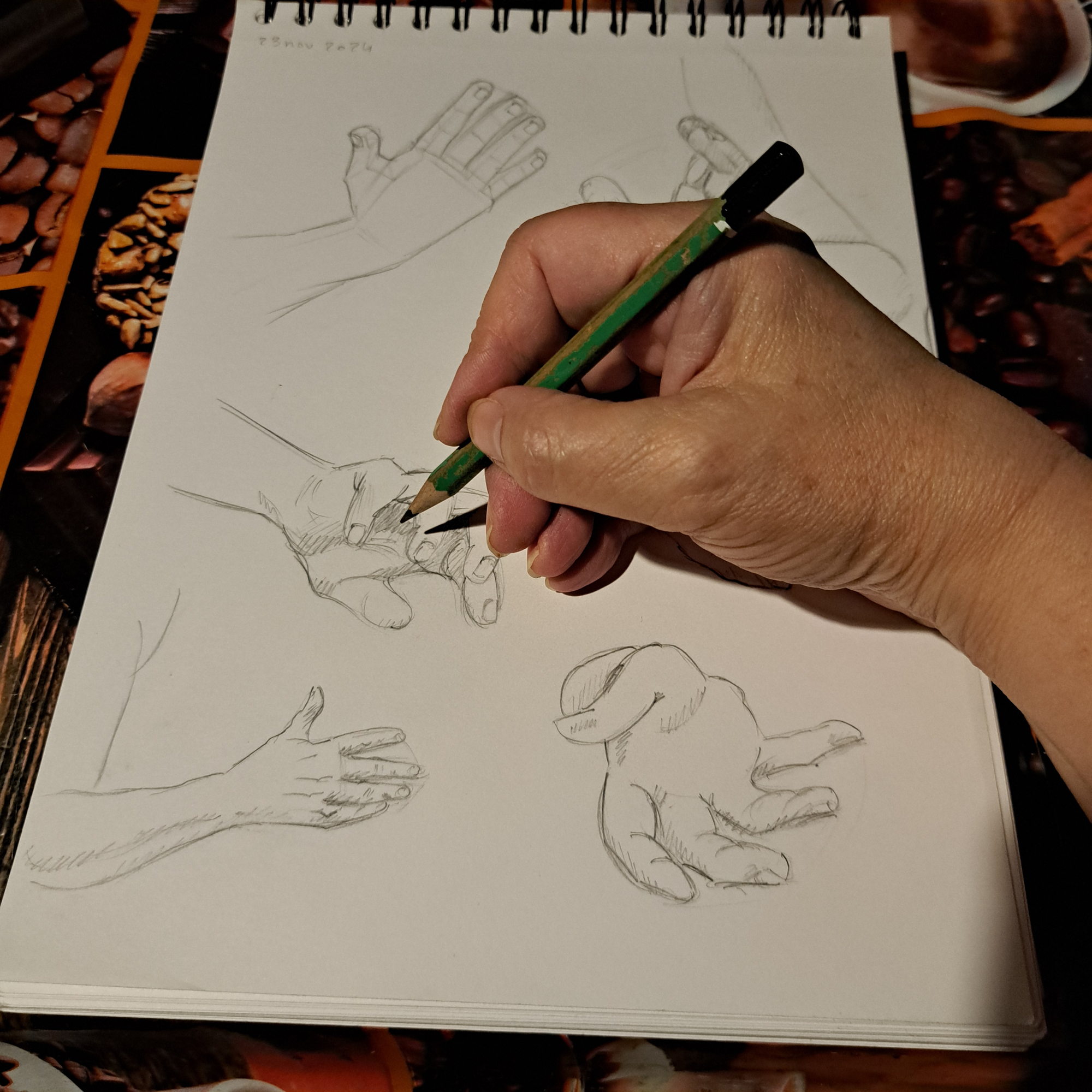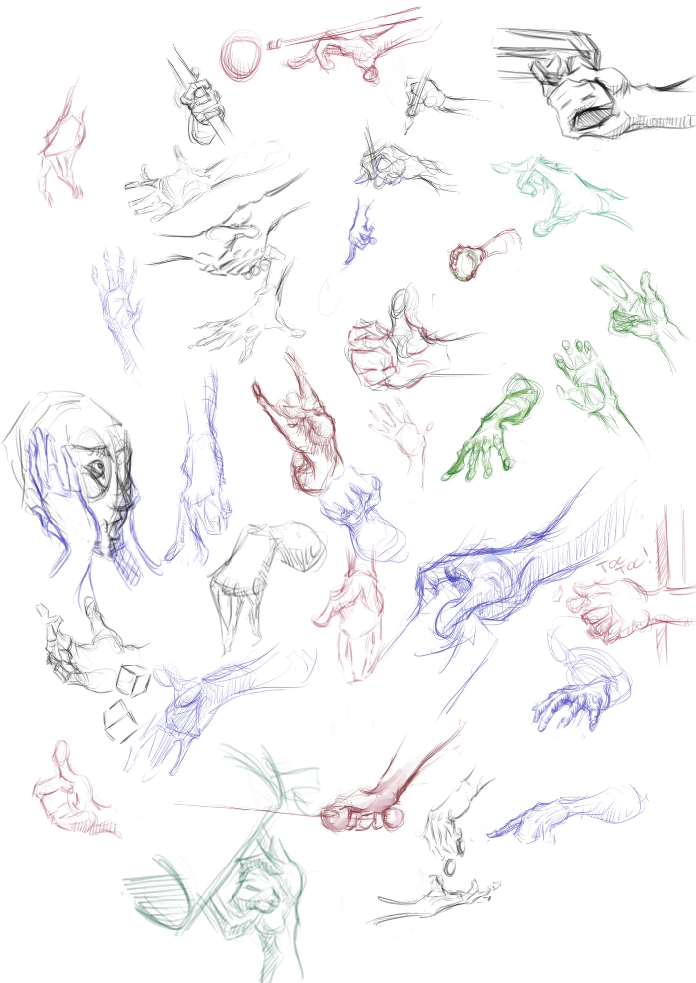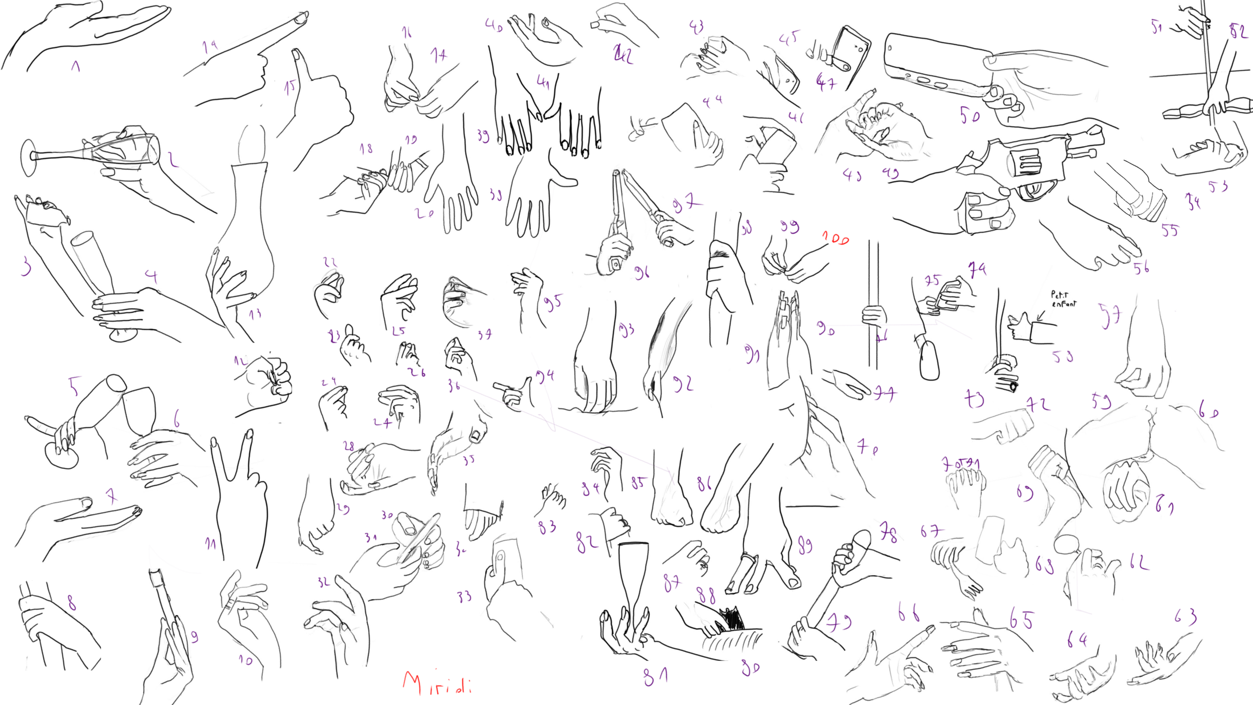 Je n'ai réussi à faire que 38 mains (en comptant les paires) mais je n'ai vu le challenge qu'assez tard dans le mois. J'ai demandé aux copains de prendrre des poses de mains que j'ai prises en photo (58 photos !), je n'ai donc utilisé aucune autre refs. Je n'ai pas eu le temps de toutes les dessiner, et en plus, certaines étaient trop floues, mais ça m'a donné pas mal de matière. Dommage que j'aie surtout des mains droites et que je ne les au pas prises sous des angles un peu plus originaux. La derrnière planche date du 29 novembre. Même pas eu le temps de dessiner ma propre main en tran de dessiner !2 points