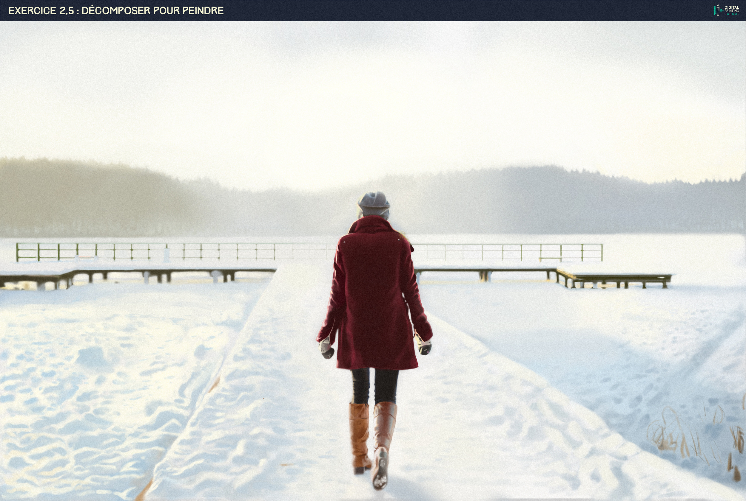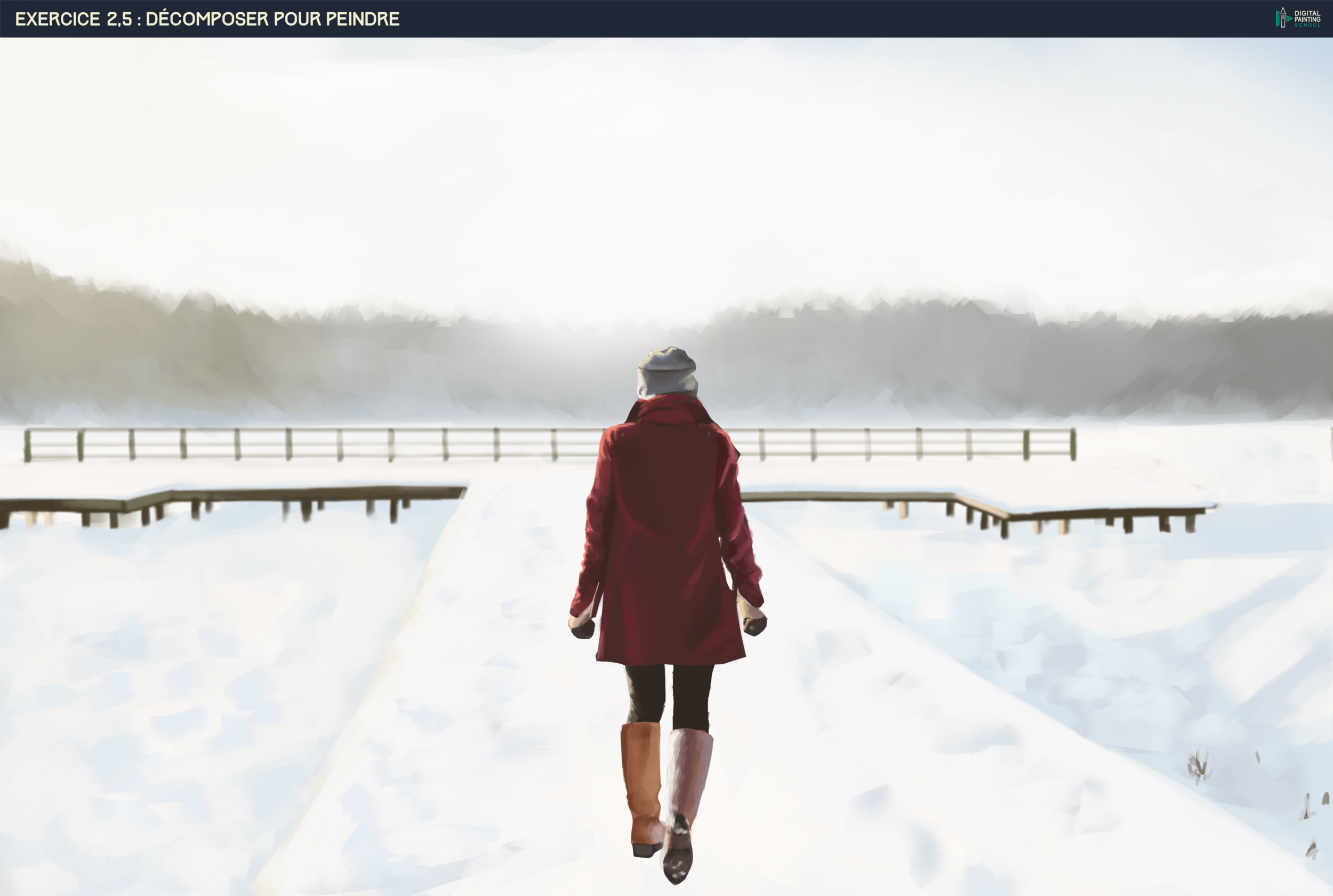 Hello ! T'inquiète pas, pas besoin de refaire l'exo 2, sauf si tu y tiens vraiment ! Du moment que tu gardes tout ça en tête et que tu réapplique ce que tu apprends sur les exos, c'est top 🙂 Pour le 2.5 : Vraiment pas mal ! C'est vrai que tu t'es pas facilitée la vie en faisant tout sur un seul et même calque ! Garder au moins la perso sur un calque séparé permet de mieux travailler les flous du fond sans baver dessus 🙂 Mais yes les flous du fond son trop fort et on perd beaucoup la silhouette des arbres ! Aussi on sent pas la lumire chaude qui vient de derrière les arbres au milieu ! La barrière la plus éloignée est trop épaisse et tremblante La barrière la plus proche tremble un peu aussi Au niveau de la perso : Ses bords sont trop flous La lumière qui se pose sur la gauche de son bras, son épaule, son bonnet et sa botte droite devrait bien plus forte ! Et il me semble que sa tête est un petit peu trop grosse ! Hésite pas aussi à reproduire les formes les plus simples comme cette ombre dans la neige : Néanmoins ça reste du bon boulot pour un premier painting fini ! Bravo 😄1 point