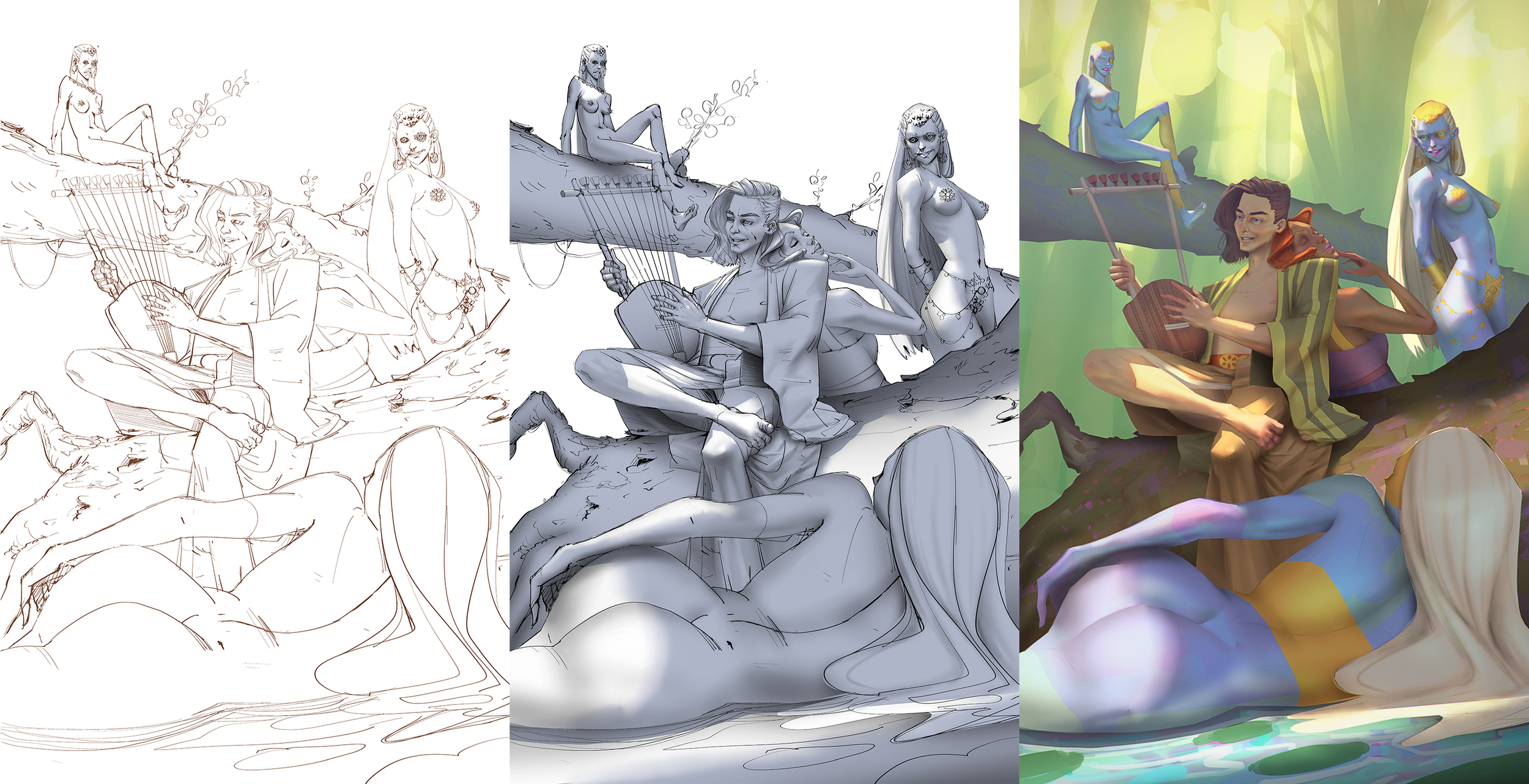 Work in progress d'une illu sur Orphée et Eurydice entourés par les nymphes. Ils sont paisibles mais les nymphes guettent le musicien. Il manque encore beaucoup de choses (le 1er plan, végétation, bijoux des nymphes, détails...) et encore beaucoup de retake sur les visages, mains et plein de truc, mais ça avance gentiment.1 point