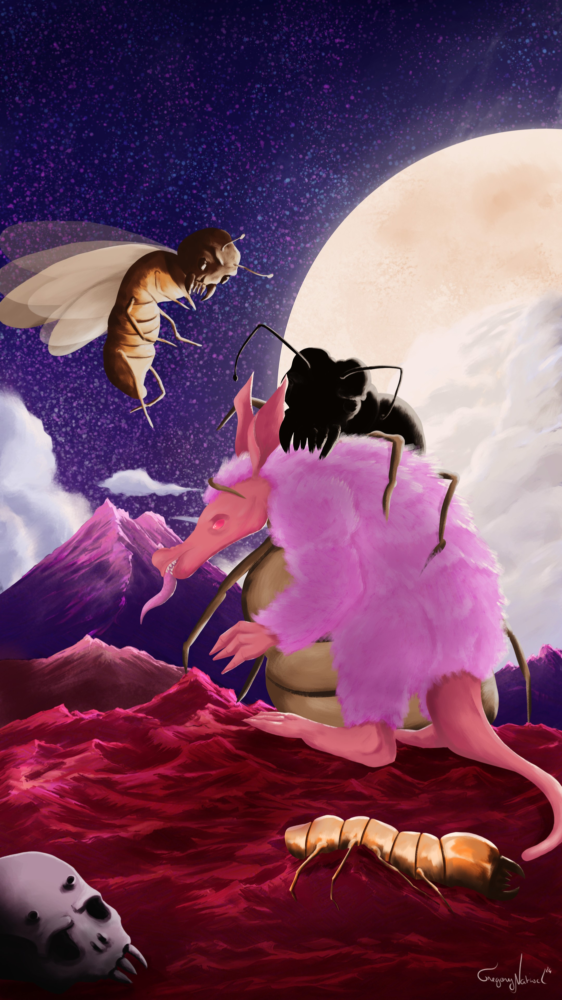 Voici mon petit monstre! J'ai adoré le faire, même si j'y ai passé plusieurs heures, le fait d'avoir un pas à pas m'a permis de comprendre énormément de choses sur les jeux d'ombre et de lumière, de savoir ou et comment les poser et de jouer encore un peu plus avec les différents brushes. J'avais besoin de ça avant de revenir sur la fleurs car j'ai perdu plusieurs heures de travail dûe à une fausse manip 😒1 point