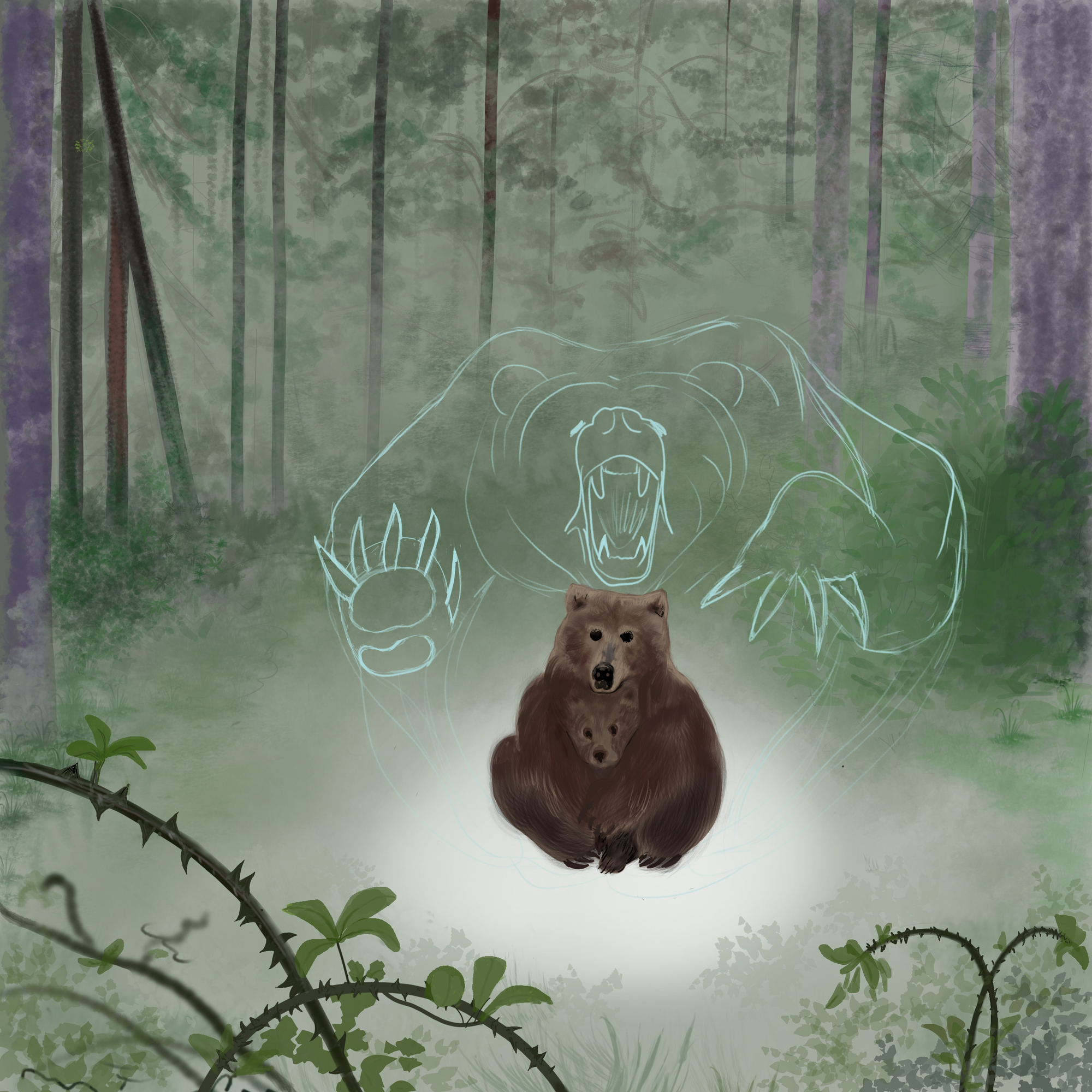 hello there ! Voilà je me lance vv J'ai pris en main tablette et logiciel avec des petits monstres du pas à pas de spartan que j'avais trouvé sur youtube. J'ai commencé dans la foulée le chapitre zero, et commencé ce DP. J'y est passé un certain temps 😅 (du coup j'ai pas mal avancé dans le chap1 pour alterner vv) Je ne suis pas contente de mes perso ours/ourson centraux, clairement pas les skills pour m'en sortir...de même pour l'aura de l'ours énervé, j'ai quelque chose en tête que je n'arrive pas à concrétiser, je l'ai laissé à l'état de croquis amélioré. Du coup je n'ai pas réalisé les lumières émanant de lui sur les "vrais ours" et le paysage. C'est quelque chose que j'aimerais savoir faire à la fin de la formation 🍀2 points