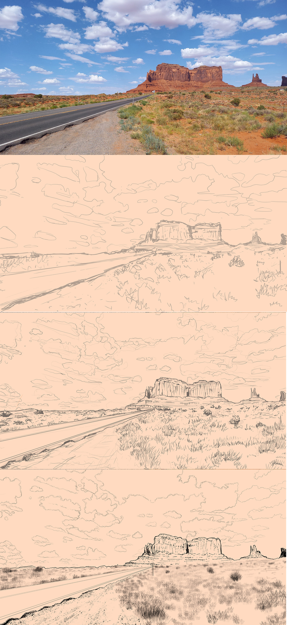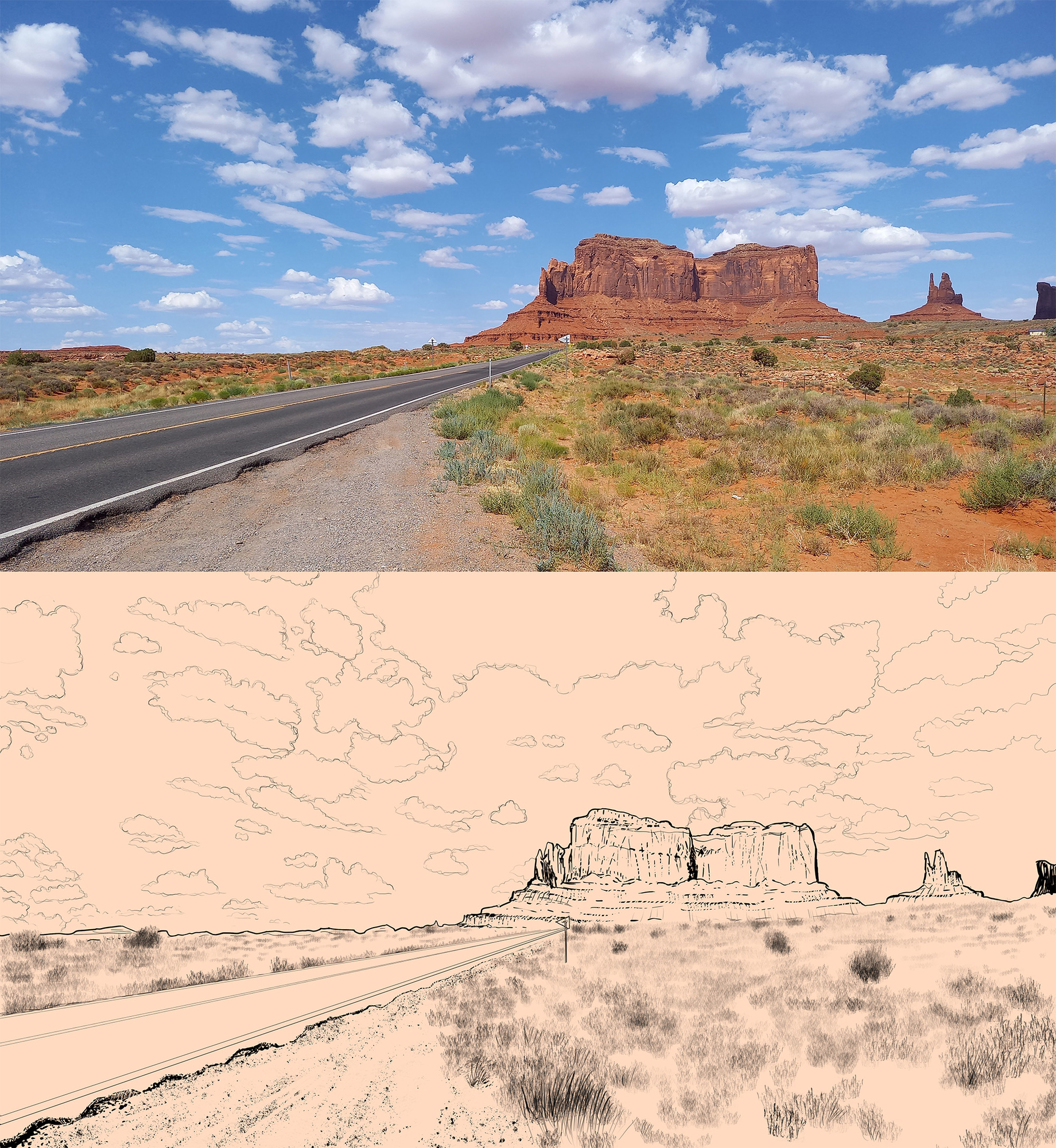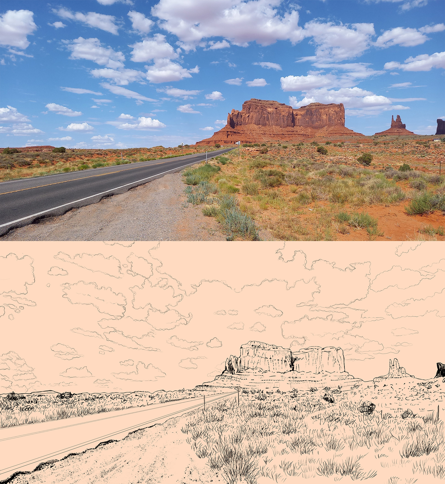 Salut ! Voici, mon 6ème croquis. Après les 3 objets "obligatoires" et après avoir choisi un animal (le bison) et un personnage (le frontierman), je termine les 3 croquis "libres" avec un paysage, histoire de me confronter à 3 thèmes différents. Il s'agit d'une photo prise lors d'un voyage dans l'ouest américain (Monument Valley). Pour le lining de fin, j'ai utilisé un brush "herbe". Je n'ai pas cherché à reproduire parfaitement les détails (herbes, nuages) car cela me paraît difficile sans y passer un temps de ouf. Par contre j'ai essayé d'avoir les éléments principaux le plus juste possible (route, blocs rocheux, horizon...) pour permettre une identification visuelle rapide...1 point