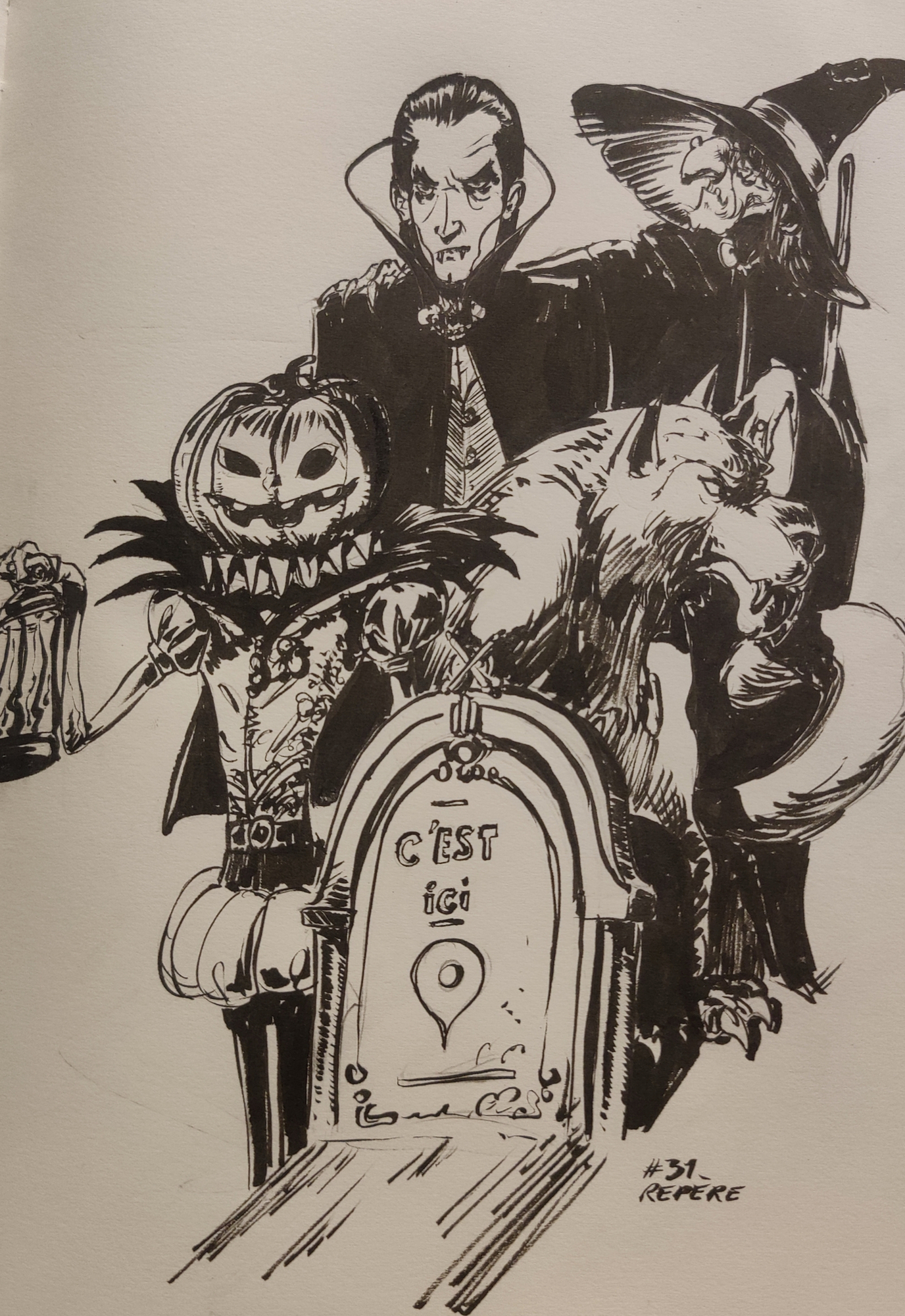 Oh la il était temps que ça se termine ! Juste à temps! Comme souvent je compare l'inktober à une colonie où l'on est triste de partir et de quitter les copains mais en même temps tellement content de rentrer chez soi. J'ai tout donné et franchement je me suis moi-même surpris à sortir mes illus car je ne pensais pas que j'y arriverais vu le peu de temps que je disposais. Bref j'espère vous avoir régalés chaque jour et qu'on continuera à se côtoyer soit sur nos réseaux sociaux soit sur différents challenges de DPS. Félicitations à tous ceux qui ont participé de près ou de loin et une énorme pensée particulière à ceux qui ont fait l'inktober en entier et ont ensoleillé le forum tous les jours. Voici donc ma dernière illustration pour finir en beauté. Comme chaque année ( 5è fois) je finis avec ma citrouille fétiche! À bientôt ! (rdv pour le challenge 18....) Encore bravo à tous !!!!1 point
