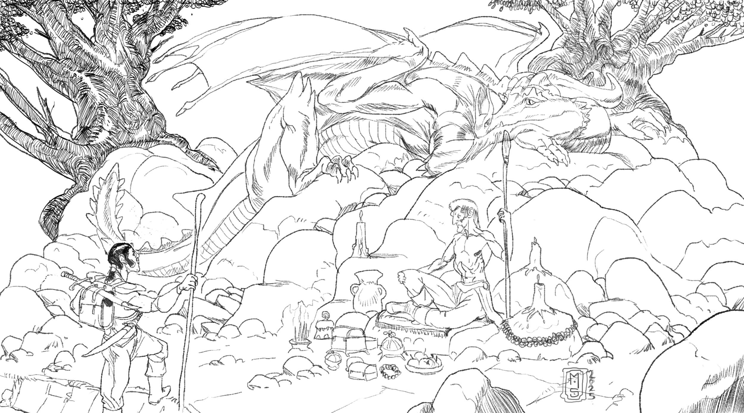 Bonjour tout le monde ! Premier challenge pour moi aussi ! Je suis tombé sur Assassin - Minotaure - Western - Mystery - Eyes - Triangle - Mâle comme mots, du coup ! Voici le croquis clean de mon prompt et l'histoire... Nous sommes au coin du feu en pleine nuit, notre minotaure, que l'on peut reconnaître grâce à plusieurs signes distinctifs, outre sa carrure imposante et son allure légèrement bovine, il arbore deux anneaux d'or à ses cornes qui scintillent étrangement au clair de lune... Si ce n'était que ça, vous feriez sans doute fi d'un minotaure en poncho, armé d'un Python 457 magnum déambulant au milieux du desert en pleine nuit, mais c'était sans compter sur ces deux yeux rouges qui brillent d'une lueur sinistre, comme si les feux de l'enfer eux-mêmes brûlaient à l'intérieur de ses énormes pupilles... Notre personnage est-il un démon assoiffé de sang ? C'est ce que raconte la légende mais nul n'est assez téméraire pour essayer d'aller en tester la véracité ! Je disais donc.. Nous sommes au coin du feu, et notre personnage contemple celui-ci, satisfait du meurtre qu'il vient de perpétrer... Cet ignoble voleur, tueur et violeur ne méritait que ça se disait-il, son revolver encore fumant à la main...3 points