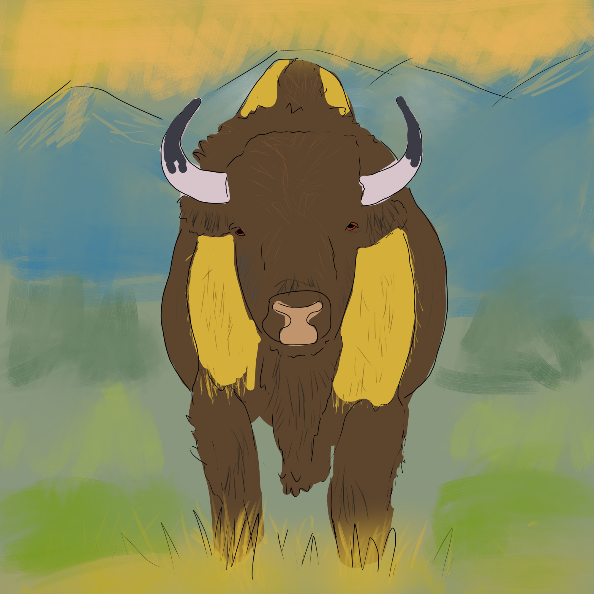 Bon, j'avais "oublié" (ou peut-être gêné) de publier mon dessin préliminaire. Je n'y ai pas consacré énormément de temps, étant donné que je ne maîtrise pas Krita (et j'étais trop motivé à attaquer le cours suivant). Désolé pour ce bison😅, j'espère qu'il aura meilleure allure à la fin de la première partie. 🐮2 points
