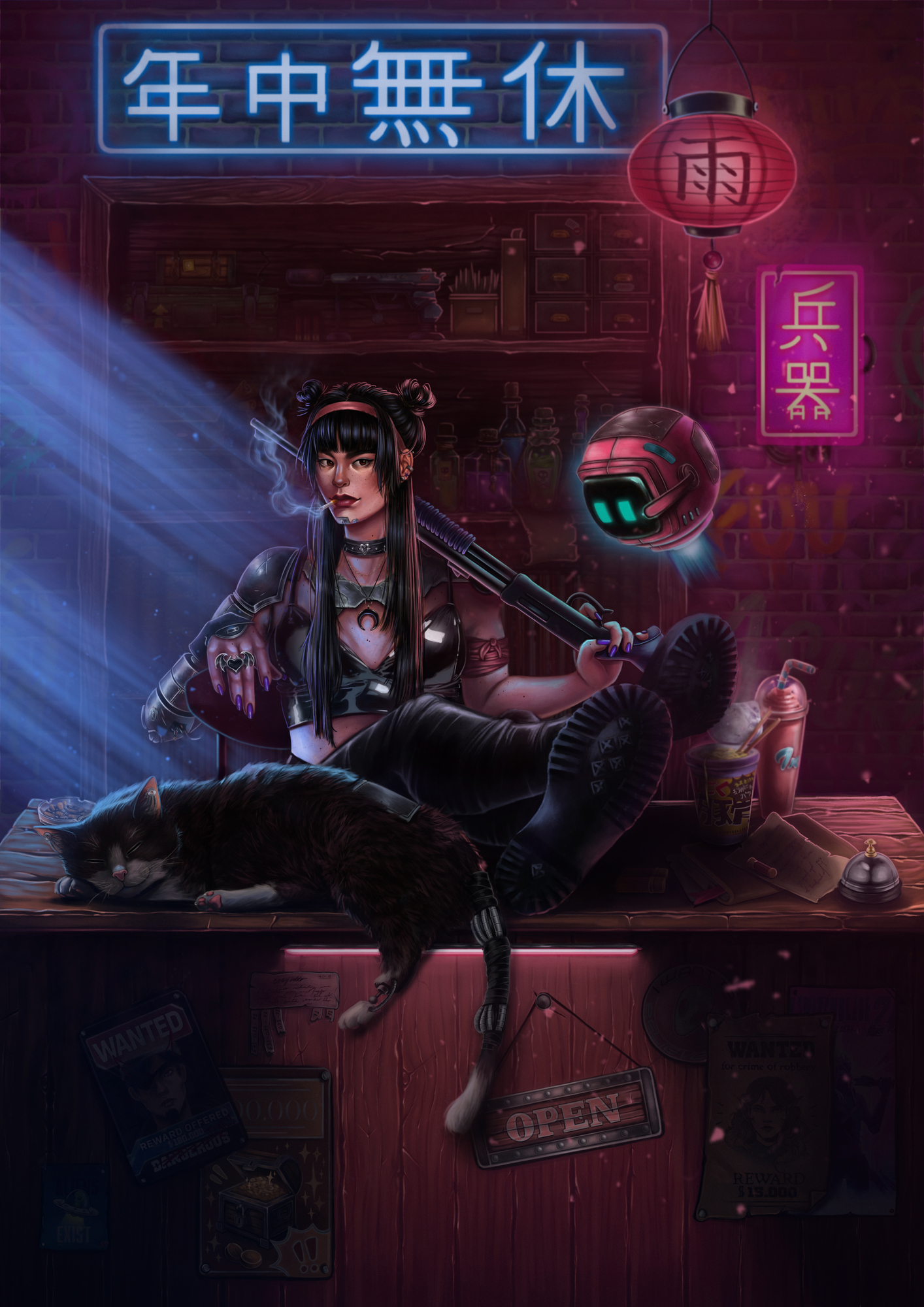 Bonjooour ! Je commence la partie 2, hyper motivée comme d'habitude ! J'ai passé beaucoup de temps sur ce dessin, je commence à bloquer alors je m'arrête là. Je n'ai pas utilisé de référence pour l'anatomie et la perspective. J'en ai utilisé une pour le latex, les écritures japonaises et pour la pose du chat. Hâte de suivre la suite des cours. A bientôt 🙂1 point