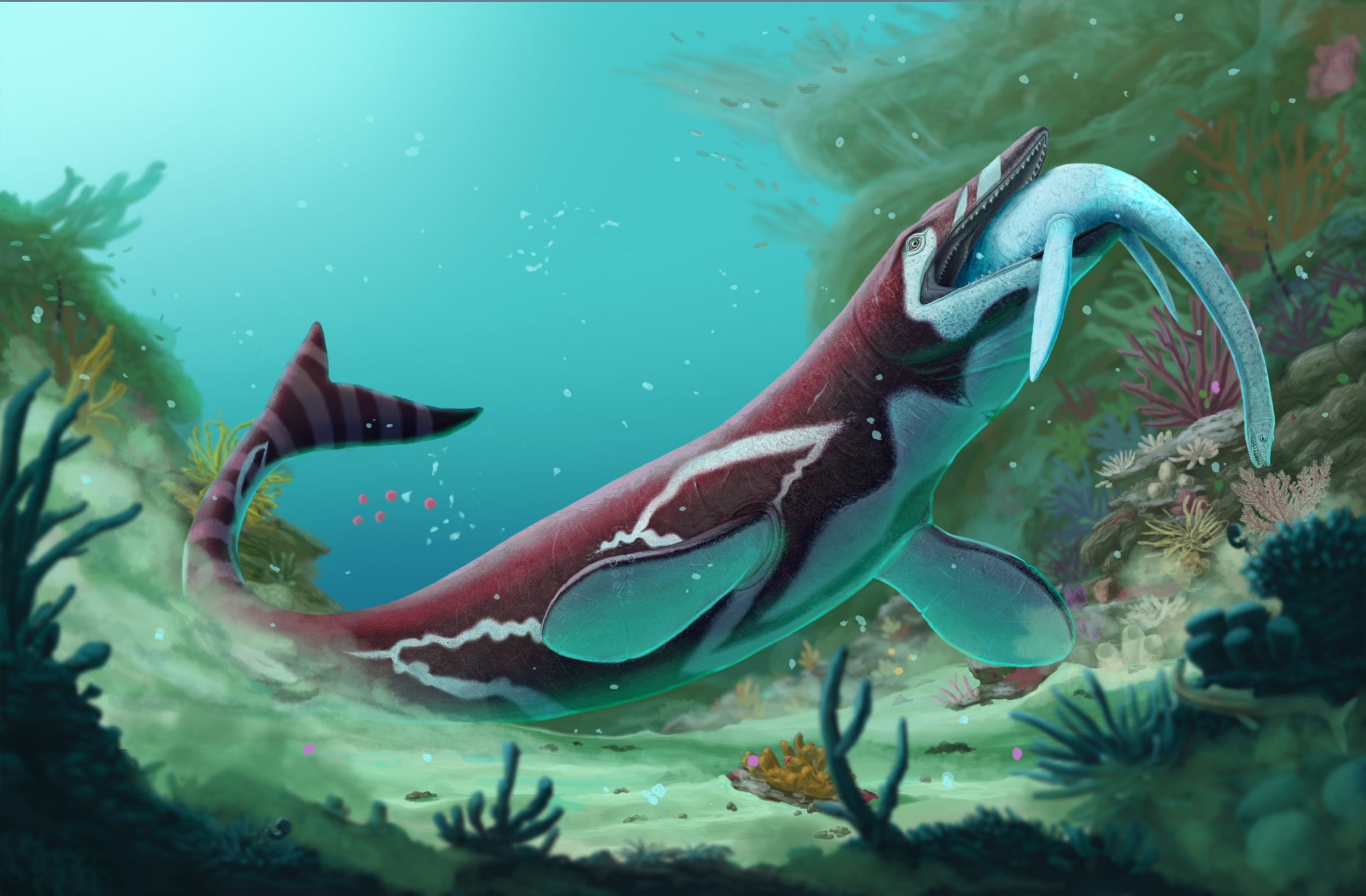 Voici mon illustration d'un grand mosasaure de § m de long, appelé Jormungandr walhallaensis, en train d'avaler un Elasmosaurus platyurus juvénile, un plésiosaure à très long cou. Il va le gober tout rond en une seule bouchée. Cette scène se passe au Crétacé supérieur il y a 80 millions d'années dans le Dakota du Nord, dans la formation de Pierre Shale. Jormungandr walhallaensis doit son nom à la mythologie nordique, le Jormungandr étant un serpent géant. Ça tombe bien, les mosasaures étaient des squamates géants très proches des serpents. Qu'en pensez-vous ?3 points