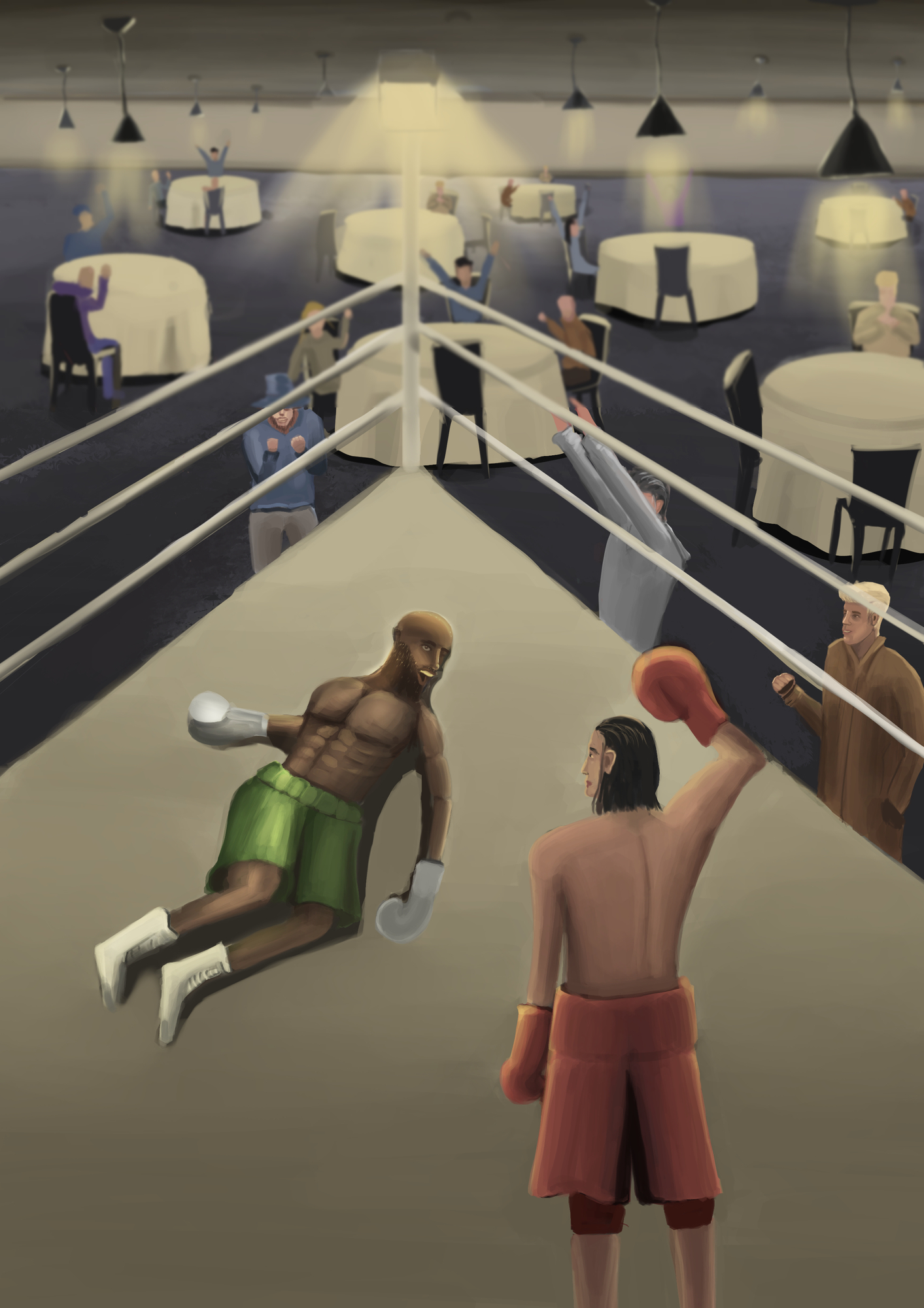 Hello, Voici mon painting de référence pour la partie 0 🙂 Je me suis tenté quelque chose en perspective avec pleins de personnages, etc... A la base j'avais pensé à une scène plutôt dynamique avec un perso qui prend un KO et et le public en folie derrière, pour montrer un peu le contraste entre la violence du coup et la joie des spectateurs derrière.1 point