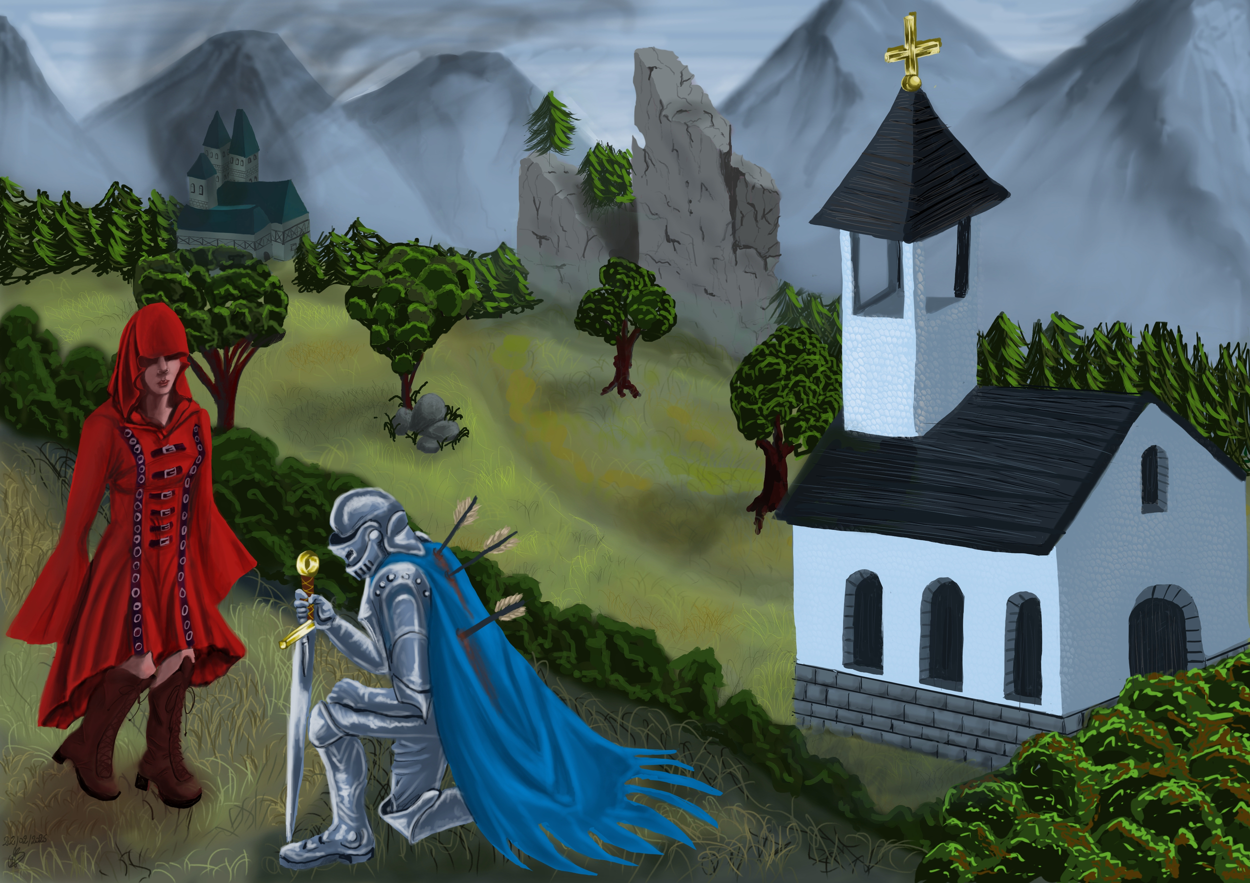 Oh la la ! Merci @Lionel Art, j'adore tes suggestions ! Je vais essayer quelque chose d'approchant et puis je posterai ici ma dernière version. Encore un immense merci pour tout 😄 c'était un plaisir ce chapitre 2 ! --- MàJ 17h51 : voici ma mise à jour avec tes suggestions ! J'ai essayé de ne pas copier "bêtement" et d'adapter des croquis que j'avais déjà faits de ce château 🙂 J'ai également élargi la compo en 16/9 comme suggéré ! Je te remercie encore infiniment (oui je sais... désolé) ! Si tu vois des retouches à faire ou du cleaning, j'y suis totalement ouvert !1 point