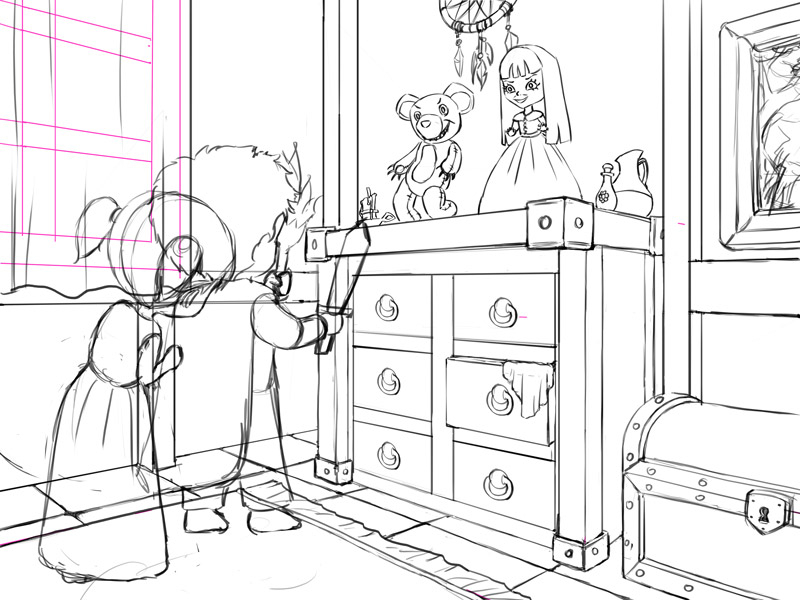 4eme étape : Mise en valeur grossièrement pour un aperçu du rendu de la scène. Là je me heurte à un problème sur lequel je passe de nombreuses heures, la torche du coté de la main gauche ne permet pas d'éclairer suffisamment les enfants, surtout la sœur par des rim light. Finalement après de multiple tentatives sans succès, je décide de tourner horizontalement la toile pour que la torche puisse d'avantage éclairer les visages des enfants avec des rim lights plus larges, tout en restant dans la main gauche. Quelques modifications et ajouts sont fait pour donner plus de narration. Prochaine étape, mise en couleurs et textures, les valeurs seront alors ajustées avec surement encore des modifications et corrections ;).1 point