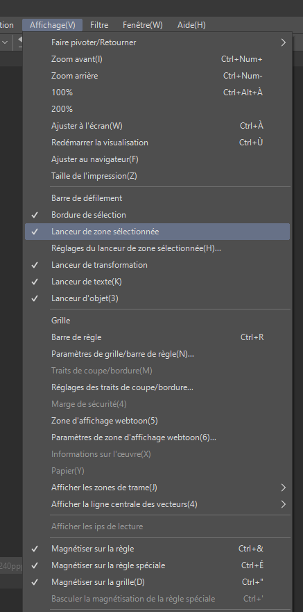 Bonjour, Question pour l'outil lasso. Quand on sélectionne une zone du calque, le "lanceur de zone sélectionnée" s'affiche et permet d'effectuer tout un tas de choses en cliquant directement sur le bouton désiré. Le problème est que cet outil se place juste sous la sélection que l'on vient de faire, comme ici. Si je veux sélectionner une zone sous ma sélection (ici l'eau), cette fenêtre ne disparait et me gêne dans la sélection. J'ai trouvé un moyen de la faire disparaitre totalement (il suffit de décocher cela). Pour le moment j'ai mis un raccourci (ctrl+shift+<) pour l'afficher ou non à la demande. Mais savez vous s'il existe une option qui ferait qu'elle disparaisse quand le stylet passe dessus (optimisation maximale !) ? Merci1 point