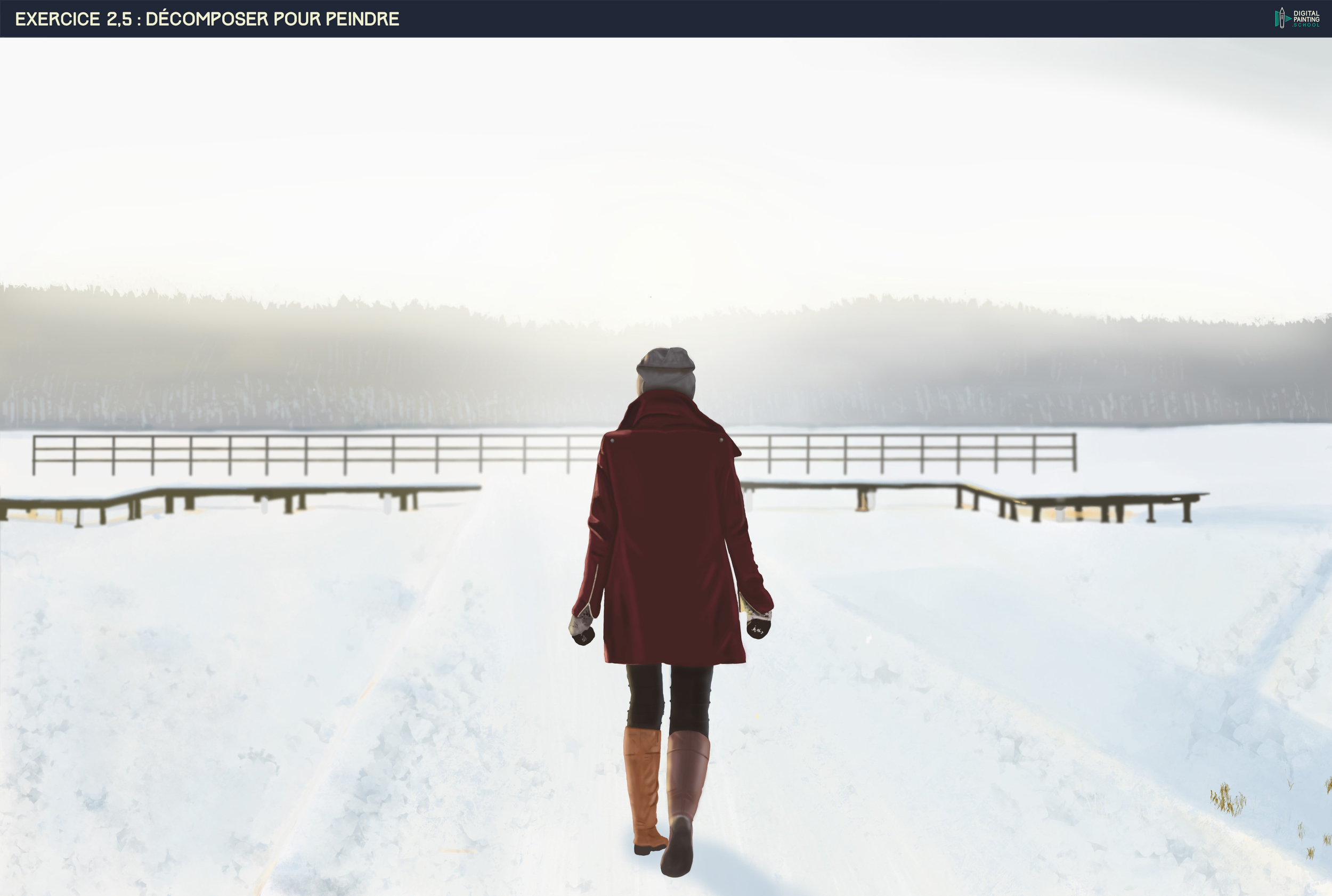 Salutations. C'est avec énormément de timidité que je viens présenter mon travail sur ces exercices. Avant de commencer les cours il m'arrivait de dessiner un peu sur Krita pour accompagner l'écriture de certains personnages et certains endroits. J'ai des notions sur le digital painting mais aucun apprentissage réel en dehors de mes propres expériences. Six mois après je décide enfin de repartir sur des bases saines, sur Photoshop. L'exercice 2 était appréciable, la méthode m'était déjà familière, il fallait juste que je refasse les raccourcis. Le 2.5 était beaucoup plus intimidant. Je dois avouer que j'étais paralysé sur la manière d'approcher ça. J'ai pu retrouver mes repères lorsqu'il s'agissait de redessiner la personne. J'étais confus pour la forêt mais j'ai pu trouver des brush utiles pour la recréer de manière simple. J'ai eu du mal a détailler les autres structures et j'ai fait un blocage quasi complet lorsqu'il s'agissait de la neige en dehors des couleurs distinctes. J'ai vu qu'il était stipulé qu'il n'était pas nécessaire de reproduire le relief et les effets de lumière sur la neige mais je me sentais coupable de ne pas au moins mettre quelque chose si ce n'est que pour montrer que c'était là. Bref. Voilà ma première tentative. Il est évident que je peux peaufiner et c'est le but de ma présence ici, mais j'espère dans un premier temps que je n'ai rien commis de criminel.2 points