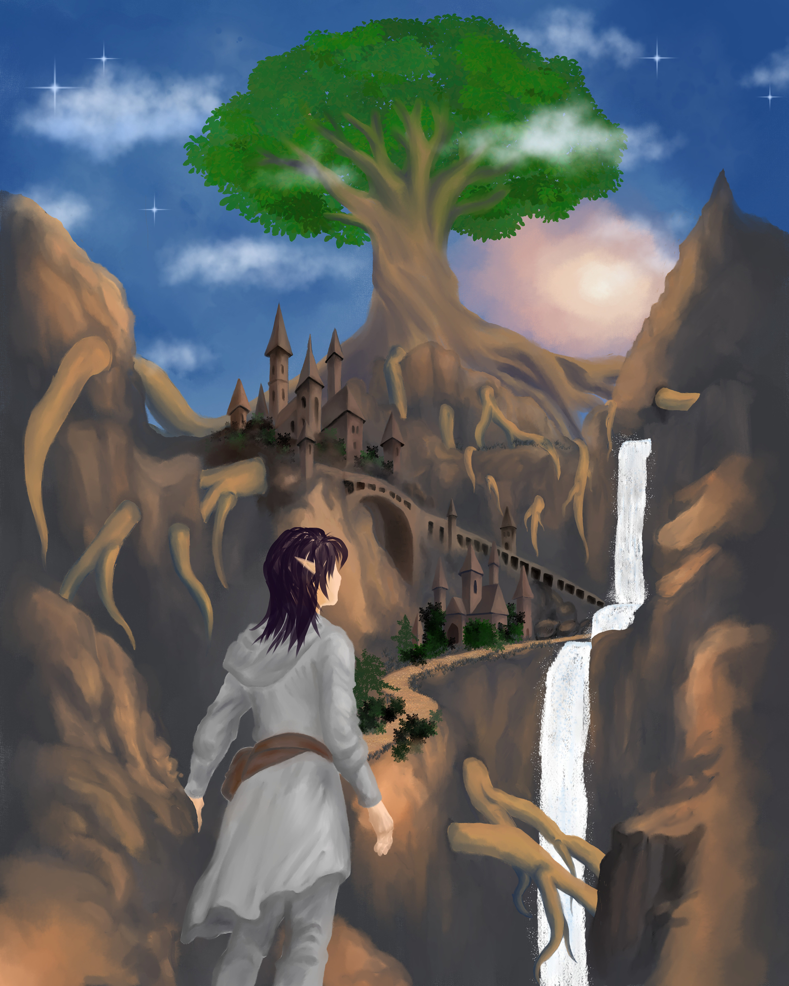 Salut à tous, Voici ma toute première toile en digital painting réalisée sur Clip Studio Paint je ne savais pas trop quoi dessiner alors j’ai choisi de représenter une scène issue d’un worldbuilding que je développe en ce moment j’ai commencé par rechercher des références (montagnes, arbres, architectures elfiques, vêtements, poses) puis j’ai fait un croquis avant de passer à la couleur directement sur CSP1 point