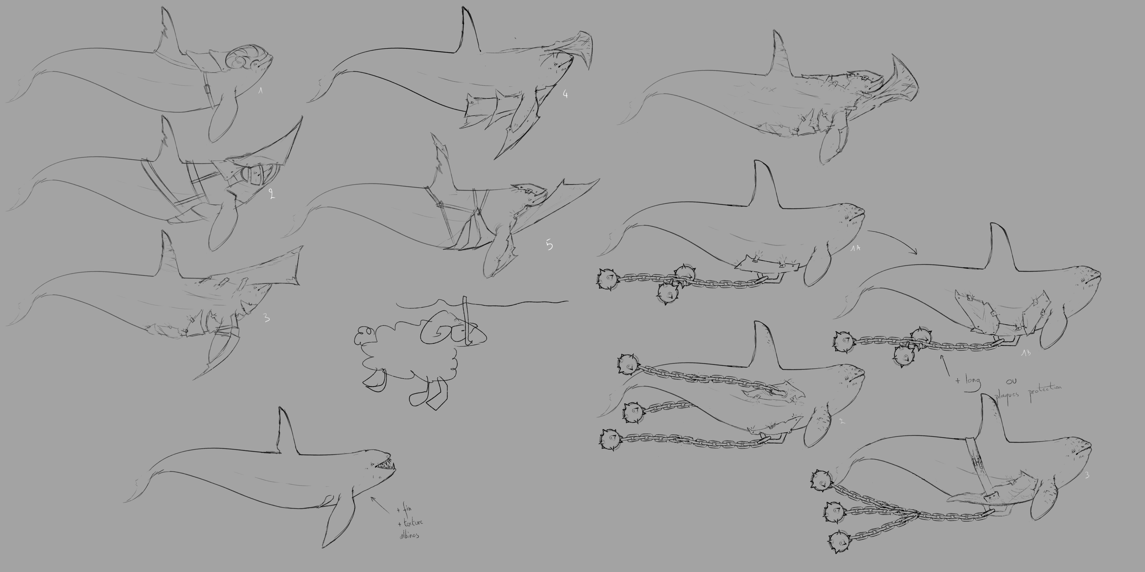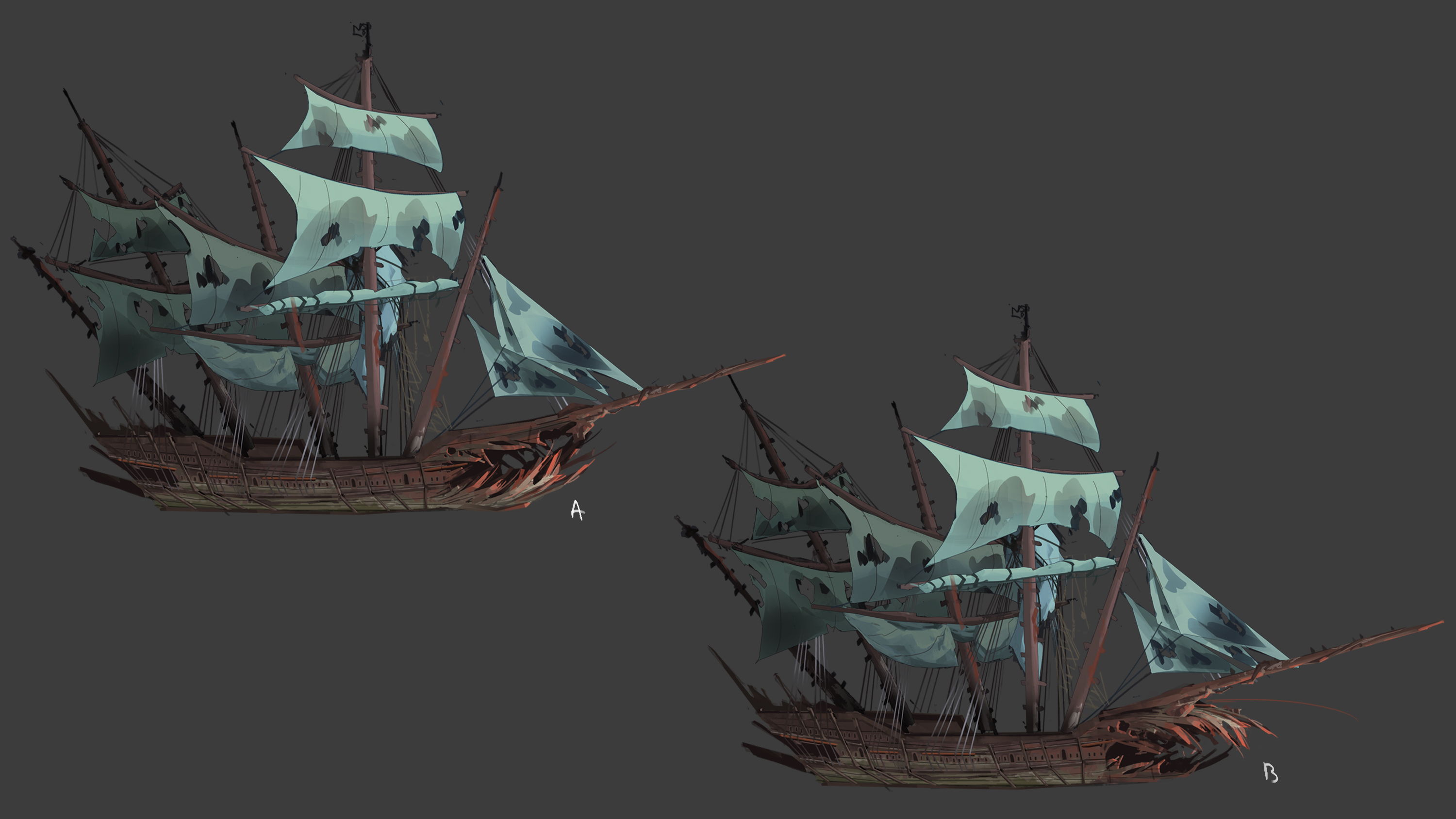Design du bateau terminé, il va surement évoluer avec la 3D et le paint over. Pour le devant j'hésite entre deux versions, j'ai ma préférence mais je suis curieux de voir vos avis, n'hésitez pas à me dire ce que vous en pensez. Je n'ai pas encore travaillé la shape entre le bateau les âmes je vais voir ca en fonction de la compo. A la prochaine pour la base 3D !4 points