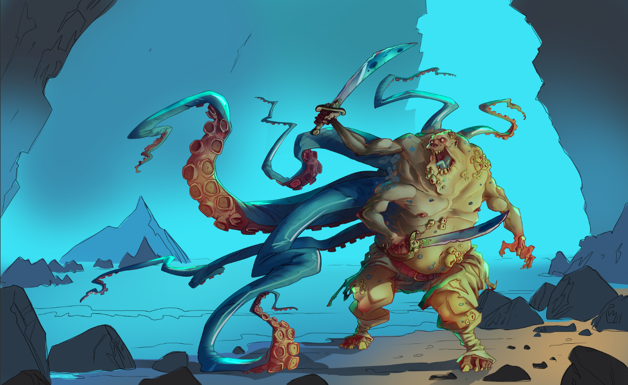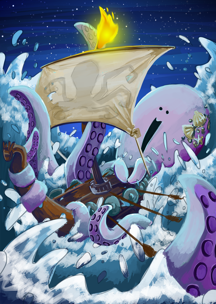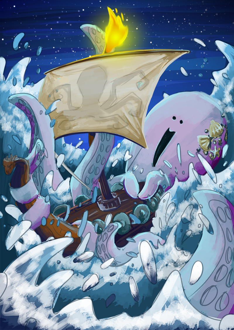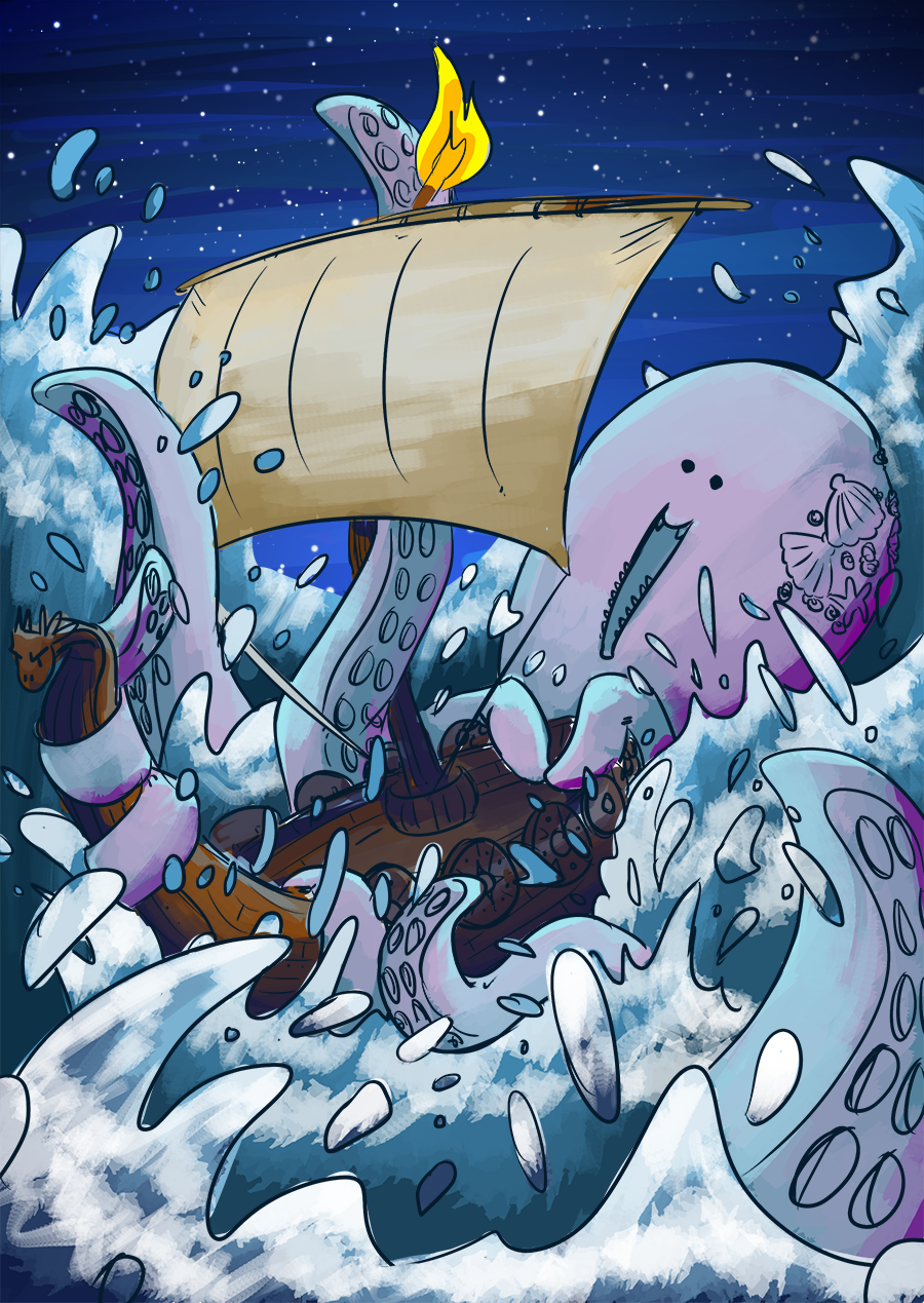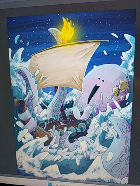 Alrighty ! J'ai opéré les modifications suivantes : Décalé le tableau vers la droite, je pense que c'est suffisant mais peut-être pas ? Ajouté les ombres et lumières aux bateaux pour qu'ils soient mieux intégrés à l'image, ET pour essayer de les faire ressortir un peu plus. Aucune idée de si c'est bien comme ça ou pas 🤷♀️ Coloré/éclairé davantage la mer placée directement sous la lumière de la foudre et assombri encore plus l'eau/écume à l'ombre du Kraken. Je pense qu'en termes de valeur, c'est pas mal. Mais ma mauvaise vision des couleurs fait que je ne saurais dire si c'est suffisamment coloré ou pas 😅 Adouci la ligne d'horizon et rajouté une couleur intermédiaire entre mer et ciel jaune J'ai en tête qu'il me reste à : Kraken Faire des tests de coloration pour le kraken, sachant que j'aimerais bien trouver une couleur différente pour le buste "humain" par rapport aux têta/jambacules Ajouter les ventouses (couleur, lumière/ombrages, transparence) et les déranger un peu parce qu'elles sont parfaitement en ordre Texturer le crâne avec des petits "picots" Explorer (voire invalider) la piste du collier de piques, et/ou piquants dans le dos Faire des gouttelettes autour des tentacules qui sortent de l'eau Bateaux Éventuellement changer les couleurs pour plus de lisibilité Ajouter des pauvres vikings un peu partout en l'air et dans l'eau Mer Faire la limite au premier plan entre sous et sur la surface de l'eau Gommer un peu certaines "bulles" sous la surface Ciel Potentiellement faire les nuages moins noirs s'ils prennent trop le focus Voilà pour le programme prévu, si vous voyez d'autres trucs, je prends tous les avis ! 🔥 Belle fin de journée à tou.tes ! 🙂1 point