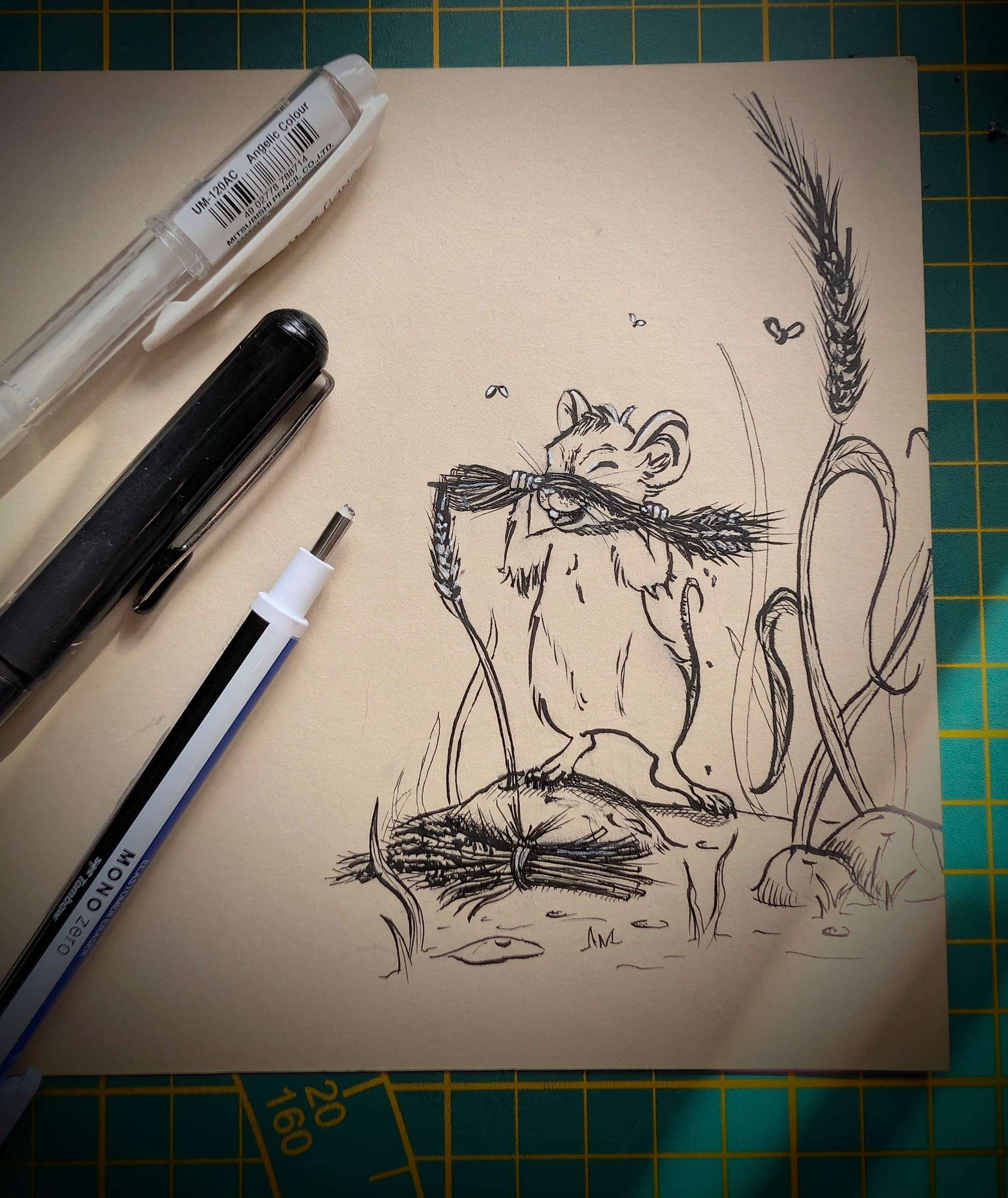Bonjoour ! Mon stress en postant était d'imaginer le nombre d'araignées que j'aurais à affronter. 😅 De mon côté, on poursuit avec le thème des souris des champs. Et on ajoute ce merveilleux art qu'est la vannerie ! (Mon téléphone n'était pas très docile aujourd'hui pour les photos). Et la photo de famille (j'avais gardé la place à côté exprès, héhé). @Shelter Aha, c'est original ma foi ! @HaeresisJ'ai la ref, super bien trouvé ! @holdwigOh bah cette araignée si choupi me va bien, tu vas me réconcilier avec elles peut-être ! EDIT : Je suis en expérimentation totale avec l'encre et mon pentel, alors s'il y a des chevronnés de l'encrage, n'hésitez pas à donner vos conseils (j'ai notamment peur d'aller trop loin dans l'ombrage/texture et tout ruiner).37 points