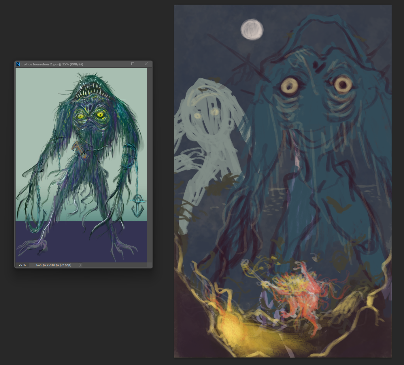 Bonjour, je n aurais pas le temps de finaliser le kraken comme il faut, j ai eu un décès dans ma famille donc je n aurai pas le temps de m occuper de ma famille, finaliser le Kraken et finaliser le secret Santa. Je choisis ma famille et le secret Santa où je me suis engagée. Un grand merci @SoZenpour ton aide. Je finaliserai le kraken après le challenge. J ai utilisé la technique que tu m as conseillée pour ajouter de la perspective atmosphérique par contre pas le temps de changer le perso de place et faire les autres modif avant la fin du challenge. Bon challenge à tous. Et bravo pour vos illustrations, certaines sont vraiment magnifiques, cela donne envi de se surpasser. merci à l équipe DPS pour ce super challenge, c est très motivant.2 points