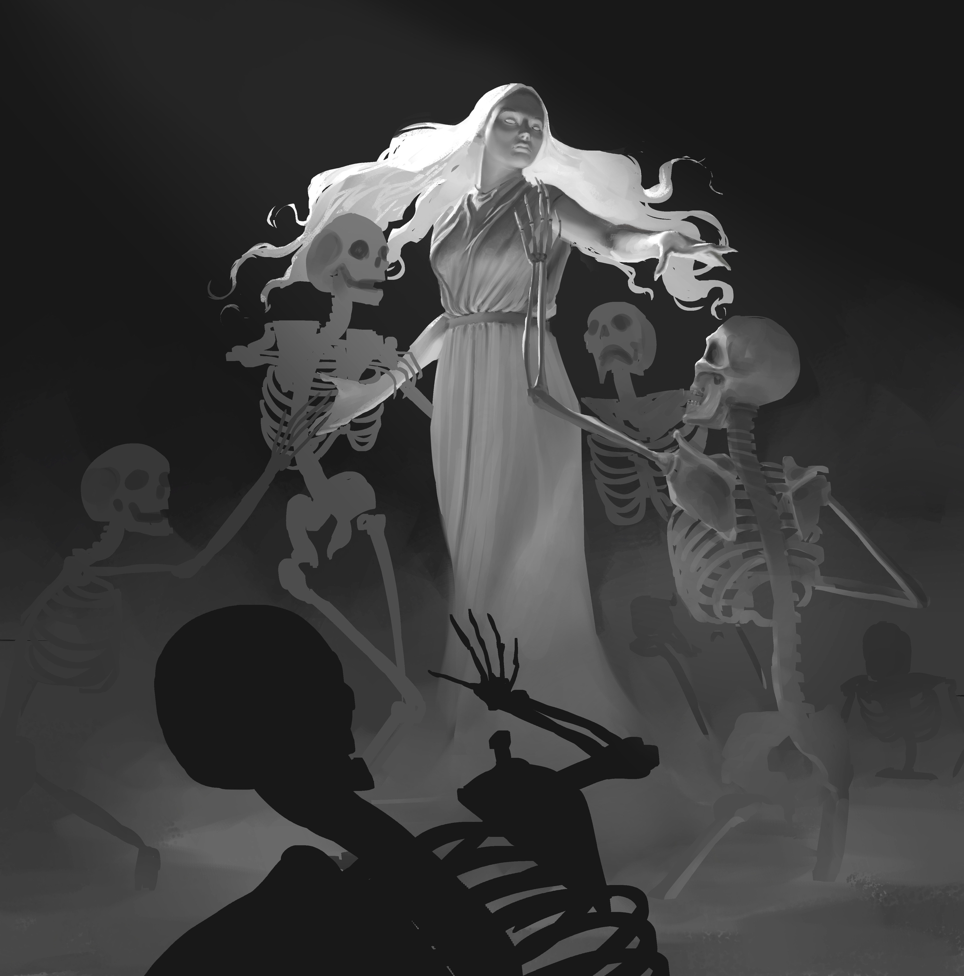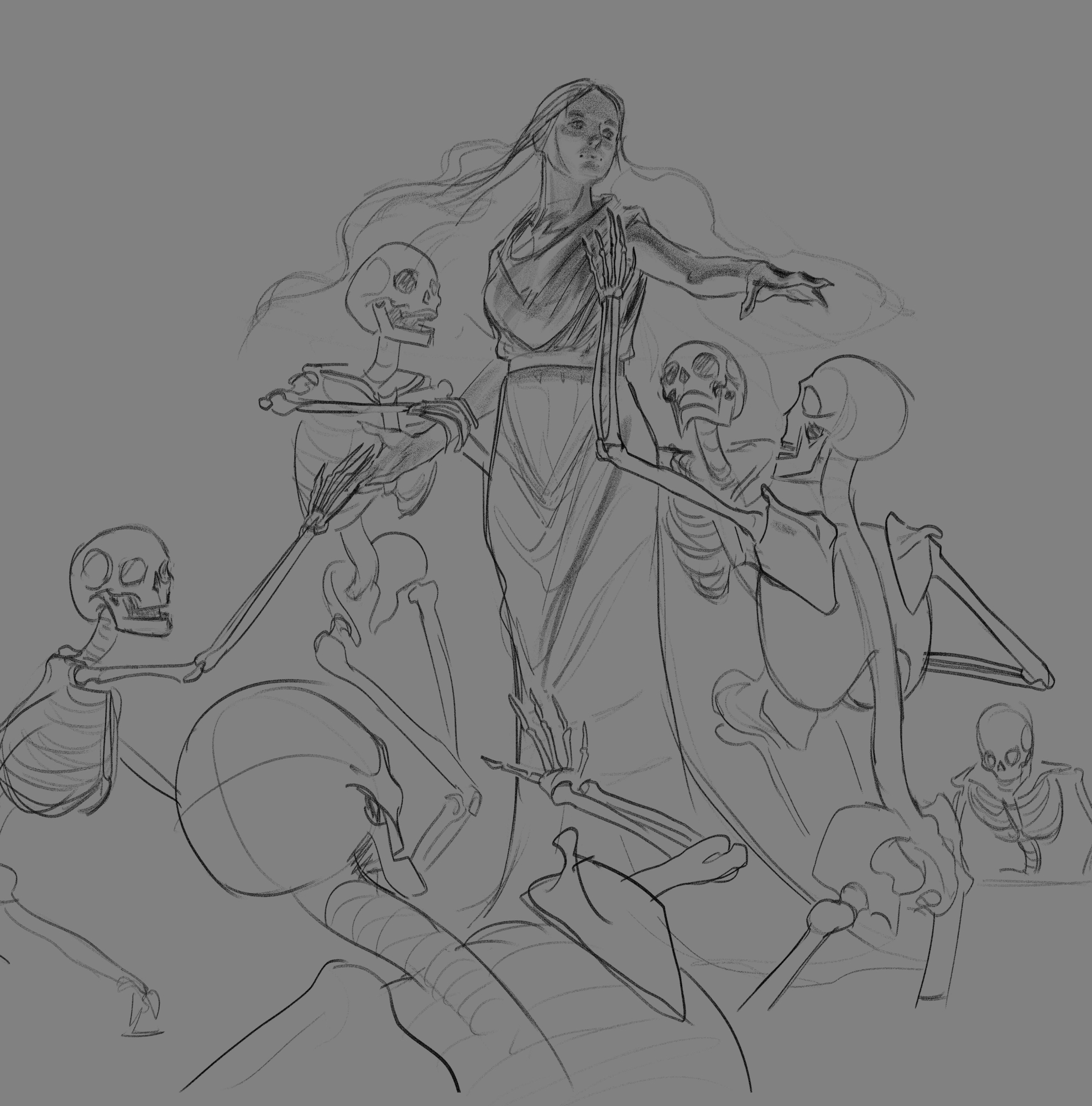 Bonjour tout le monde! C'est mon tout premier post sur le forum 😁 Ici rien d'extraordinaire en termes de procédé (malheureusement je n'arrive pas à poster toutes les images que je voudrais à cause d'une "erreur 200"). J'avais simplement pour idée de faire un personnage féminin à l'apparence froide et divine qui redonne la vie aux morts. Je souhaitais me diriger vers un style un peu "classique" donc je n'ai pas eu beaucoup de recherches à faire en termes de chara design. Ce qui m'intéressait ici c'était plutôt de trouver un scénario lumineux qui servait bien mon idée de départ, et de profiter de l'occasion pour bosser sur des squelettes aussi. J'ai donc commencé avec un croquis pour mettre en place les différents éléments de mon illustration: Ensuite je me suis fait un layout 3D en noir et blanc très basique sur blender pour tester plusieurs options d'éclairage. J'ai passé quelques temps à rechercher des références (surtout pas générées par des IA) ou à prendre des photos moi-même, puis j'ai commencé à ajouter des valeurs en nuances de gris: Après moultes coups de pinceau j'ai finalement pris la décision de sortir le modèle "Skelly" de chez Proko pour avoir de bonnes références et peindre des squelettes à peu près "anatomiques"... Malheureusement pour une raison que j'ignore (ce n'est pas la taille totale des fichiers) je n'arrive pas à poster les images suivantes. Une fois les valeurs posées à peu près partout, j'ai expérimenté avec les "gradient map" et une brosse texturée dans le fond avant de passer aux finitions (l'étape la plus longue!) Tout le reste à été fait à la brosse ronde basique! Voilà, voilà! J'espère que ça vous plaira malgré le peu d'informations finalement!