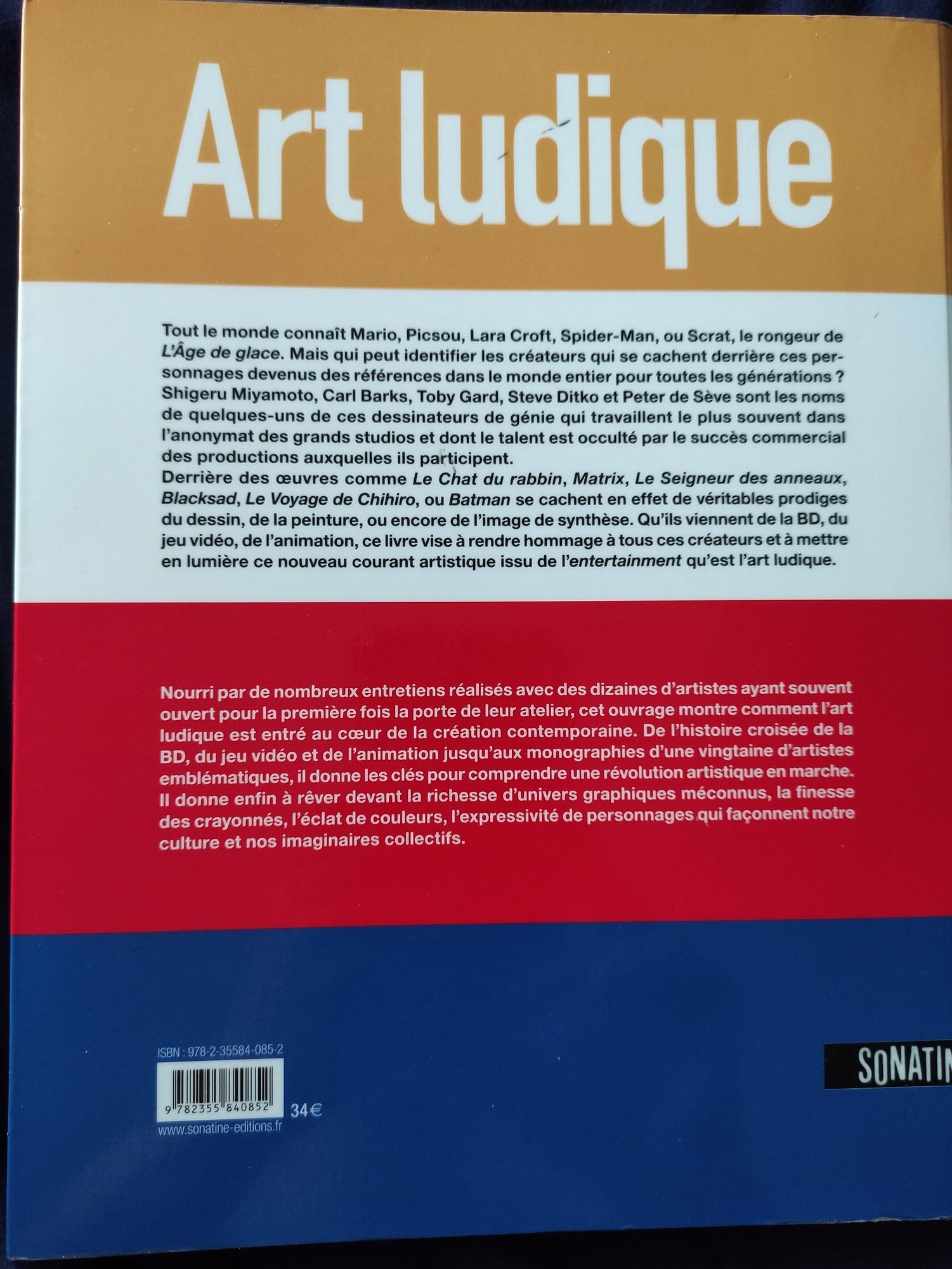 Yop les artistes! J'ai lu le bouquin ''Art ludique'' de Kriegk et Launier et c'était super intéressant pour creuser le monde de l'art ludique et la place des différents artistes dedans. Ça regroupe la BD, l'animation/film et les jeux vidéo et montre en quoi ils sont liés et interagissent entre eux ainsi que leurs origines historiques. Ça explique les différents ''corps de métier'' et comment les artistes passent maintenant les frontières entre ces différents arts par le biais du dessin/painting.Même s'il est de 2011 ça permet de bien balayer le terrain jusqu'à cette date. Pour terminer il y a un panorama d'artistes de ces différents domaines et permet de connaître des pointures dans le domaine qui souvent restent en retrait. Une mini biographie est présentée avec quelques unes de leurs illustrations. Exemplesd'artistes présentés : Sylvain Despretz qui travaille comme illustrateur pour le cinéma (Gladiator, Alien, Chute du faucon noir, Eyes wide shut...) Peter de Seve (l'âge de glace, couvertures de the New Yorker, 1001 pattes,) Glen Keane ( Disney: Tarzan, Raiponce, Belle et la Bête...) Michel Ancel (jeux vidéo: Rayman, beyond good and evil), Mike Defeo (sculpteur réel et 3D : âge de glace, Titan .A.E. , Alien résurrection,...) John Howe ( illustrateur pour Peter Jackson : seigneur des anneaux, Le Hobbit) Sylvain Chomet ( Triplette de Belleville, L'illusionniste), Joann Sfar ( chat du rabbin...) Clément Oubrerie (Aya de Yopougon) Aleksi Briclot ( Marvel, splinter cell,..) Viktor Antonov ( concept artist de décors jeux vidéo : Half-Life 2, Dishonored...), Iain McCaig (Star Wars....) , Bobbi Chiu et Kei Acedera (Ailce au pays des merveilles de Tim Burton...) Bref, parfait pour sa culture G sur le sujet. J'vous ai mis la table des matières pour voir le schéma de présentation et les différents artistes mis en avant. 34€ neuf mais apparemment introuvable maintenant, sauf en occasion entre 10 et 17€. Je l'ai pour ma part trouvé en médiathèque. Bonne lecture 🖖