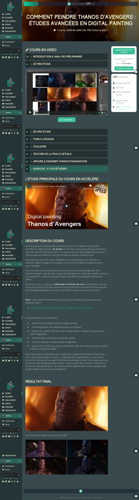 Bonjour, dans les cours gratuits, par exemple sur la page https://digitalpainting.school/cours/comment-peindre-kylo-ren-de-star-wars-en-digital-painting, lorsque la vidéo de cours est une vidéo Youtube et non une vidéo classique comme sur le reste du site de DPSchool, il n'y a pas de bouton "Complété" afin de valider la progression du cours, ce qui est pas mal en soit pour se repérer dans l'avancée de son parcours artistique. Mon navigateur internet est Safari et je suis sur un MacBook Pro. Voici une capture d'écran d'une page de cours où la vidéo de cours est une vidéo Youtube. Sous la vidéo n'apparaît pas le bouton "Complété". Et voici une capture d'écran d'une page d'un cours où les vidéos ne sont pas des vidéos Youtube. Le bouton "Complété" est ici disponible. Et c'est la même chose pour tous les cours où les vidéos sont des vidéos Youtube. Le bouton n'apparaît alors pas dans ce cas là. Bonne continuation.