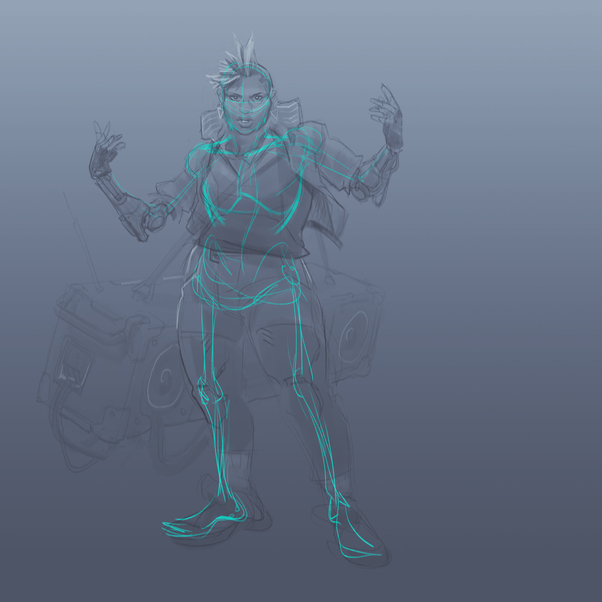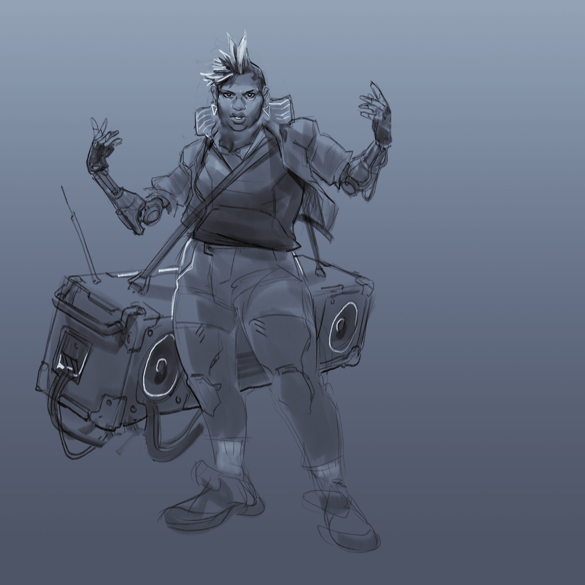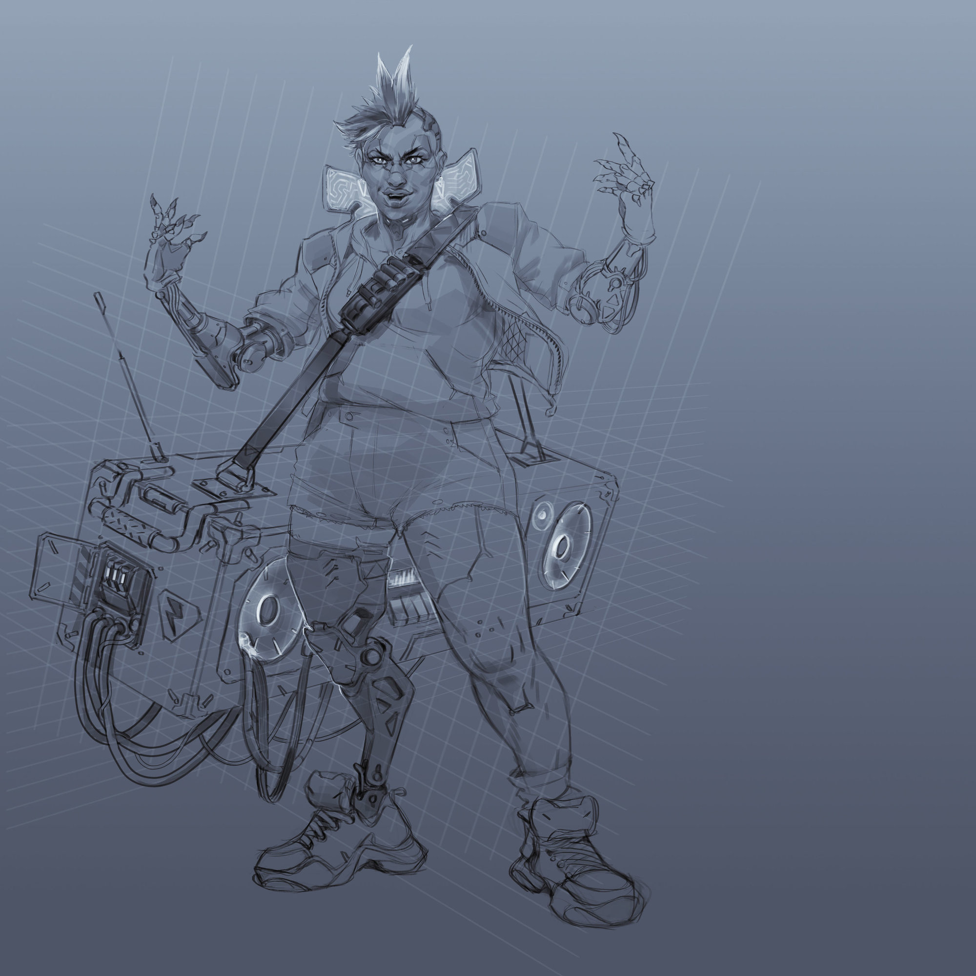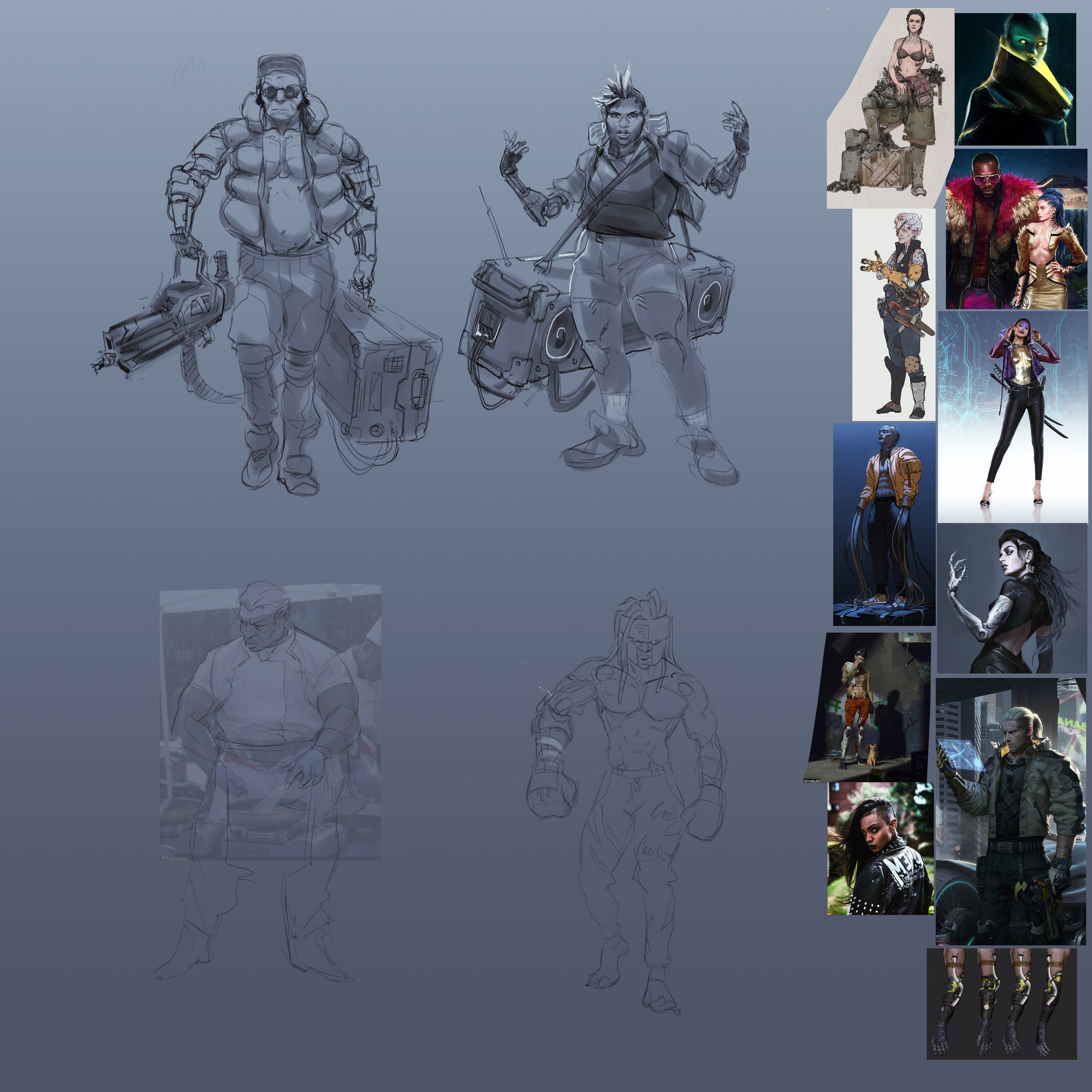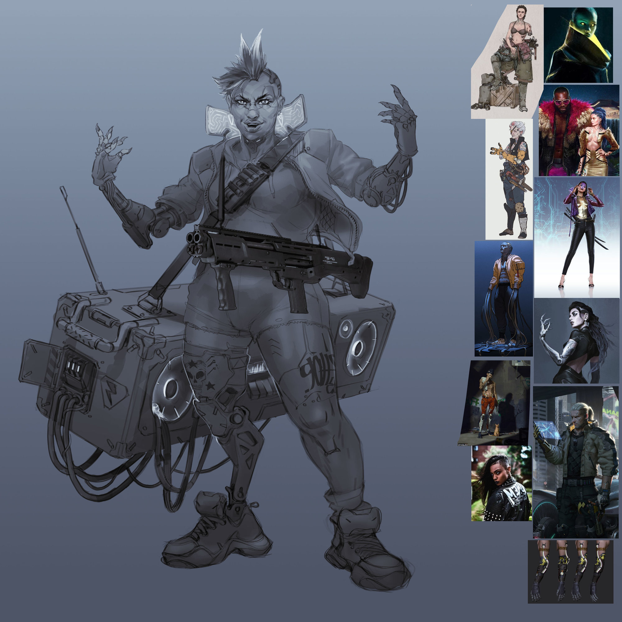 Salut à tous, je vais profiter de ce challenge pour essayer de me remettre à faire quelques trucs persos, j'ai l'impression de ne rien avoir à montrer dans mon portfolio depuis 2013 où j'avais bossé dessus. J'ai commencé par rassembler quelques référence très large, juste pour titiller un peu l'imagination, et fait quelques sketch. J'ai choisit celui qui me semblait avoir le plus de potentiel pour faire un personnage intéressant, une fille un peu chubby, gangsta, avec un gettho blaster tellement massif qu'il justifie ses jambe augmentée. J'ai imaginé que la personnalisation du joueur pourrait permettre de créer un personnage similaire hehe, donc je lui ai donné le look du personnage du joueur de CP2077. J'espère que les steps peuvent être intéressant pour certains, par exemple partir de photos (opacité 10%) pour dessiner un personnage en pose réaliste sans avoir à trop penser à l'anatomie, et plus au design. Ensuite vérifier l'anatomie sous les vêtement en dessinant un squelette. Vérifier la perspective au moment du clean du lineart, sur les objet en perspective comme les armes ect ... En bonus je met ma brush favorite du moment pour dessiner, super polivalente pour faire du croquis léger ou plus définit, de l'ombrage, des lignes droite ect.. sans changer de brush. Next step, couleur, background et lighting... dessin_crayon_clean.tpl