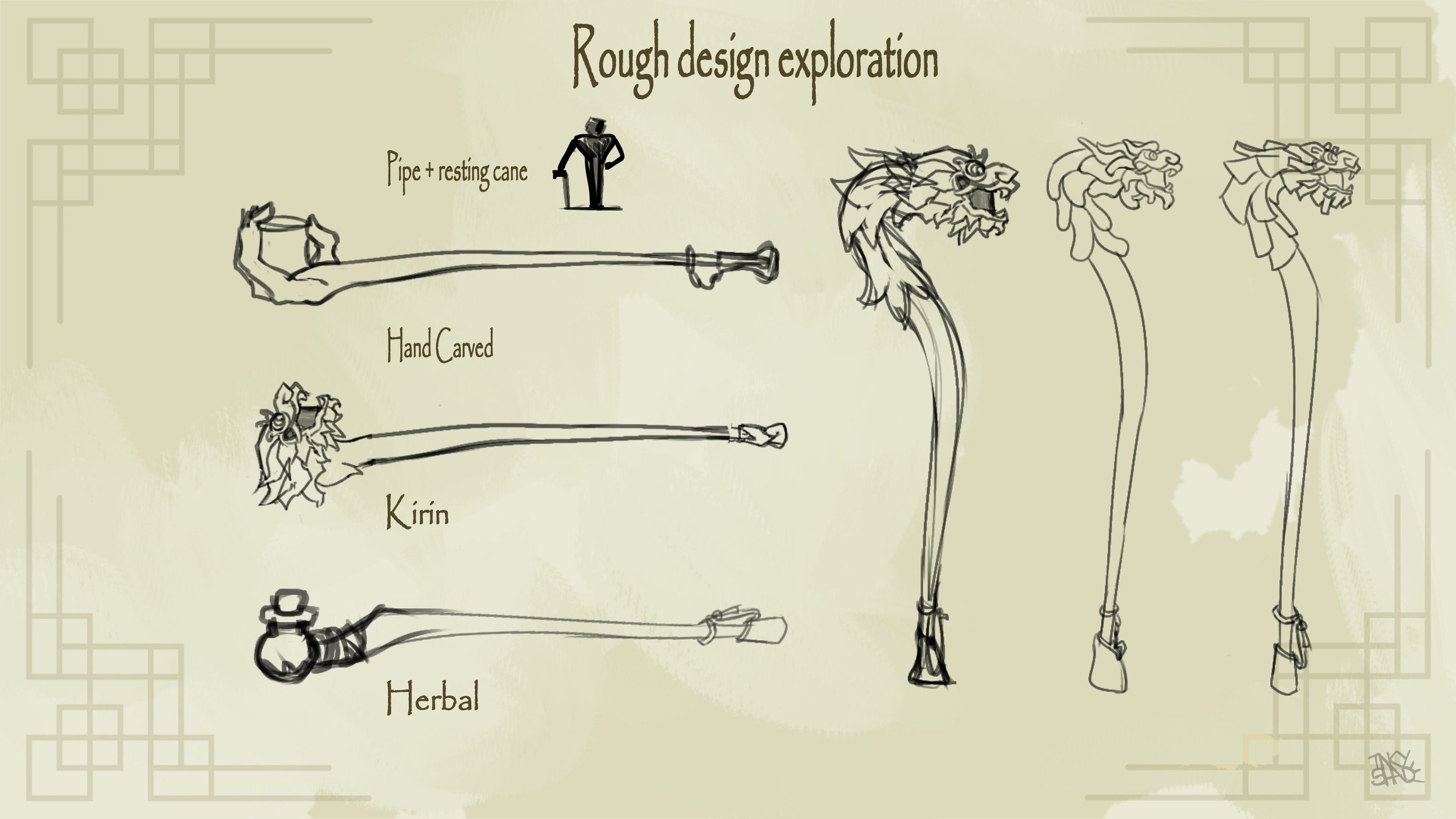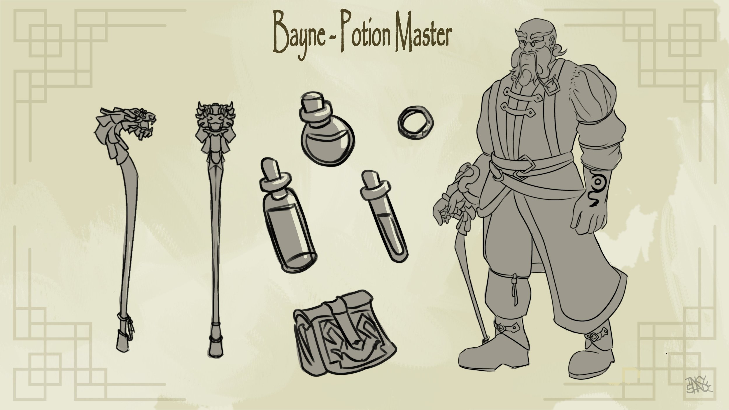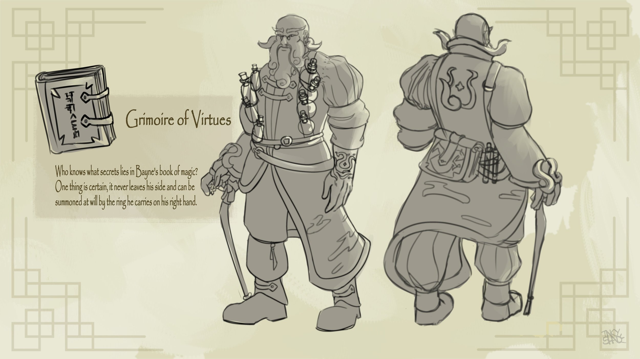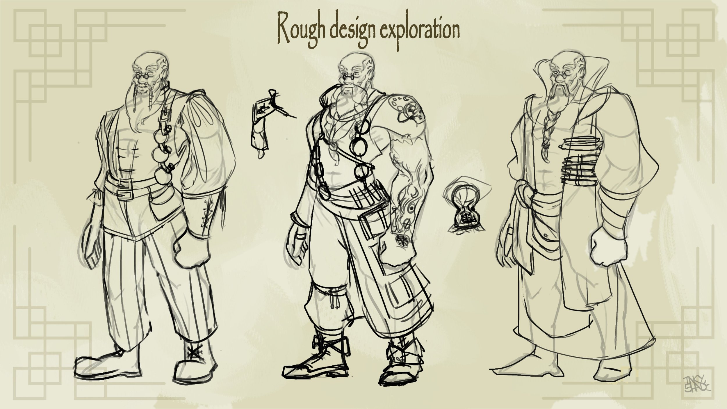 CHARACTER - Bayne Voilà quelques sketchs préliminaires pour le personnage de Bayne. J'ai exploré différentes pistes pour ce personnage, d'abord d'inspiration médiévale européenne, nordique,et steampunk avant de finalement choisir une influence chinoise. J'ai pris comme symbole pour Bayne, le Dragon, qui, étant un symbole de sagesse mais aussi de cupidité me paraissait idéal pour un enseignant de Chaudvent qui garderait précieusement son savoir, ne le distribuant méticuleusement qu'a certaines personnes privilégiées.- 4 réponses