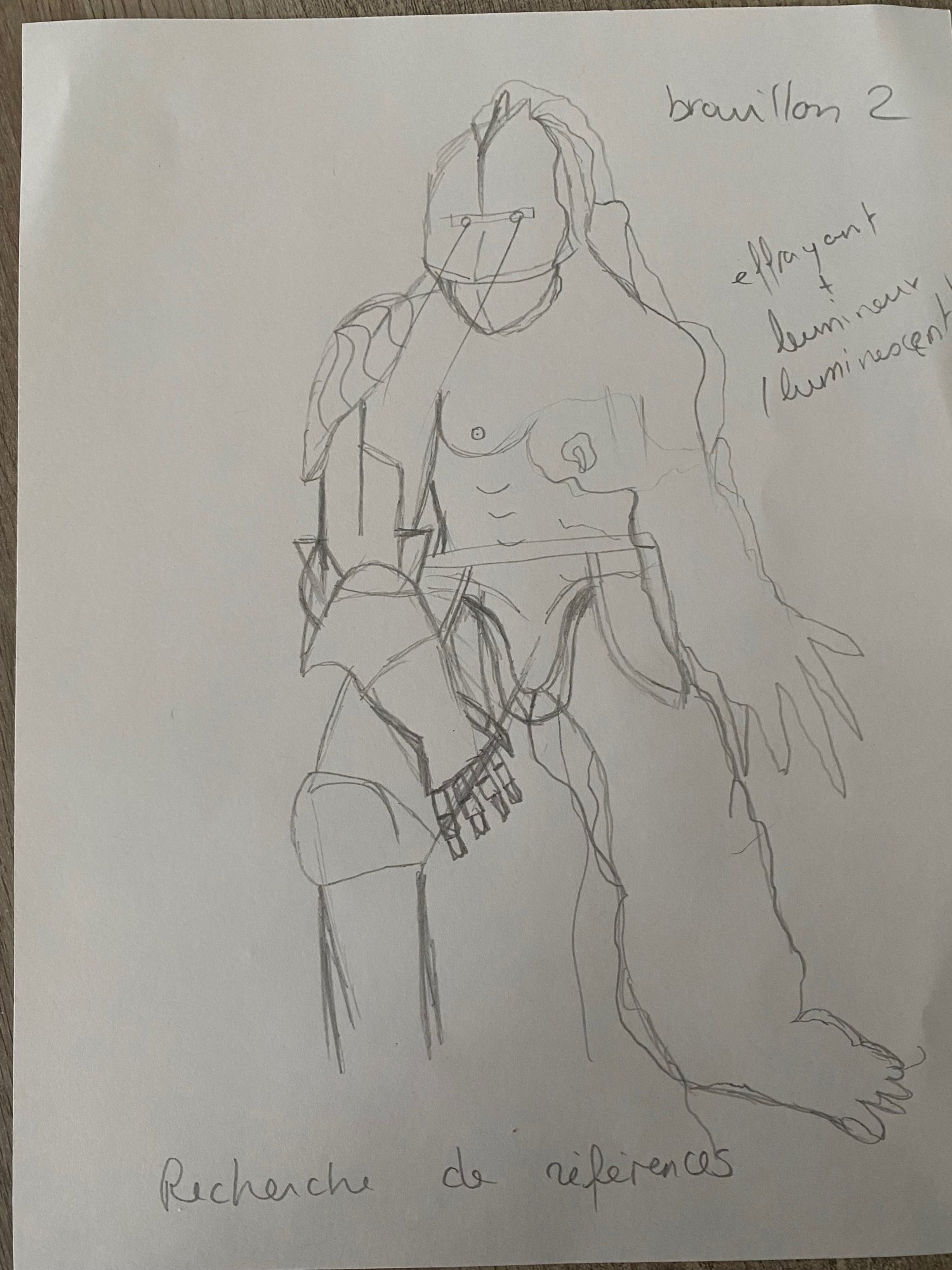 Salut!! jour 2 : j’ai commencé mon brouillon pour le projet no 1. Mon idée commence à sortir. Je cherche des références pour commencer mon croquis. je fais un super vilain avec terme effrayant et lumineux peut-être luminescent si permis. Je poste mon brouillon. maintenant les références! Hyper motivée la dame 😂😂