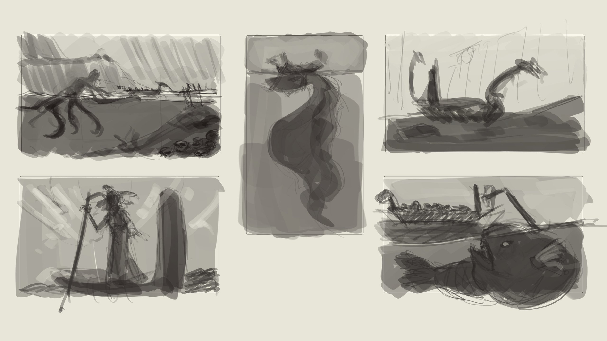 pour ma 1ere participation je pense partir sur "Charon" le passeur des Enfers. J'hésite encore pour savoir si je pars sur un personnage façon "classique" comme un marin sur sa barque ou si je privilégie une version créature façon baudroie ou dragon avec une vue à moitié sous-marine avec une sorte de fusion avec sa barque... quelques thumbnails en vrac pour voir si j'arrive à trouver une composition qui me plaise, n'hésitez pas à commenté ou donner un avis 😉