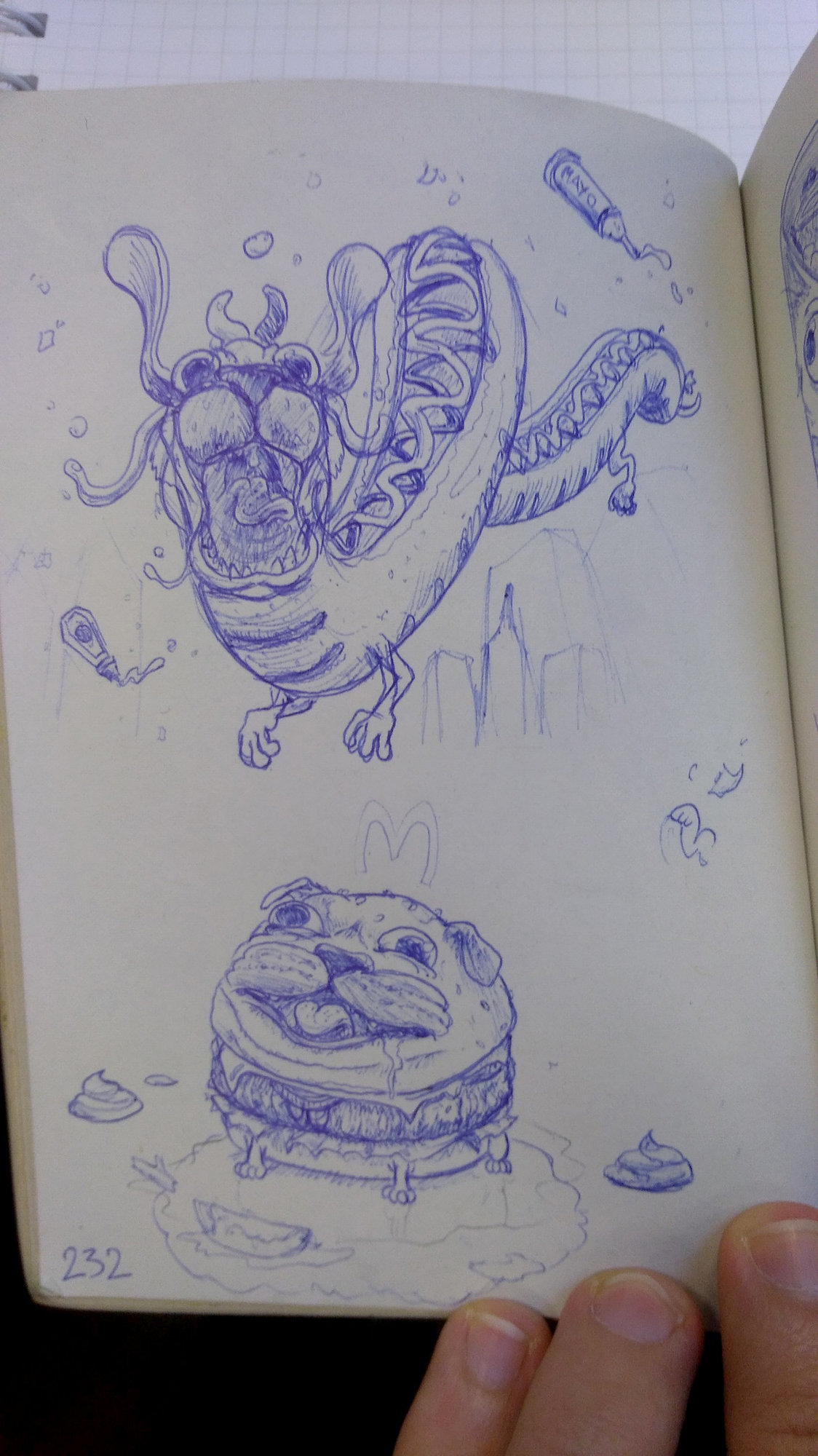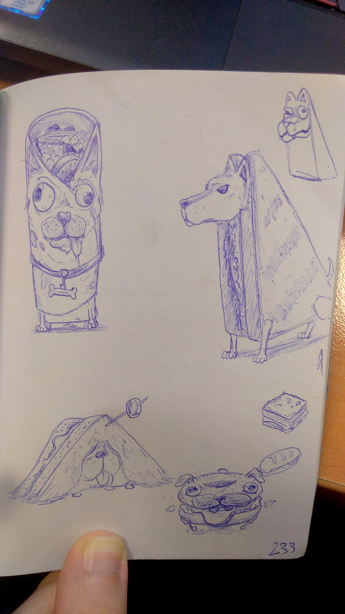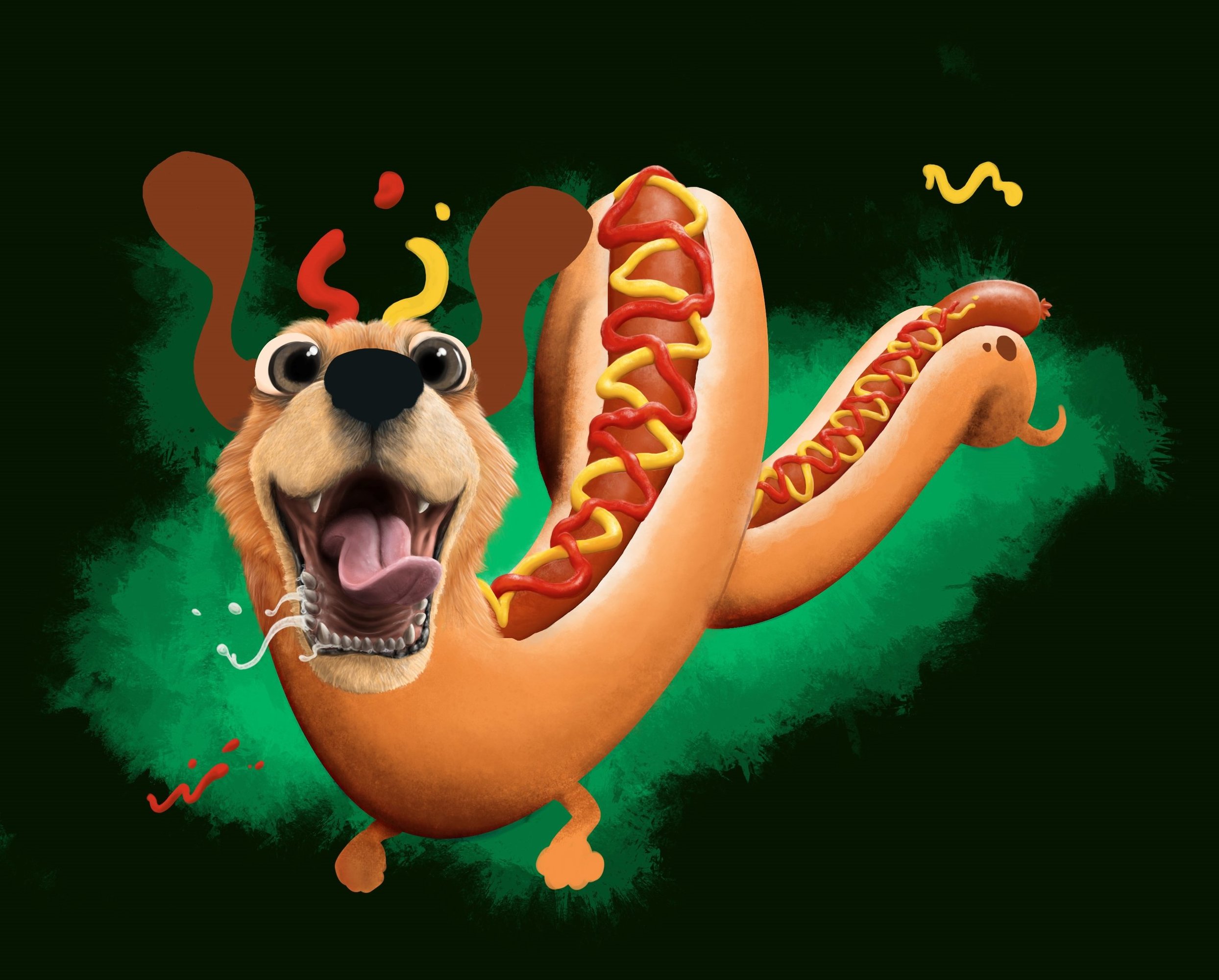 Bonjour à tous ! Je profite du Challenge n°10 pour à mon tour ouvrir mon propre sujet WIP 🙂 J'ai décidé de réalisé en DP un concept que j'avais posé dans mon carnet pas bien longtemps avant l'annonce de l'artbook, laquelle a conforté mon envie de pousser le délire jusqu'à la tablette ensuite. Le délire en question, ce sont des chiens croisés avec différents sandwiches, de sorte qu'on ne distingue pas l'un de l'autre, des hybrides donc 😄 Pourquoi cette idée ? Déjà, ça conjugue deux choses que j'aime particulièrement, les chiens, et les trucs gras qui se mangent. Et de l'autre côté, j'ai pas grand chose dans mon portfolio qui ne soit pas du fan-art, donc c'est l'occasion de taffer sérieusement sur un concept personnel plutôt que de le laisser au stade éternel de croquis. Le sujet est difficile à caser dans une thématique particulière autre que "Inclassable", mais tant pis si jamais ça ne passe pas à la fin, je pense bien m'éclater dessus et c'est là le principal (c'est le cas jusqu'à maintenant). Bref, assez de mots, place aux images ! Les croquis en question. Le hot-dog a lancé le truc, les autres ont rapidement suivi. D'ici la fin du Challenge, j'espère en proposer au moins deux, maximum 3, selon comment j'avance dans le temps. Le Bulldog-Burger sera le second, et le troisième sera sûrement le Wrap avec son maïs dans la cervelle, même si j'hésite avec le sandwich triangle et son olive. Et niveau DP, entamé début semaine dernière et avancé ce week-end, j'ai ça : Je me suis attardé sur la texture des sauces et la gueule du chien surtout, il reste encore pas mal à faire mais je suis content du rendu pour le temps passé dessus. L'utilisation de références photos aide énormément aussi faut dire, mais j'ai encore mon habituel travers de commencer par certains détails plutôt que de viser le global d'entrée de jeu... Je pars sur un fond assez neutre car j'ai pas vraiment d'idée pour ce dernier, mais d'un autre côté je me dis que c'est pas mal de l'avoir neutre si je veux donner le même aux suivants et en faire une série. Dans tous les cas, si vous avez des retours ou des critiques à faire dessus, je suis preneur pour la suite ! Et merci d'avoir lu 😉