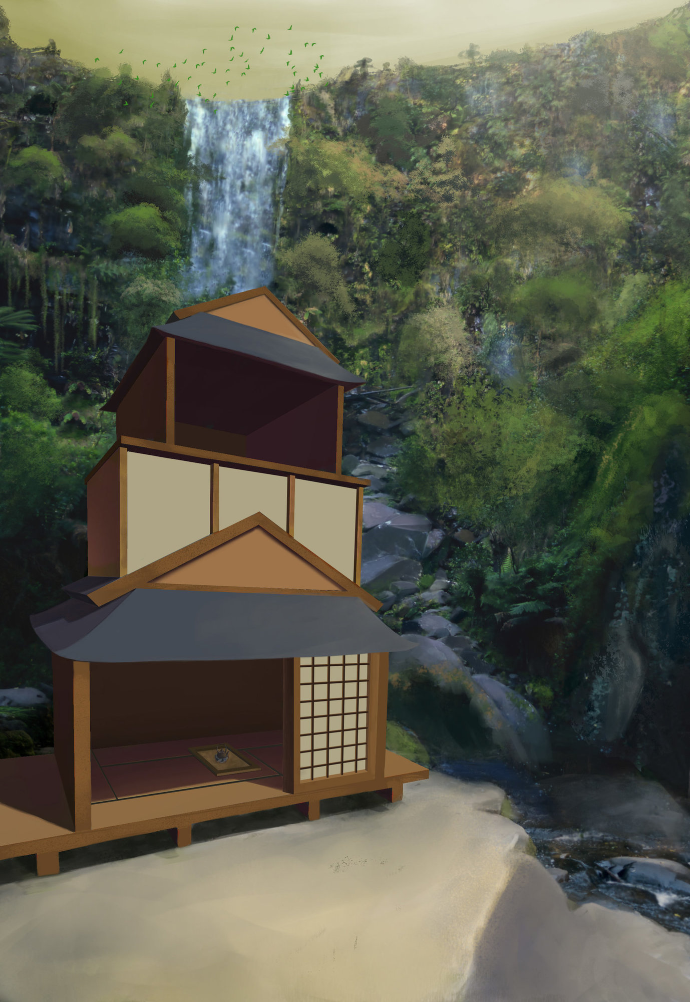 hello tout le monde, J'ai hésité mais je me suis décidé à poster mes travaux pour le challenge. Alors juste pour donner l'idée de base, le confinement je l'ai très bien vécu pour ma part 🙂 du coup ma maison imaginaire serait dans un environnement assez reculé de la civilisation^^ parce que ça m'a fait vraiment du bien cet arrêt forcé de la société actuelle. Donc maison ou plutôt cabane en mode hermite... Donc comme il s'agit pour moi, non pas de gagner à tout prix mais plutôt d'expérimenter pour l'occasion, j'ai commencé avec une base 3D fait dans photoshop (j'avais jamais essayé) avec un très bref croquis par dessus histoire de guider un peu. Pour la suite, je suis parti sur un bg à partir de photo. Là aussi c'est pas dans mes habitudes Après un paintover, ça donne ça Et au final j'ai changé d'ambiance sur la fin. Je pensais rajouter des lanternes orange histoire d'avoir une jolie complémentaire et renforcé la focale...voilà où j'en suis pour le moment 😉