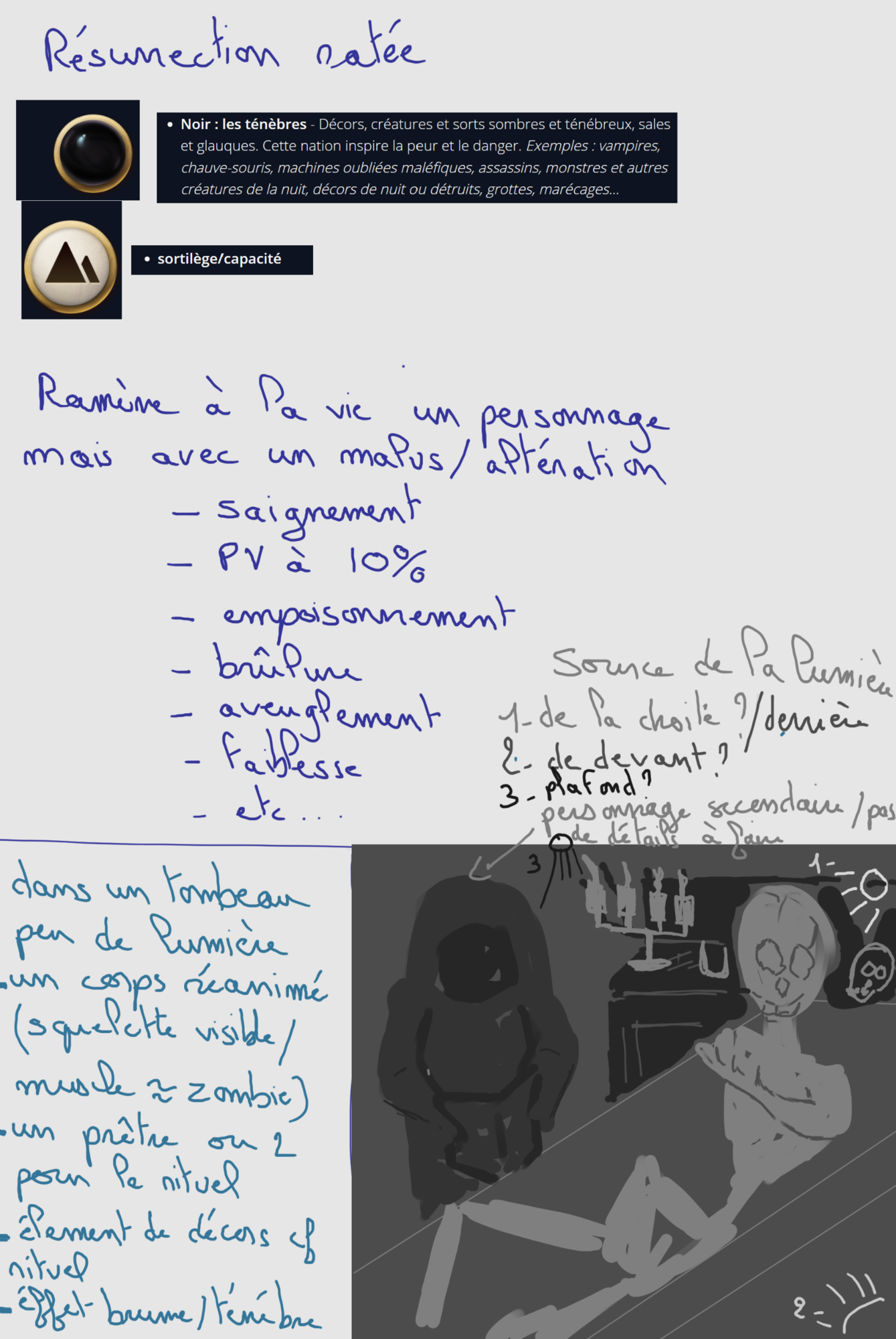 Hello, Voici mon WIP autour de mon idée, une carte sortilège résurrection ratée. L'idée est de pouvoir ressusciter le personnage mais avec un malus/ altération qui pourrait être définis au hasard ou selon une règle prédéfinis. Exemple, type de créature ressuscité un homme pourras saigner mais un golem se sera plus compliqué ! Pour cela la carte sera autour de la couleur noir pour le côté manifestement glauque. Je suis parti sur l'idée de dessiner la résurrection raté d'un humain mais ça pourrait évoluer. Le personnage devra être à moitié décomposé mais à partir d'un corps "sans défaut". C'est le fait de raté le rituel qui devra abimer son corps. Je voudrai transmettre la surprise/ étonnement et inquiétude dans ce personnage. Pour le lieu je pense à un tombeau, peu de lumière et un second personnage, un prêtre pour pratiquer le rituel. Je pense aussi à des éléments de décors pour la réalisation du rituel mais je me demande si c'est vraiment utile... Je vais devoir travailler l'anatomie pour ce challenge :s