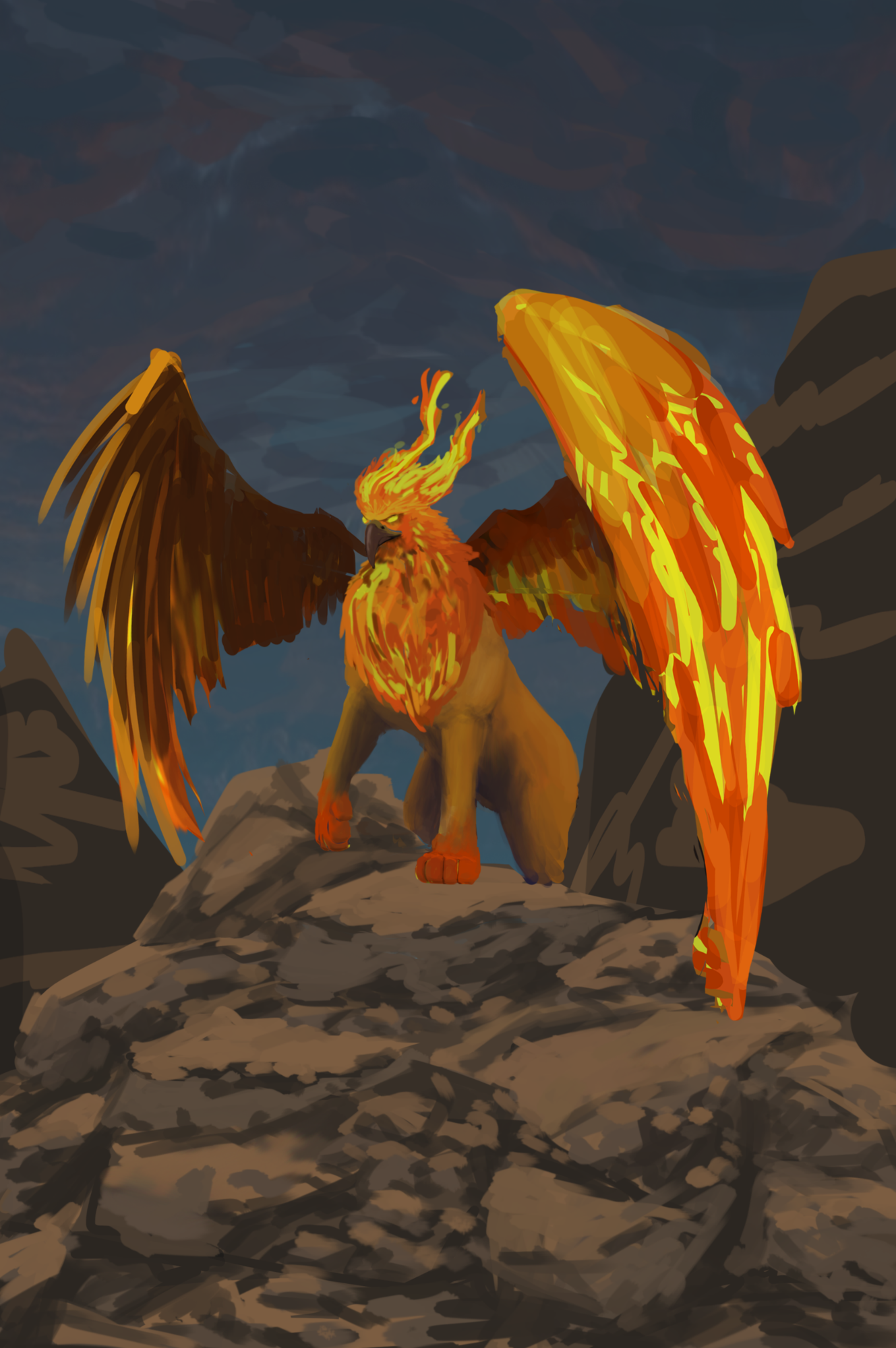 Voilà j'ouvre mon petit sujet aussi, maintenant qu'il faut mettre les bouches et doubles pour finir à temps xD J'ai passé déjà une certaine quantité d'heure sur ce dp, j'y vais à mon rythme sans me presser. C'est un peu expérimental car je n'ai passé que très peu de temps sur le "line", et je suis passée en forme tout de suite, ce qui n'aide pas forcément pendant le rendering... Mais bon j'ai commencé comme ça et je m'occupe de chaque partie petit à petit ^^ Voici donc mon griffon lion-phoenix, probablement assis sur un volcan