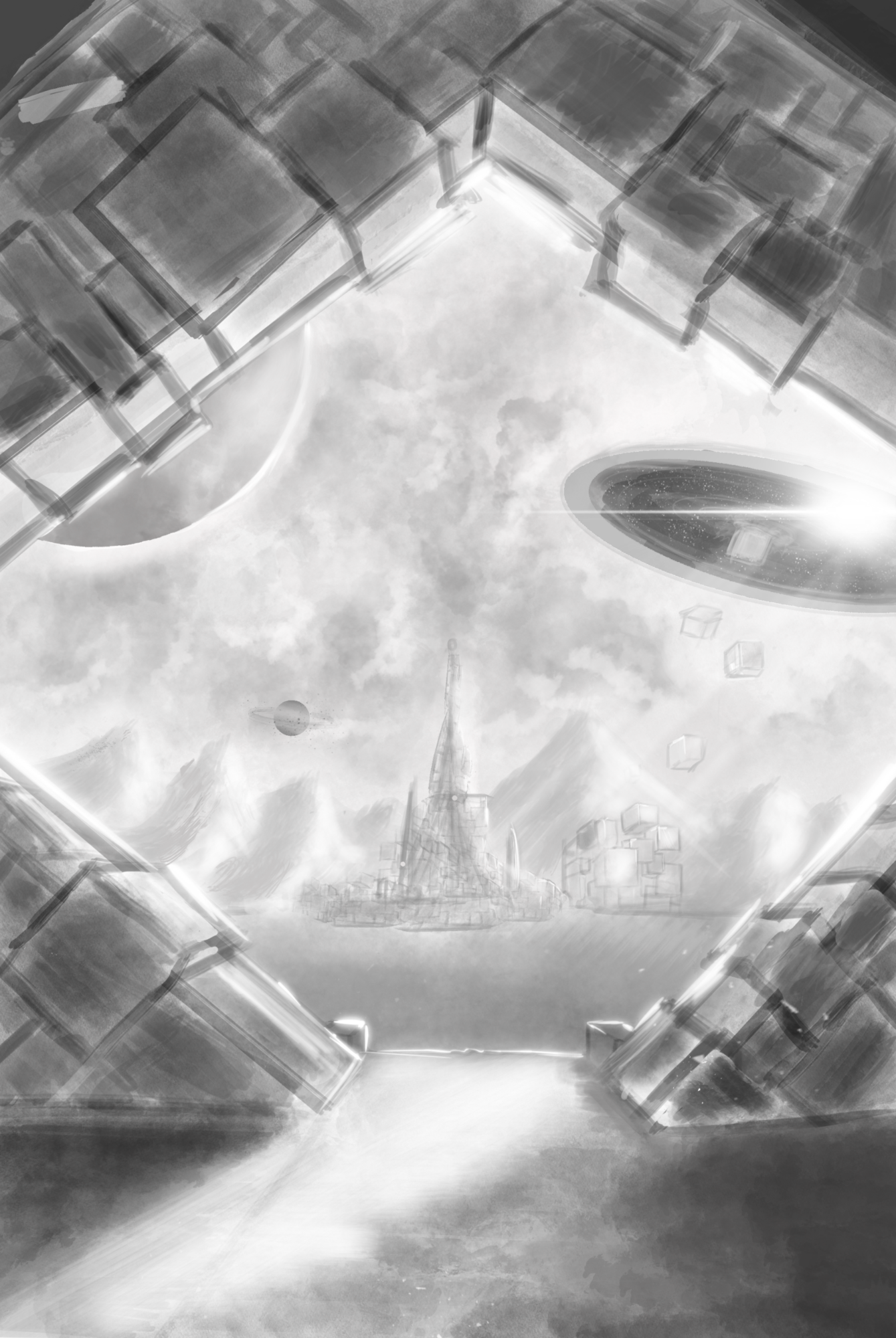 Hello à tous voici un croquis pour ma première carte qui sera intitulée « renfort de troupes » - elle fera partie des violets et représenterait la race des anciens qui depuis leur planète regroupe des cargos en partance pour la guerre. Ils passent le portail pour voyager et rejoindre les champs de bataille. Je la voie plutôt comme une capacité des violets donc carte de sort. merci pour vos avis