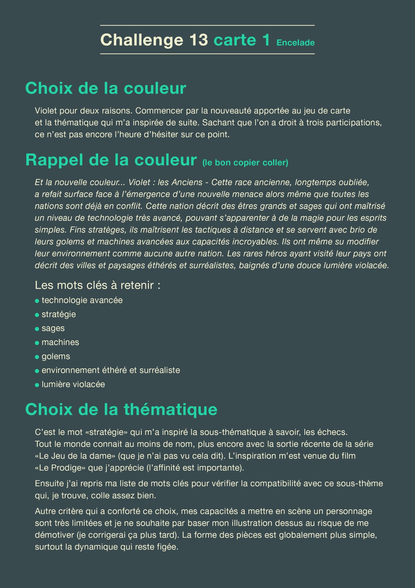 Bonjour à toutes et à tous. J'ouvre enfin un sujet dans cette partie du forum. Bien qu'ayant plutôt l'habitude de "digital peinturer" de mon côté je pense que le partage est plus bénéfique. Cela me motivera peut-être à ne pas rester de longues périodes sans rien produire et commettre moins d'erreurs 😁 Je vais l'inaugurer avec le challenge 13 (ouai, ça, ça motive haha). Pour ce premier post j'ai choisi de partager tout mon process de réflexion pour ma première carte (il pourra évoluer). Bon pavé 😉