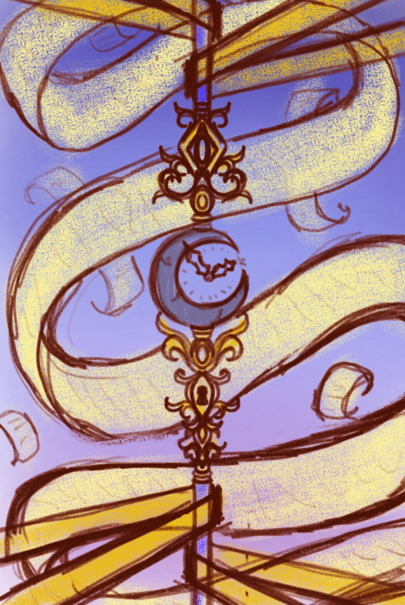 Hello o/ Voici mon petit sujet wip pour le challenge n°13 ^-^ Pour le moment je vous présente un peu mon idée...si j'arrive à aller au bout ça serais vraiment cool...c'est mon 1er wip sur le forum. Et mis à part celui des fanart ^^ c'est mon premier grand challenge donc voilà je tente le coup x) J'ai choisis la nation violet, et j'ai pour projet de réalisé 2 cartes pour le moment (j'ai éventuellement pensé à une 3eme carte mais déjà si j'arrive a faire les 2 première ça sera déjà très bien pour moi ^^) ...Mon idée ça serait d'avoir des cartes qui ne sont pas utilisable l'une sans l'autre dans le jeu et que leur pouvoir ne sera activé dans le jeu seulement et seulement si elles sont toutes "invoqué" sur le terrain....J'ai donc pensé à un système de clé/serrure ....j'imagine qu'elles entrent dans la catégorie "sort" ...Comme il s'agit de la nation des anciens l'idée que j'ai imaginé c'est qu'ils ont accumulé beaucoup de connaissance et de savoir depuis les temps anciens et que celui ci a été sceller et que donc, ce savoir, une fois libérer, puisqu'ils sont de "fin stratège" comme ça été dit dans le descriptif de la nation, donnera une puissance d'attaque et de défense énorme dans le jeu qui pourra tout changer....Pour mes illustrations je vais plus partir sur le fait, comme ça a été dit dans le descriptif de la nation, que leur niveau de technologie très avancé s'apparente à de la magie et donc je ne vais pas faire quelque chose de futuriste ou de très machine je pense mais plus du "magie fantaisiste" Pour le moment voici mes croquis, la 1ere carte que je vais réalisé représentera la serrure et sera "l'entrée de la porte sceller" et la seconde "la clé du savoir" pour le moment ça reste très brouillons..pour la clé je n'ai pas encore le "design" définitif de celle ci mais en tous cas je pense que partirais plus sur l'idée du tourbillon qui libère le savoir et pour l'entrée l'image globale me plait bien pour le moment mais je pense que je vais revoir les ornements au dessus du croissant de lune... J'ai aussi imaginé, que cette nation a réussi à créer une nouvelle source d'énergie à partir de pierre de lune (d'où le croissant lunaire) et le côté horloge c'est plus pour donner un côté temporel en gros comme si on pouvait dénicher un savoir qui provient d'une époque précise voilà j'espère que mon idée n'est pas un peu tiré par les cheveux x) et j'espère ne pas être hors sujet...vos avis sont évidement les bienvenus ^^ -