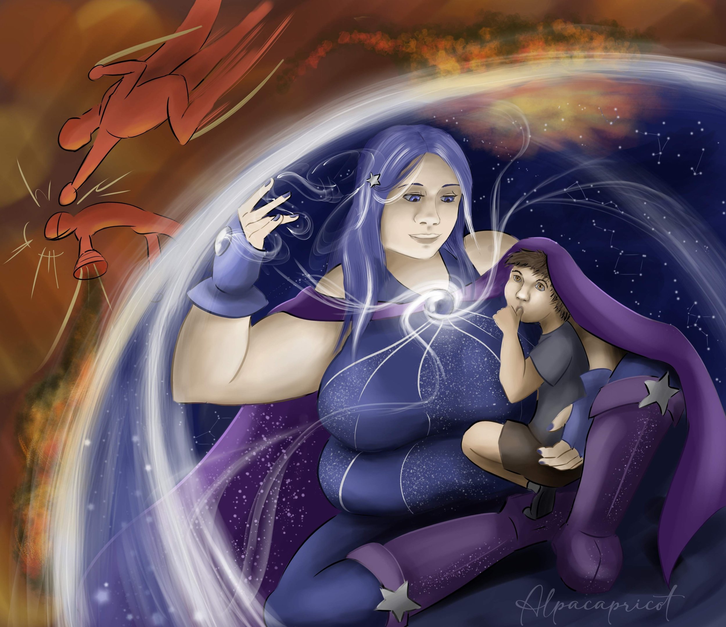 Bonjour tout le monde ! C'est bon, j'ai assez vu mon image, je vais poster ma participation pour m'en débarrasser 😛 Du coup je fais ce sujet pour accompagner la soumission. Premier défi pour moi : Les designs de super héros ne m'inspirent pas spécialement. Du coup j'ai cherché dans mes références ce que j'avais qui pourrait se rapprocher, et j'ai trouvé ces deux séries que j'aime beaucoup (Steven Universe et She-ra). En fouillant parmi les personnages des deux séries en gardant la liste des mots-clé sous la main, j'ai trouvé ces deux persos rondouillets au design un peu similaire. Je me suis dit, c'est parti, je vais faire quelque chose de ce genre. Toujours parce que les superhéros ne m'inspirent pas trop, j'ai pensé à un perso qui n'aime pas tous ces combats plein d'explosions. Le bouclier du personnage de gauche m'a donné l'idée d'une héroïne qui protège les civils pendant les combats. J'avais un concept, et ma première priorité était de choisir une couleur autre que le rose pour m'éloigner de mes références. Niveau chara design, je suis resté sur quelque chose de bateau pour une super-héroine, cape+justaucorps, sinon j'avais peur de partir dans le hors-sujet. Merci les gens du Discord, adorables, qui ont donné des idées à ce stade. C'est en essayant le bleu comme alternative couleur que l'idée du ciel étoilé est apparue. Ça donnait + de richesse au concept, je me suis donc arrêté là dessus. Ça permet de glisser le mot-clé supplémentaire "lumineux", aussi. Le Discord, encore une fois, a été utile à plusieurs reprises pour corrections et paint-over. Merci tout le monde, vous êtes adorables. L'image finale ! Et la même avec les effets de lumière désactivés juste pour preuve supplémentaire que c'est mon travail, si besoin. J'ai beaucoup appris grâce à cette image, ce qui était le but ^^ Merci d'avoir organisé le concours, et bon courage au jury pour la phase de sélection ! Ça en fait des images à regarder !