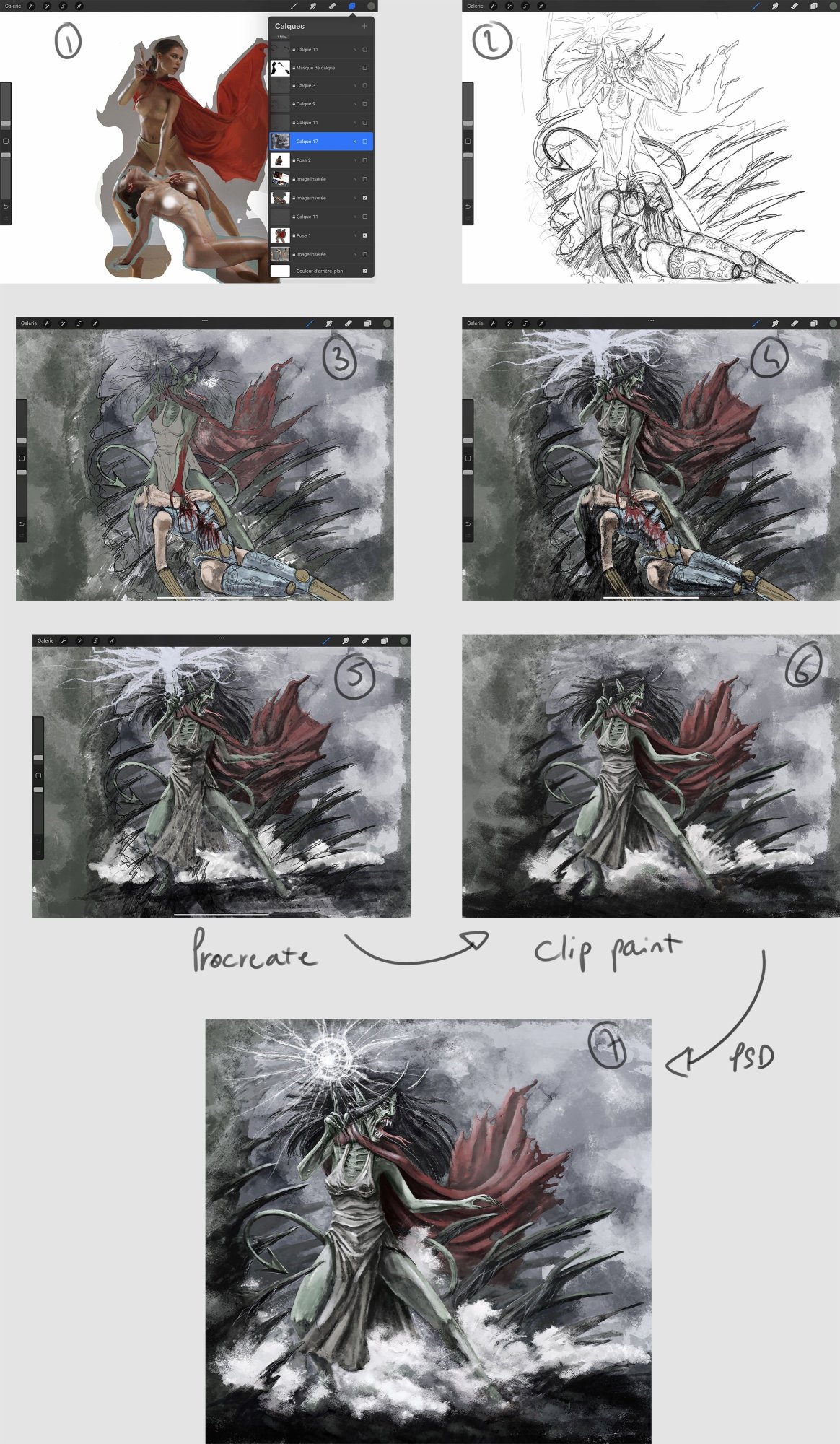 Bonjour à tous. Pour ce challenge, je n'avais pas d'idée précise de ce que je voulais faire hormis que je voulais garder quelque chose de rugueux, texturé. J'ai trouvé le sujet beaucoup plus difficile à cerner que les précédents, alors je suis parti d'une pose intéressante pour voir qu'elle histoire allait en sortir. J'ai commencé sous procreate parce que je n'ai pas beaucoup de temps pour des projets personnels (c'est d'ailleurs pour cela que je fais les concours, c'est comme un projet perso mais avec une date butoir, sinon je n'ai pas le temps ni l'énergie, merci DPS ... 🙂 ), ça m'a permis d'avancer 10/15 minutes par ci par là. Ensuite clip paint que je préfère largement à photoshop, la sensation de peindre et dessiner est nettement supérieure. Enfin photoshop, puisque que pour la manipulation d'image, il reste la référence. J'ai utilisé la brush hartz sous procreate et le pack marc brunet sous clip paint. Bonne chance à tous.