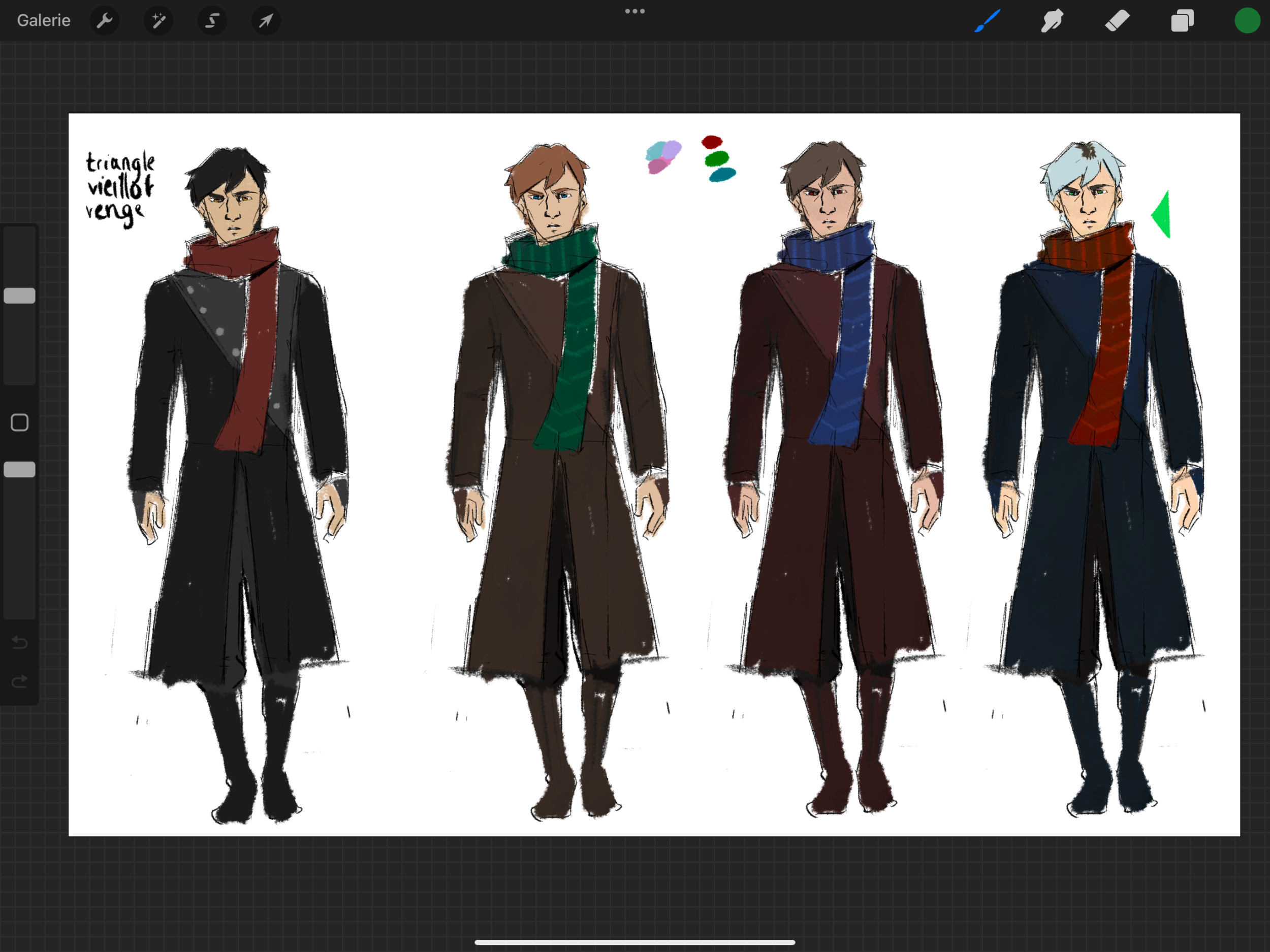 Bonjour par ici ! Je voulais partager mon avancée et mes recherches pour le challenge de cet été, j'ai été pas mal inspiré par le thème !! J'ai suis parti sur deux idées de personnages bien différents, et j'ai fais mes premiers test sur un vieux carnet (désolé pour la mauvaise qualité d'ailleurs). Ma première idée était de partir sur un super vilain / anti héro inspiré par des formes triangulaires (je trouve que le triangle donne vraiment cette impression de danger donc je voulais exploité cette forme pour un vilain). Et pour sa palette de couleur j'ai fais plusieurs test sur un brouillon de charadesign parce que je voulais éviter de partir dans le cliché de faire un vilain en rouge et noir. Pour le deuxième personnage maintenant j'étais sûr de vouloir partir sur un super héro pour contraster avec le personnage précédent, et donc cette fois exploité des formes plus ronde et me servir du mot "cercle". J'en suis rapidement venu à l'idée d'intégrer une sorte de casque d'astronaute pour que le cercle soit omniprésent dans ma future composition. Puis encore une fois j'ai fais des tests de couleurs pour pouvoir avoir une palette originale !
