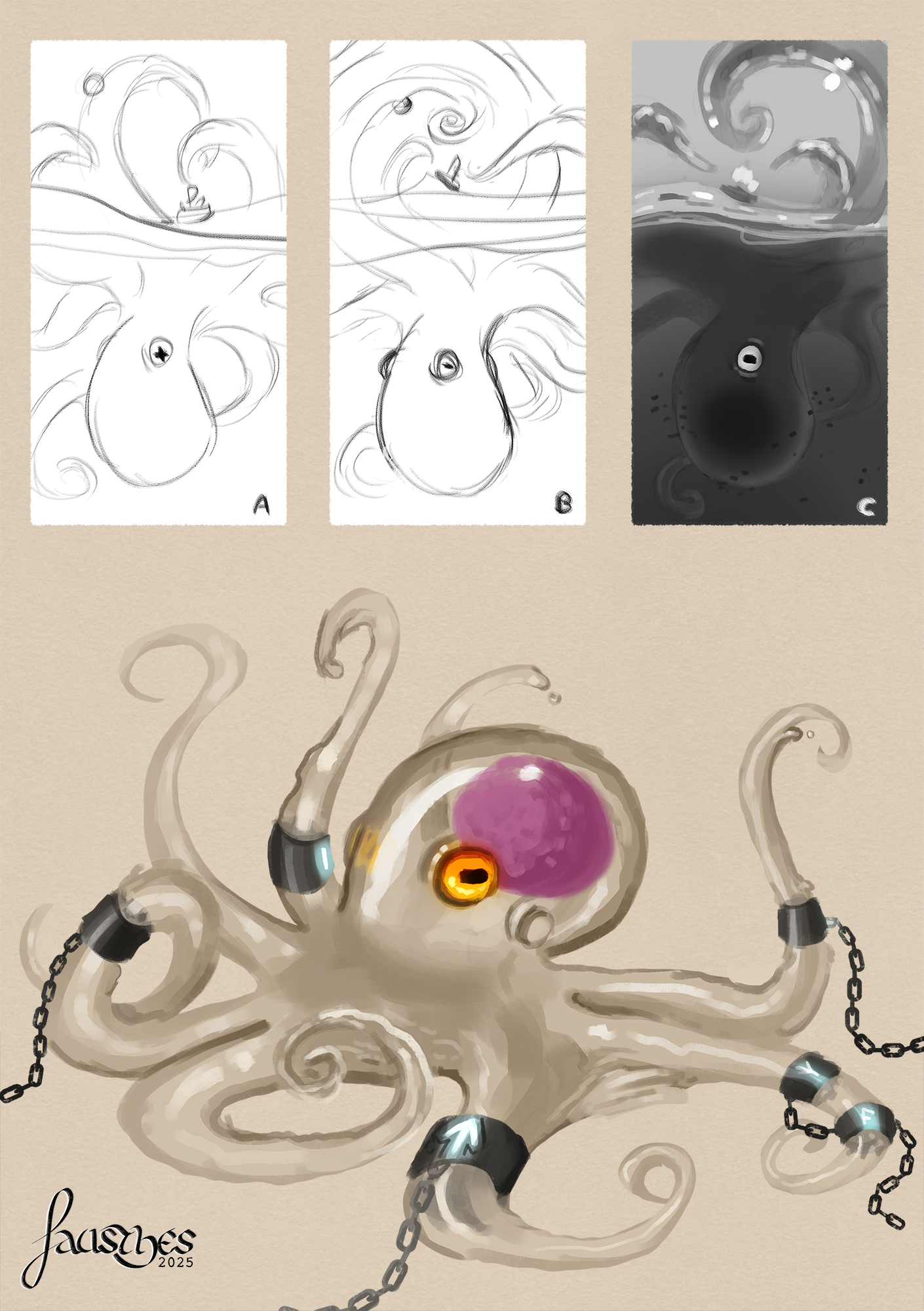 Bonjour ! Très très hype par ce challenge ! Je part sur le Kraken ! Ma version est en quasi totalité faite d'eau. Pour le petit lore derrière mon idée : L'idée c'est d'avoir ce Kraken qui appartenait a la faction des Vikings se rebeller contre ses geôliers. J'espère que l'idée vous plaira ! J'ai commencé quelques thumbnails ( toutes assez similaire car j'avais une idée assez précise en tête ) et un début de concept ! N'hésitez pas a me donner vos retours ! 😄