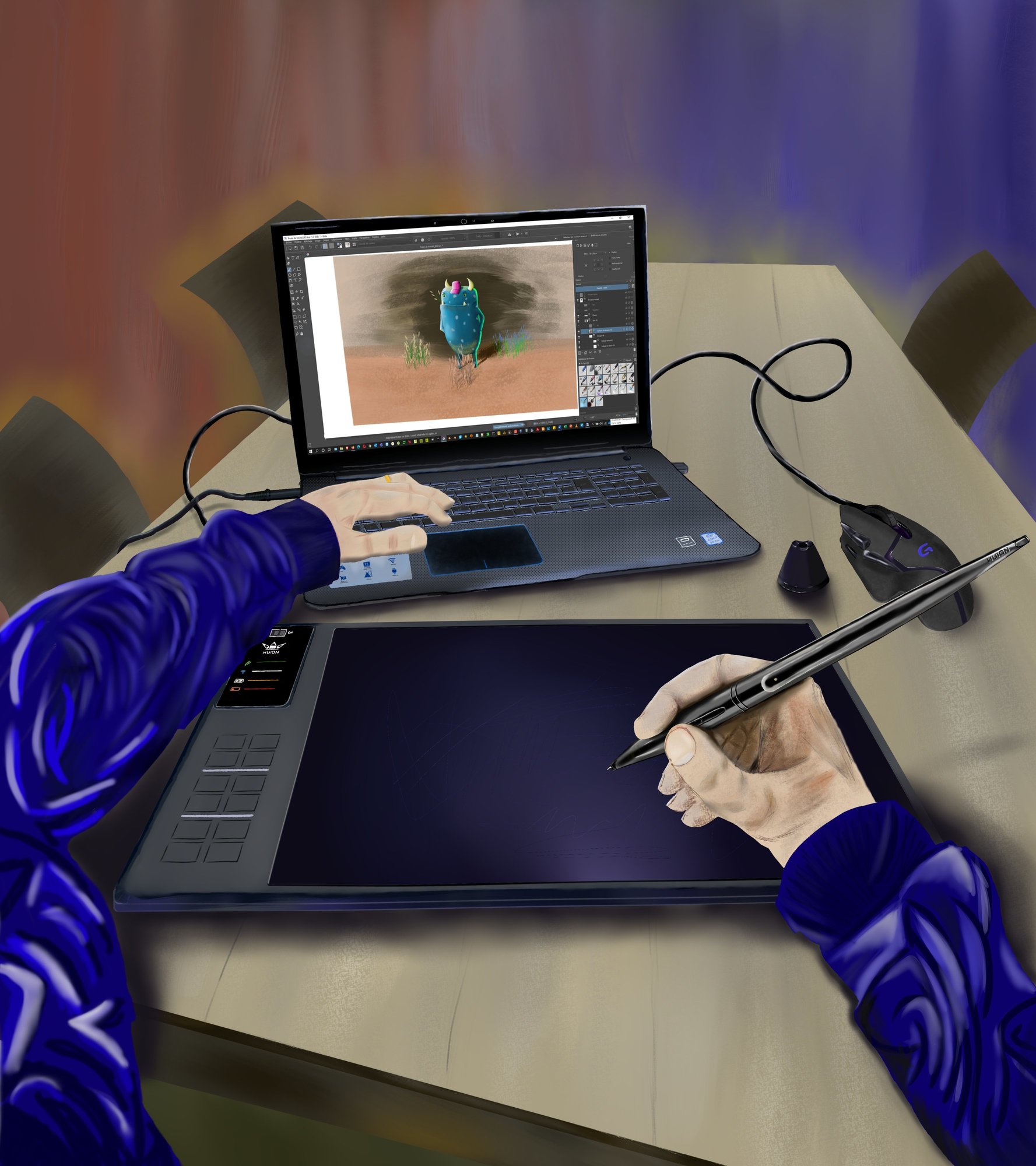 Bonjour, Je ne mettrai pas comme titre mon premier paint, puisque j'ai commencé par le tutos sur Krita et ai posté celui-ci. En mal d'inspiration, et pris de court en termes d'idées, j'ai fait au plus simple et me suis représenté (un peu) en train de faire le paint de ce chapître. Je me dis que j'ai peut-être essayé trop fort, mais bon, cela m'a permis de m'exercer sur les couleurs et textures, en mélant un peu d'organique à de l'inorganique et de faire un petit clin d'oeil à mon Krita-monstre 😈. Je me réjouis de poursuivre et de travailler à m'améliorer, donc à très bientôt pour la suite des aventures. -