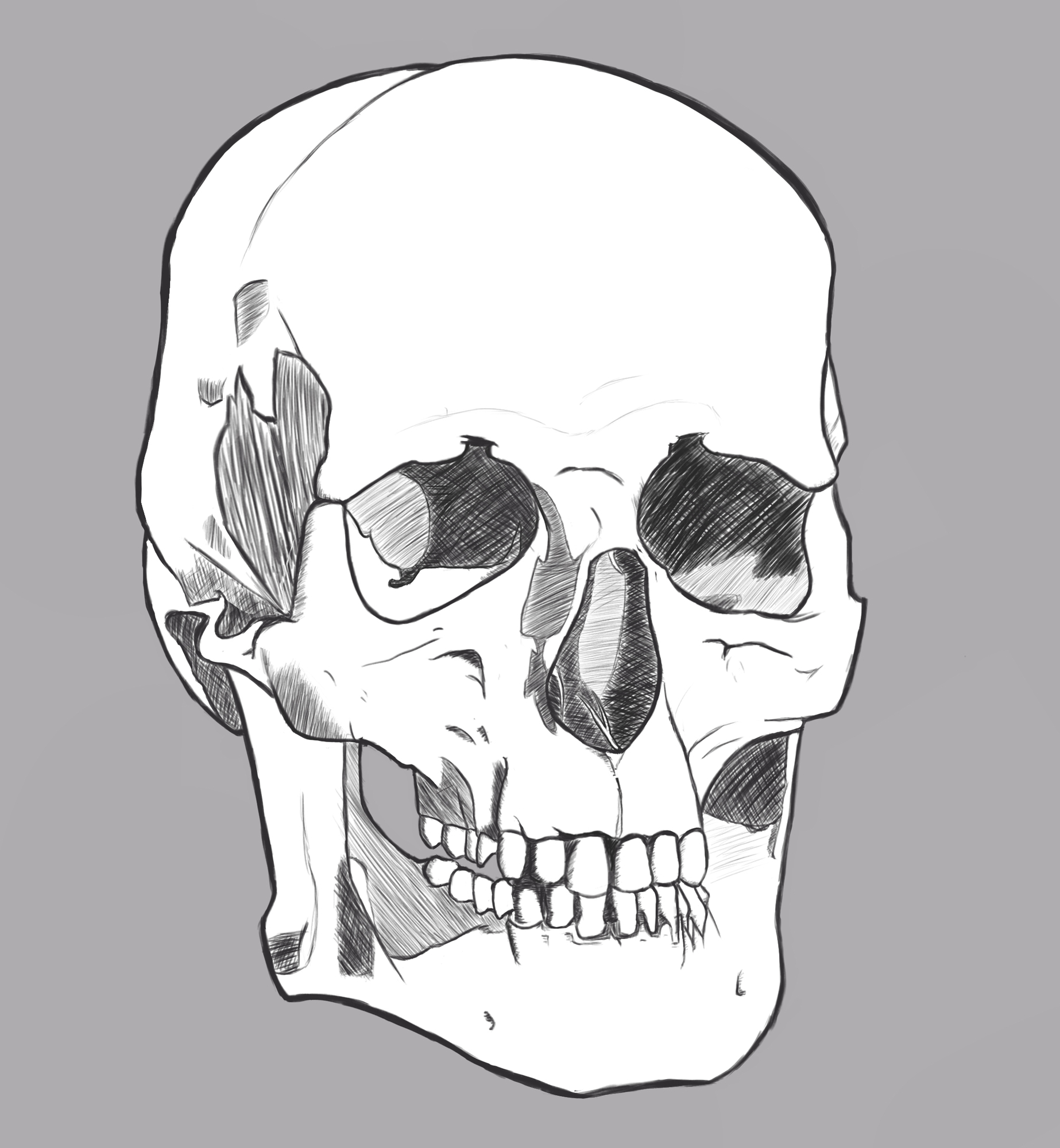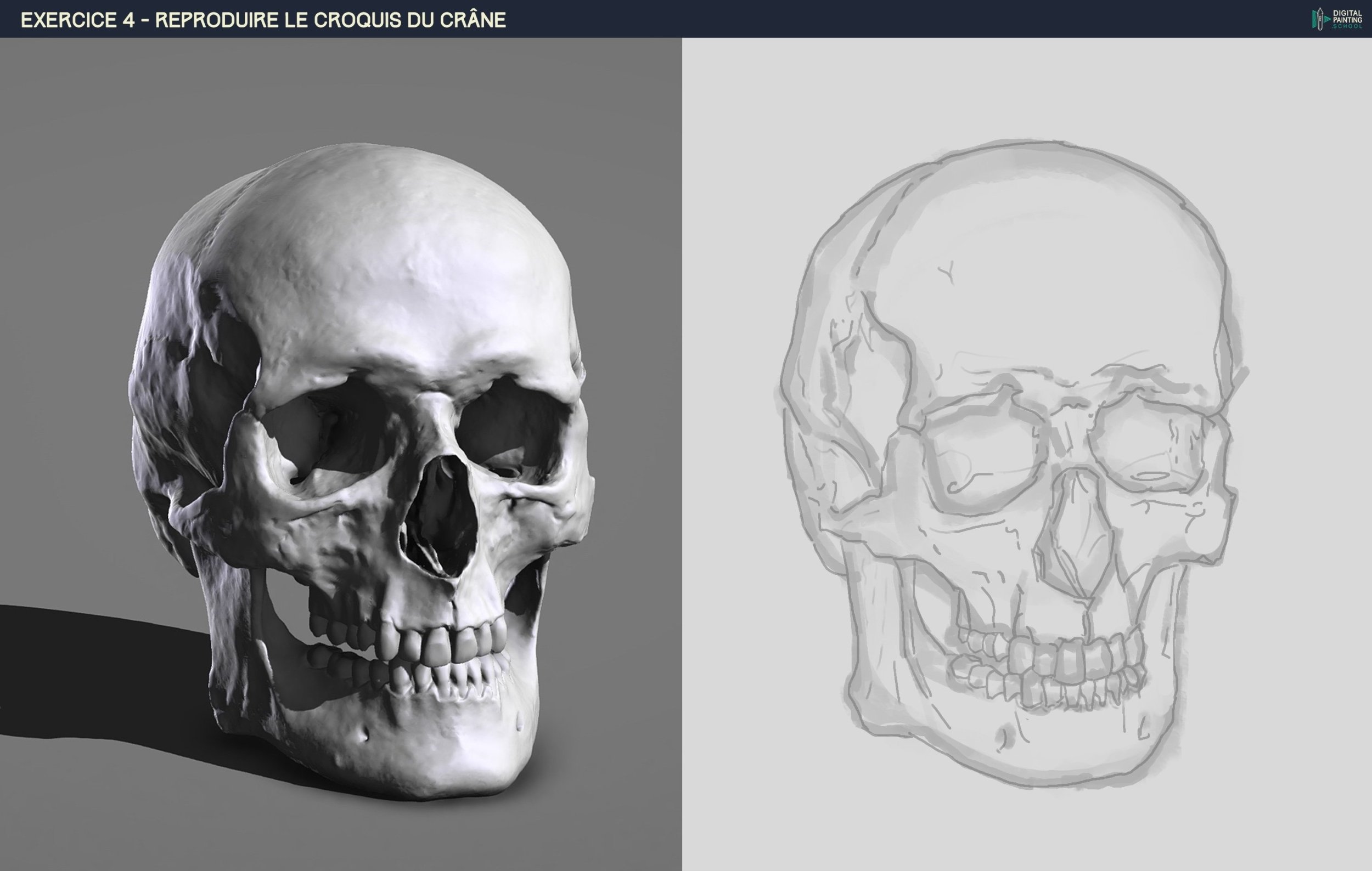 Salut ,bonsoir, je vous partage les différentes étapes de l’exercice du crâne pour ce chapitre. je dois avouer que ça aide beaucoup de décomposer le croquis en 3 étapes, merci pour ces tips et conseils ! bon j’ai comparé avec le layer de @Spartan de DPSchool, j’ai un peu plantées les proportions et je me suis clairement emballé sur les hachures sans bien gérer les contrastes.. c’est un souci que je rencontre également en dessin traditionnel (gestion des contrastes des niveaux de gris dans l’ombrage). je dessine beaucoup mais j’ai le sentiment qu’il me manque des éléments clés pour vraiment progresser ! Je poursuis donc pour découvrir tout ça au fur et à mesure ! À bientôt, jean.