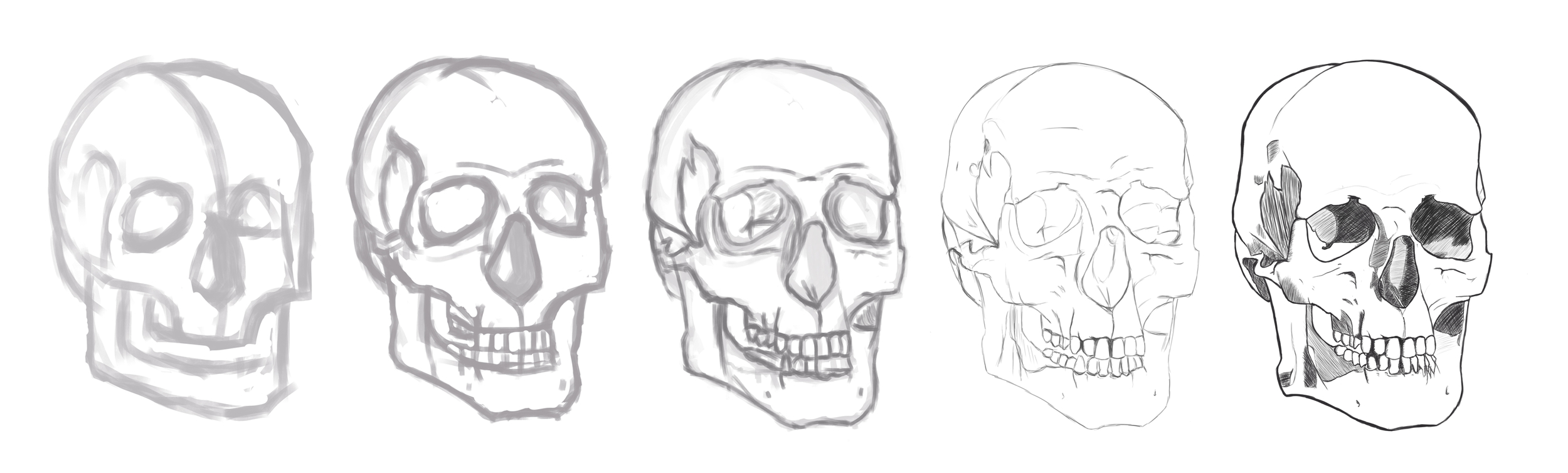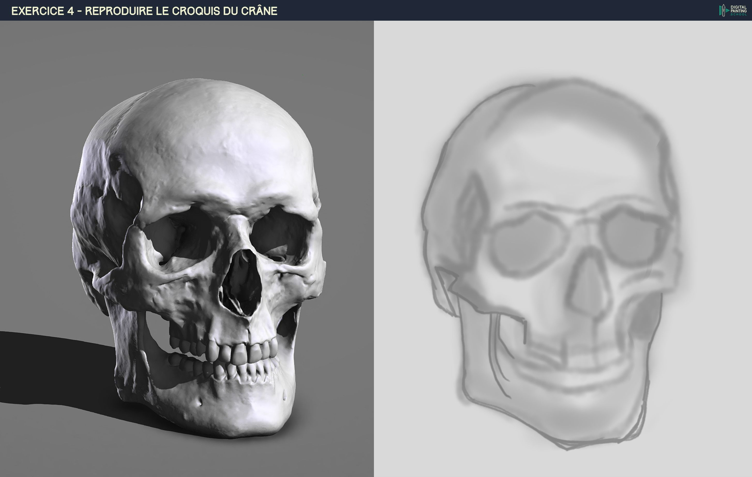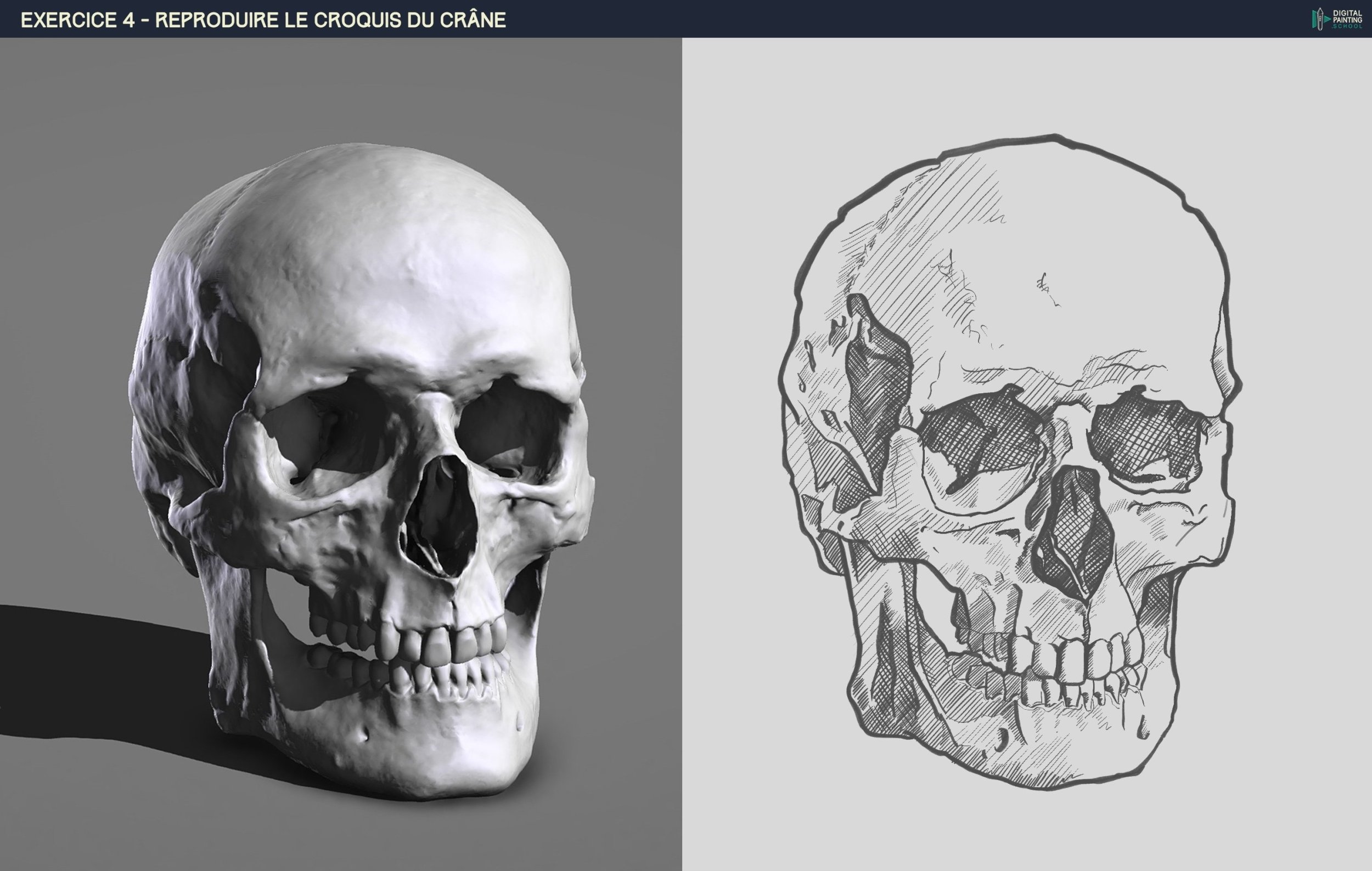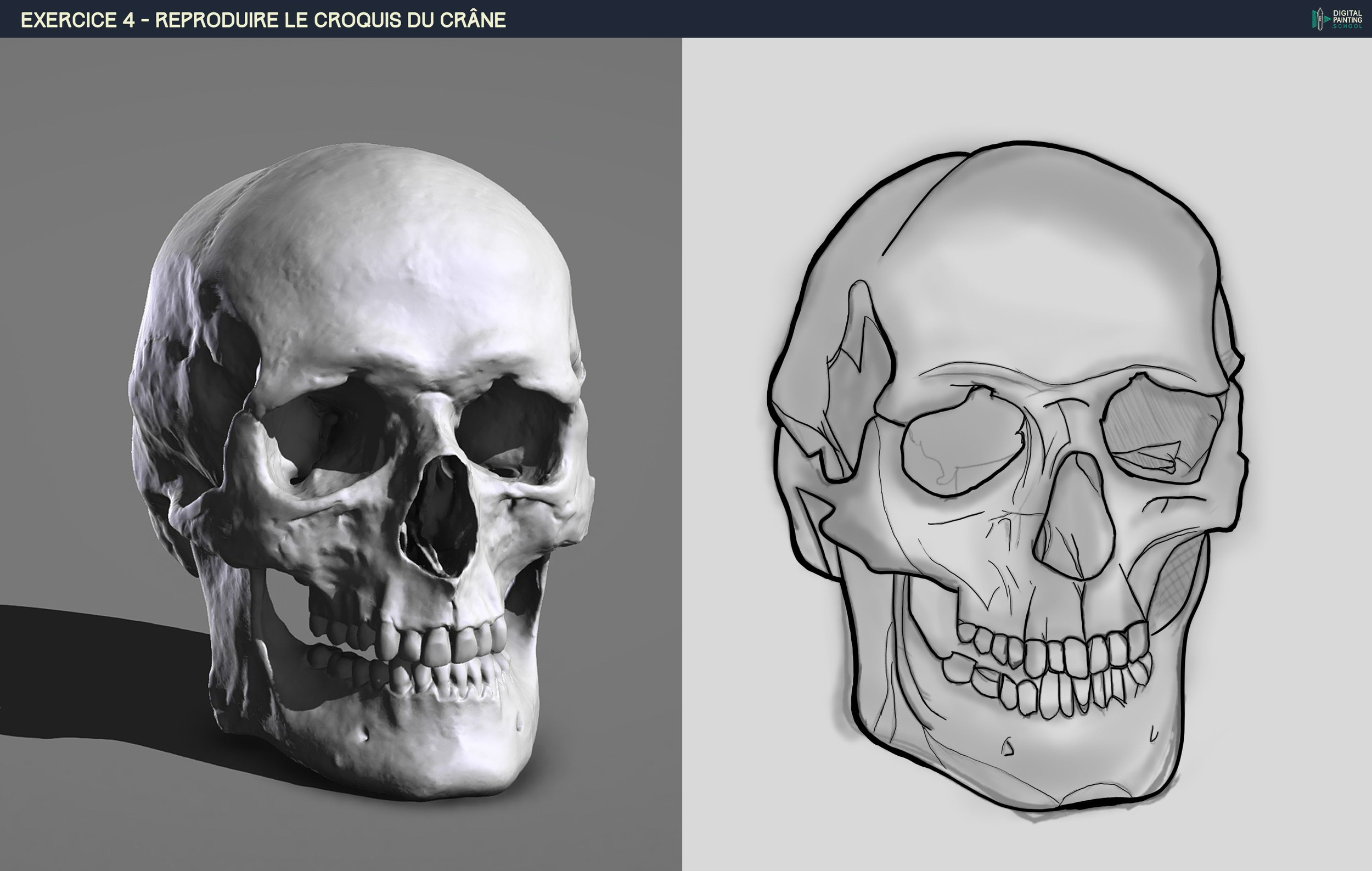 Bonjour, voici ma version de l'exercice du croquis du crane avec l'évolution du croquis puis la version finale.