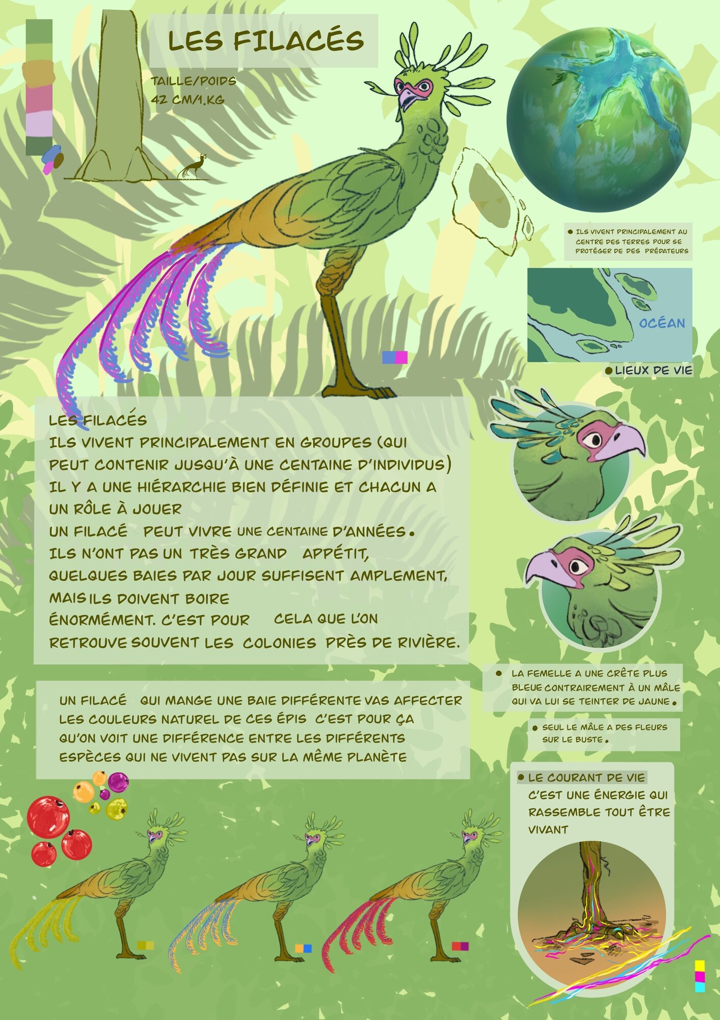 Bonjour à tous, Donc conformément au règlement, je crée un sujet de forum pour présenter le WIP de ma participation. Désolée ce n'est pas très "participatif", vu que j'ai déjà fini. J'ai plutôt cherché les retours avec quelques camarades sur Discord (merci à eux 🙂). Je suis parti sur du concept de créature (wouah surprise !). J'ai choisi les Filacés. Donc commençons par les refs : Côté Animaux réels : Refs de concepts existants : Et enfin quelques refs enviro. C'est surtout venant du désert du Danakil en Ethiopie, que je trouve extra classe et cohérent avec les ressources riches en soufre. Ensuite je suis passé par des essais de shapes. Je me suis décidé pour quelque chose d'un peu mi-giraffe mi-antilopes, avec des features cohérentes au mode de vie. C'est plutôt une proie craintive donc capteurs sensoriels assez variées et performants (capteurs olfactifs, 3 paires d'yeux, 2 paires d'oreilles). Les vibrisses, sorte de fils leur valant leur nom, leur servent d'élément de communication, à la façon d'antennes. Éléments défensifs en dernier recours : grosses épines sur les pattes, également sur les ronces entourant l'oeuf. Pour la reproduction je voyais bien une reproduction via du mycélium produit dans des glandes et dispersé dans la terre. A la rencontre de mycléiums d'individus différents (comme les champignons donc pas vraiment de mâles/femelles), l'union des deux va générer une structure se développant en oeuf protégé par un développement d'une sorte de ronce. Voici un résumé du concept : Enfin, après m'être décidée sur une composition, voici les étapes de l'illustration : Voilà voilà, en vous remerciant pour les patients qui sont arrivé au bout du pavé 🙂 Bon courage à tous et toutes et surtout amusez vous bien !