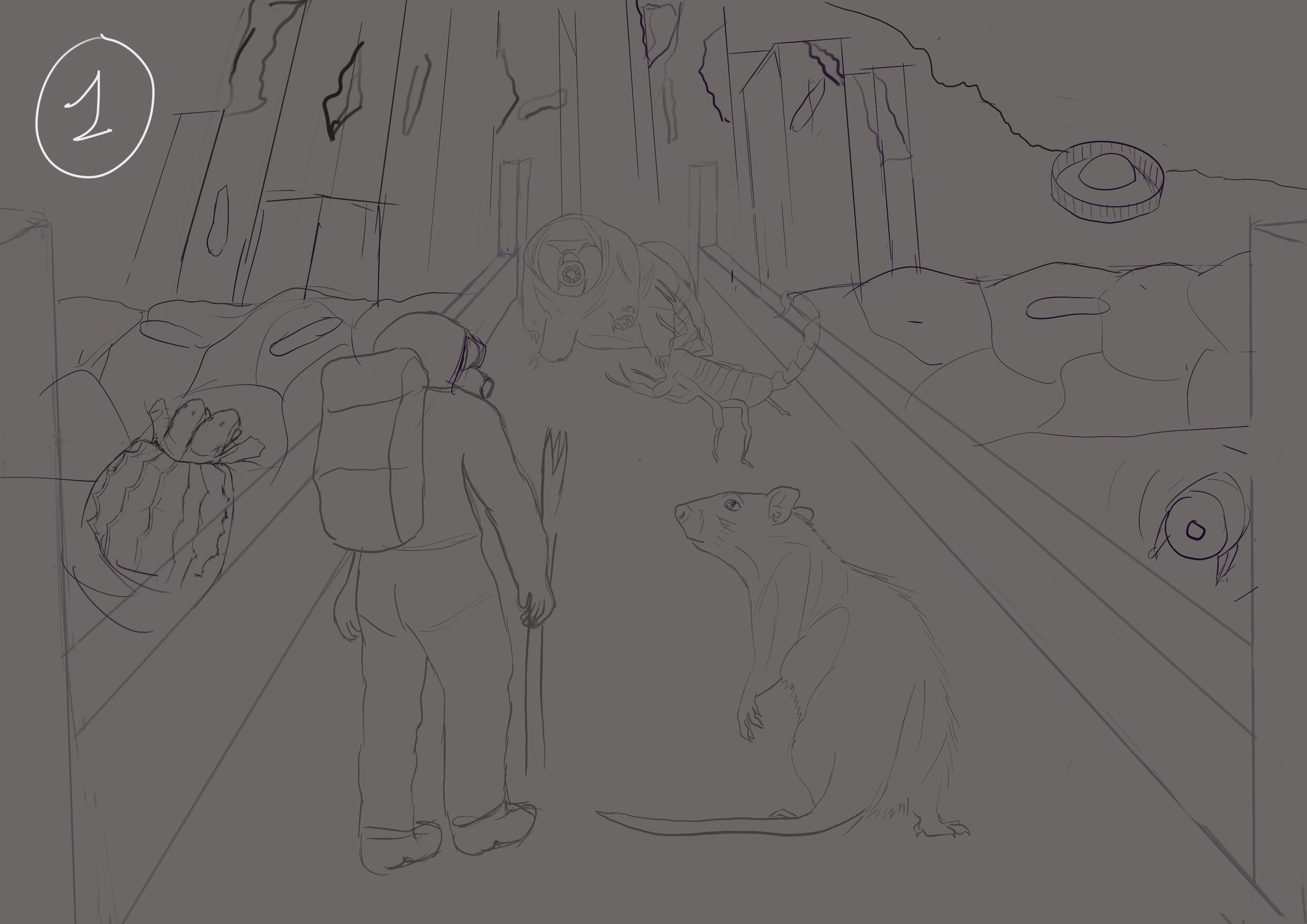 Bonjour à tous, Un grand merci à l équipe DPS et surtout à Leonardus qui je pense est à l origine du sujet. On sait déjà de quel côté il se place… le sujet me plaît beaucoup, il est rempli de possibilité. J ai plein d idées mais il va falloir que je vois ce qui est faisable avec mon niveau en dessin… au début je m étais dit que je ferai du [LIGHT] car je suis plus habituée à ce registre mais au fur est à mesure que les idées viennent et bien le DARK s’impose pour un premier DP. pour le premier DP, j hésitais sur la compo ( je n ai pas encore fait le cours sur le sujet), entre le n°1 et n°2, je penche plus pour le n 1, vos avis? Si j ai le temps pour un 2e DP, voici quelques idées, le n°3 et 6 étant 2 interprétations de la même idée. pour ceux qui veulent en savoir plus sur le premier DP : Histoire: monde post apocalyptique, après une guerre éclair chimico -nucléaire , seules les animaux les plus résistants ont subsisté et quelques humains qui se sont protégés des conditions extérieures. Des siècles plus tard, les organismes les plus résistants ont muté , notamment les tardigrades, scorpions et cafards qui ont grossi. Certaines tortues ont résisté également car elles étaient protégées dans les océans. L homme a fait des expériences sur les rats qui sont devenus leurs animaux de compagnie. Voici l histoire de Liam, descendant de parents scientifiques sur plusieurs générations, son abri a été dévasté, il est le seul survivant avec son précieux compagnon Ingenius308, rat modifié génétiquement et en partie Cyborg, il est doté d une grande intelligence. Afin de rejoindre la biosphère38 que l on aperçoit dans le fond, ils doivent passer par un pont sur lequel un combat oppose un tardigrade et un scorpion. Ils attendent que le scorpion anesthésie le tardigrade en espérant que ce dernier ait le temps de tuer le scorpion avant. Ils pourront ainsi traverser le pont. D autres péripéties les attendent, les cafards sont de redoutables prédateurs mais leur tenues contenant des phéromones répulsives pourront peut être les protéger. Sans compter aussi sur leur bouclier magnétique qui perturbent les prédateurs. Vont ils réussir à atteindre leur objectif? Côté artistique : image dominée par des valeurs sombres. pointes de valeur claire sur la biosphère, la pointe de la lance, la pointe du scorpion Teintes en projet : azur pour les lumières et orangé pour les ombres.(partie la plus dure pour moi) Voilà, si vous avez un moment pour me dire si l idée vous plait, ça me ferait plaisir.
