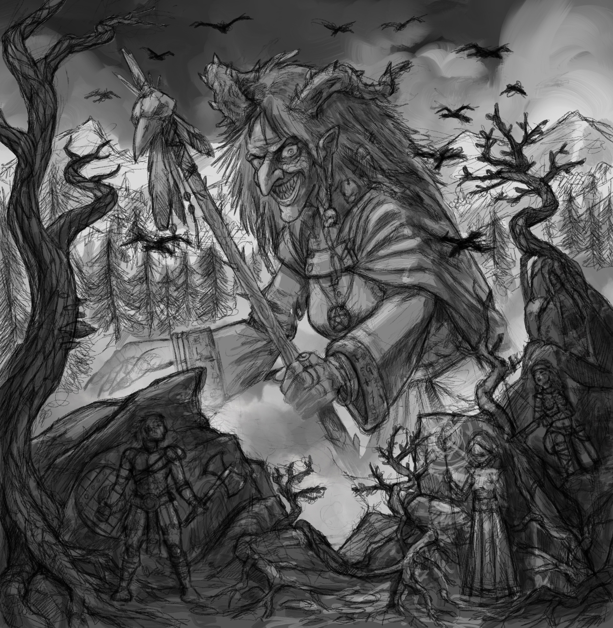 Ce coup ci je m’applique à faire le challenge correctement, j’ai même pris des jours de repos pour ça. J’essai de réaliser une image sans rentrer dans une histoire compliquée. J’essai juste de me faire plaisir et ce qui me plait le plus ce sont les illustrations à « l’ancienne » , je pense à Elmore, Paul Bonner, Ciruelo, Parkinson etc … c’est simple : des aventuriers et un grand méchant.