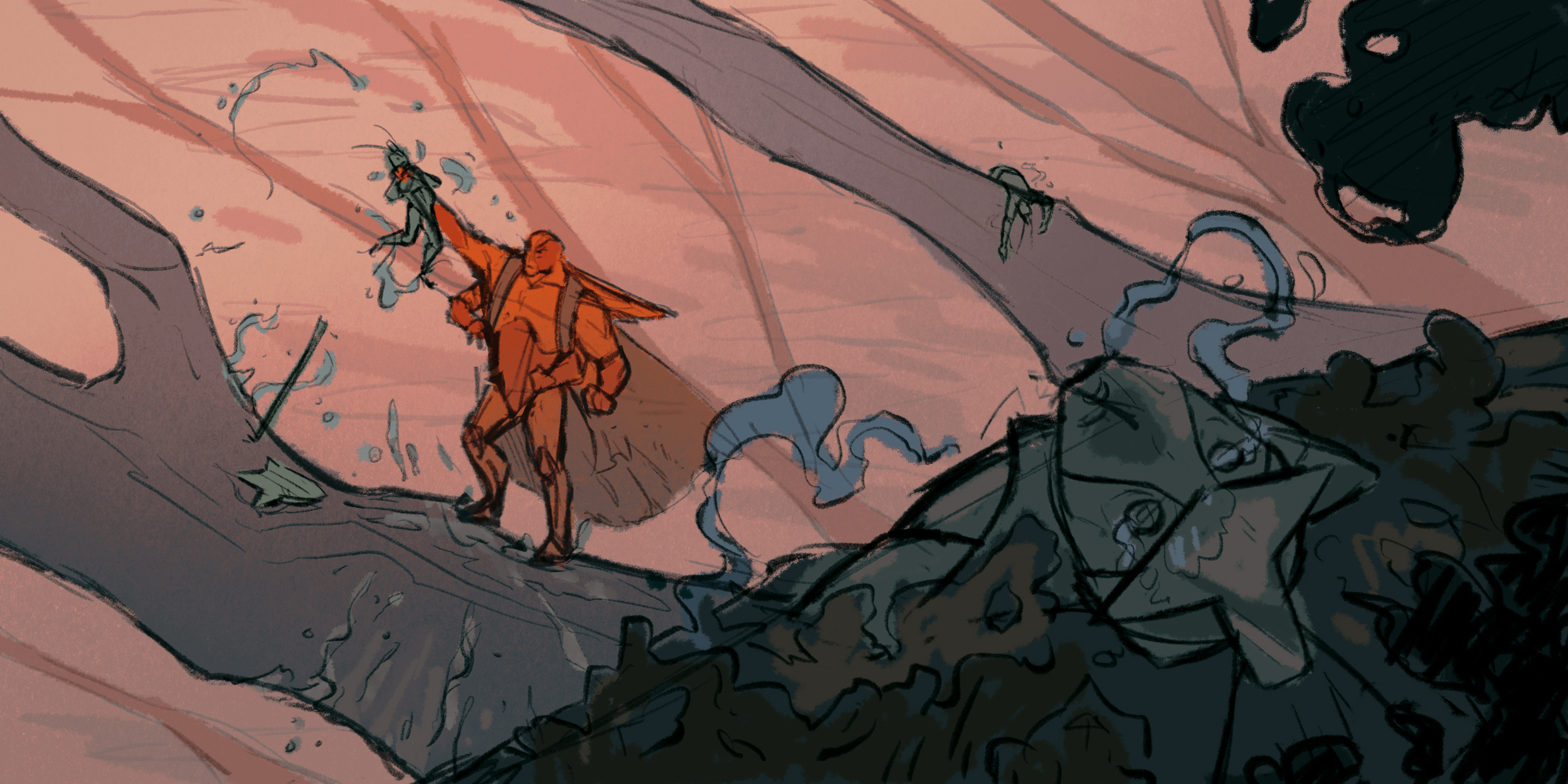 Bonjour tout le monde ! Voilà bien des années que je n'ai pas écrit dans un forum haha ! Le challenge va me permettre de développer un univers que j'ai créé pour une potentielle BD. Je n'ai jamais le temps de me pencher dessus alors c'est l'occasion ! J'ai plusieurs idées, mais on va déjà commencer avec une, on verra après ! 😂 Ca se passe dans un monde d'insectes, où le grand méchant est inspiré d'un aoutat (une sorte de minuscule araignée rouge on va dire). Ici les soldats sont inspirés de punaises vertes. Je pense que cette illu pourra passer pour la Bataille #1 en fait, parce qu'il utilise son arme ultime, son pouvoir : la moisissure et la décomposition (basé sur toutes sortes de lichen) Donc j'ai fait un thumbnail en niveau de gris pour me donner une idée très rapide de la composition, puis j'ai fait un colorscript sur mon brouillon pour me donner une idée de l'ambiance générale. Voilà ! 😁 (en vrai j'ai déjà quasiment fini cette illu mais j'ai pas eu le réflexe de poster mes wip 😳)