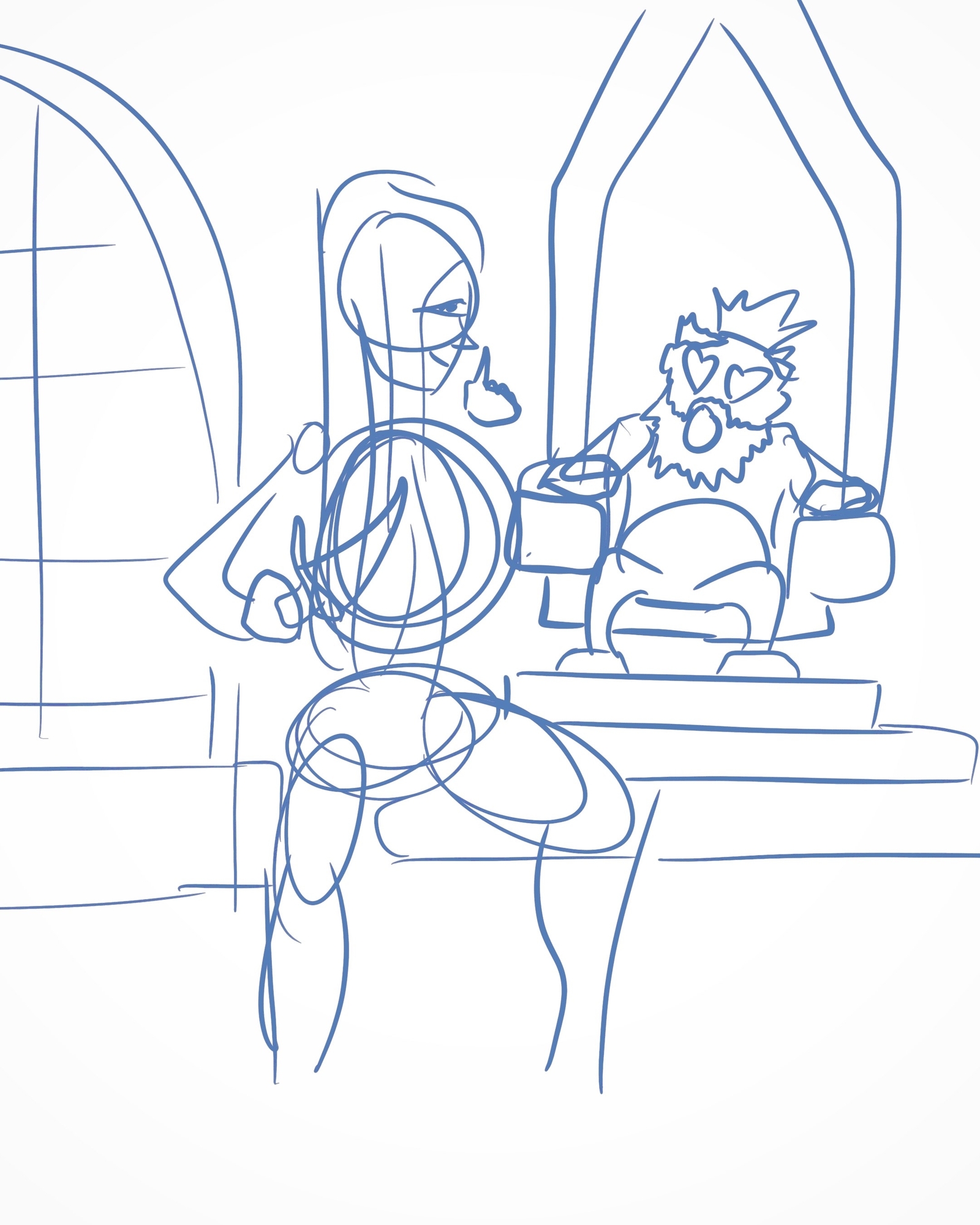 pour la première bataille j ai opté pour le DARK. Je ne me voyais pas faire une arme du style d'une arme a feu ou un sort. Je me suis donc rabattue sur un vision plus moderne d'une arme qui n'est pas forcément un objet. Ici on vois mon process du tout premier sketch très rapide jusqu'aux aplats ce qui vous permet de voir comment j'ai fait pour le personnage principale qui est l'arme qui bouleversera l'issue de la guerre entre light and dark ci dessus le premier sketch ici c'est une le premier encrage qui me plait vraiment. Les premières itérations du sujet 8 n'étaient pas très glorieuses. Voici la line final (désolé pour la qualité elle s est fait compressé comme pas possible) Et finalement les aplats qui permettent de se rendre compte de comment sera l'illu finale. (PS: j'ai pas eu le réflexe de sauvegarder les étapes pour le roi ou le fond 😞 ) -