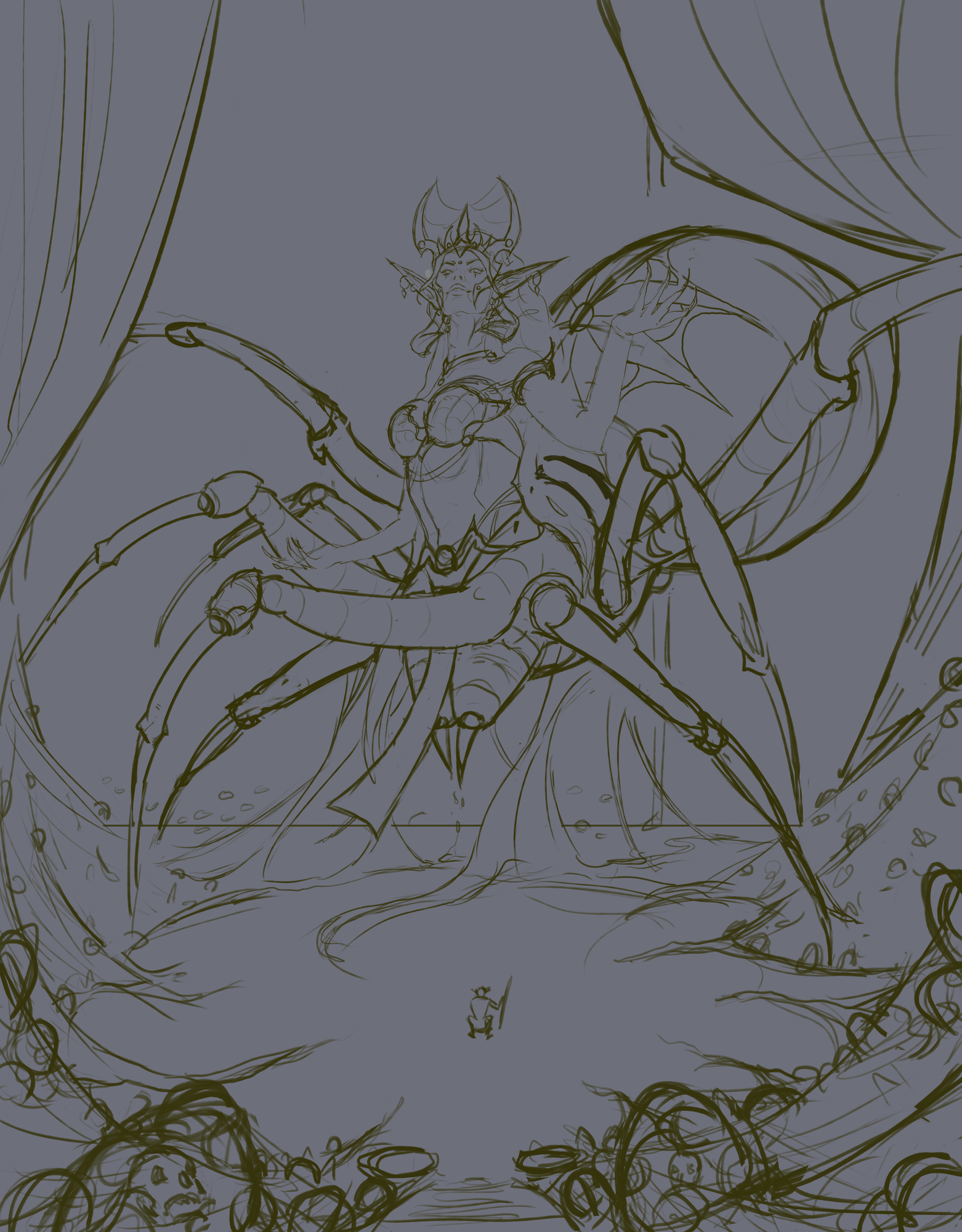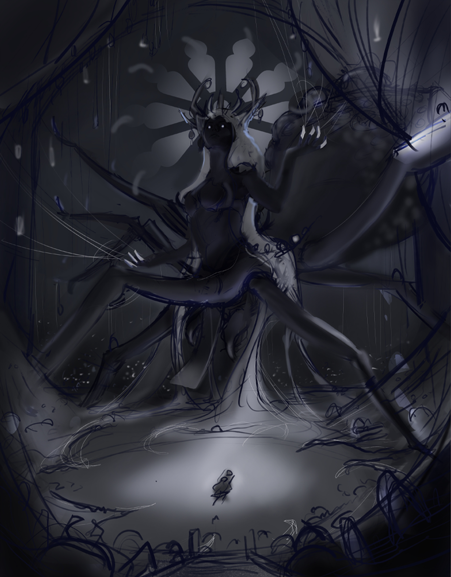 Voilà mon WIP (in extremis comme d'habitude)! Je me suis éclatée à bosser dessus — et heureusement que je ne suis pas arachnophobe 😅 J’ai toujours été fascinée par la mythologie des drows, alors quoi de plus fun (et un peu effrayant) que de représenter leur déesse maléfique ? L'idée a un peu évolué entre les différentes étapes ! Mais l'idée de la puissance écrasante de la déesse a été mon fil conducteur ! J’espère que ça vous plaira autant que j’ai pris plaisir à le créer 🕷️ Sinistrale