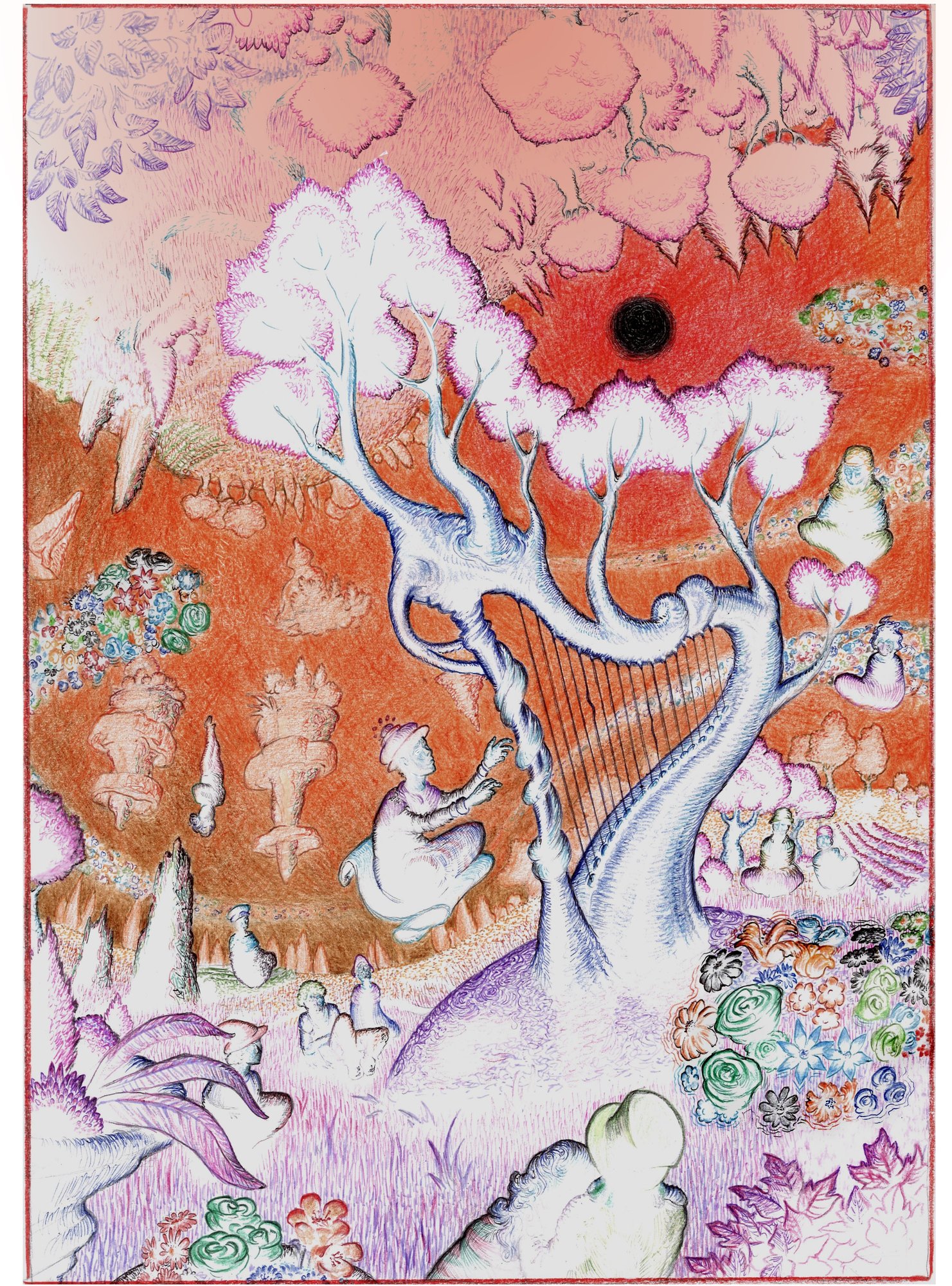 Ce dessin représente l'Harbre de l'université de Grondark. Il est le résultat en "négatif" du dessin original que voici, réalisé au stylo bille et crayon de couleur sur papier blanc : Je numérise ce premier dessin et le modifie sur GIMP, en inversant les couleurs puis en ajoutant quelques éléments (ici les lucioles) C'est une technique personnelle qui me permet entre autre d'obtenir de belles lumières.